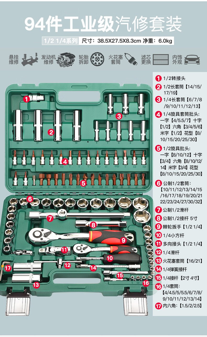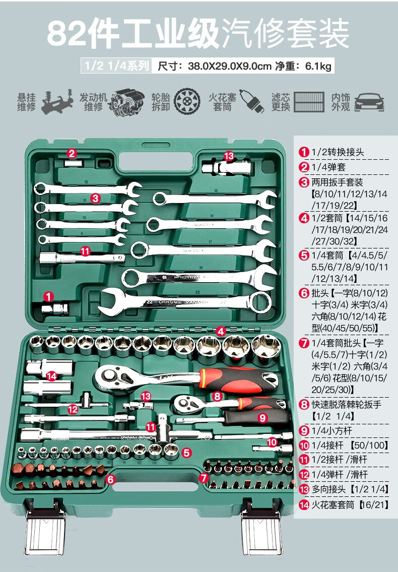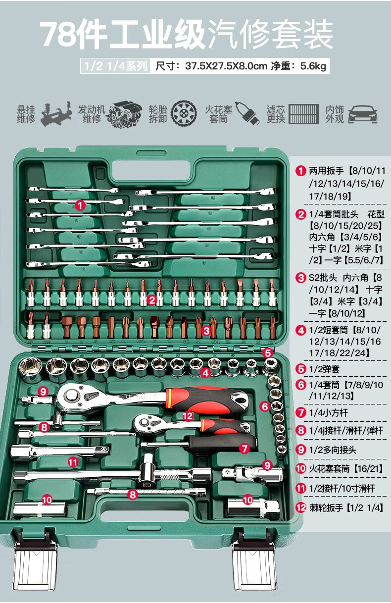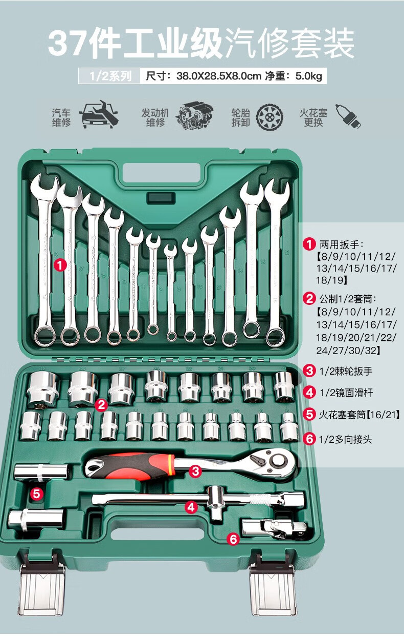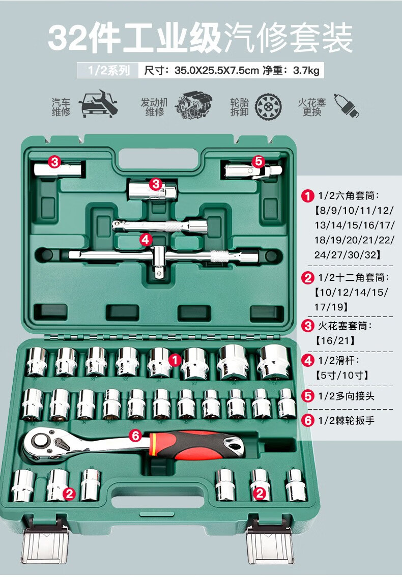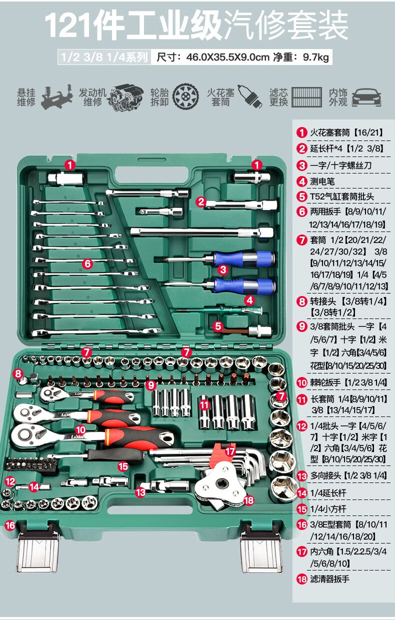 艾瑞泽汽修工具套装套筒扳手棘轮汽车维修组合修车工具箱工业级小飞 直柄经济款46件套