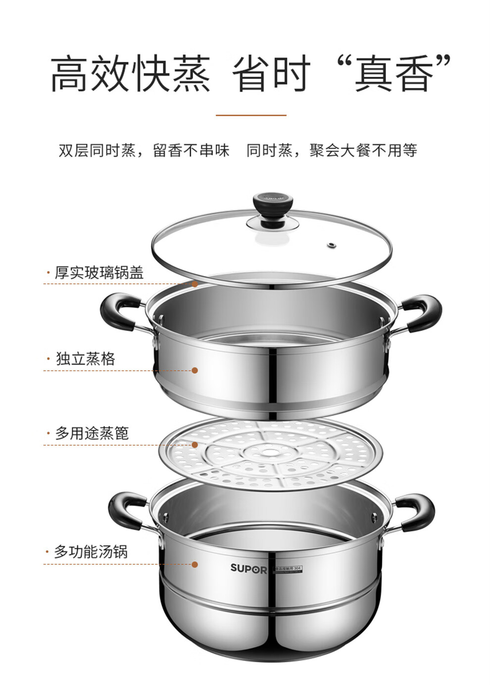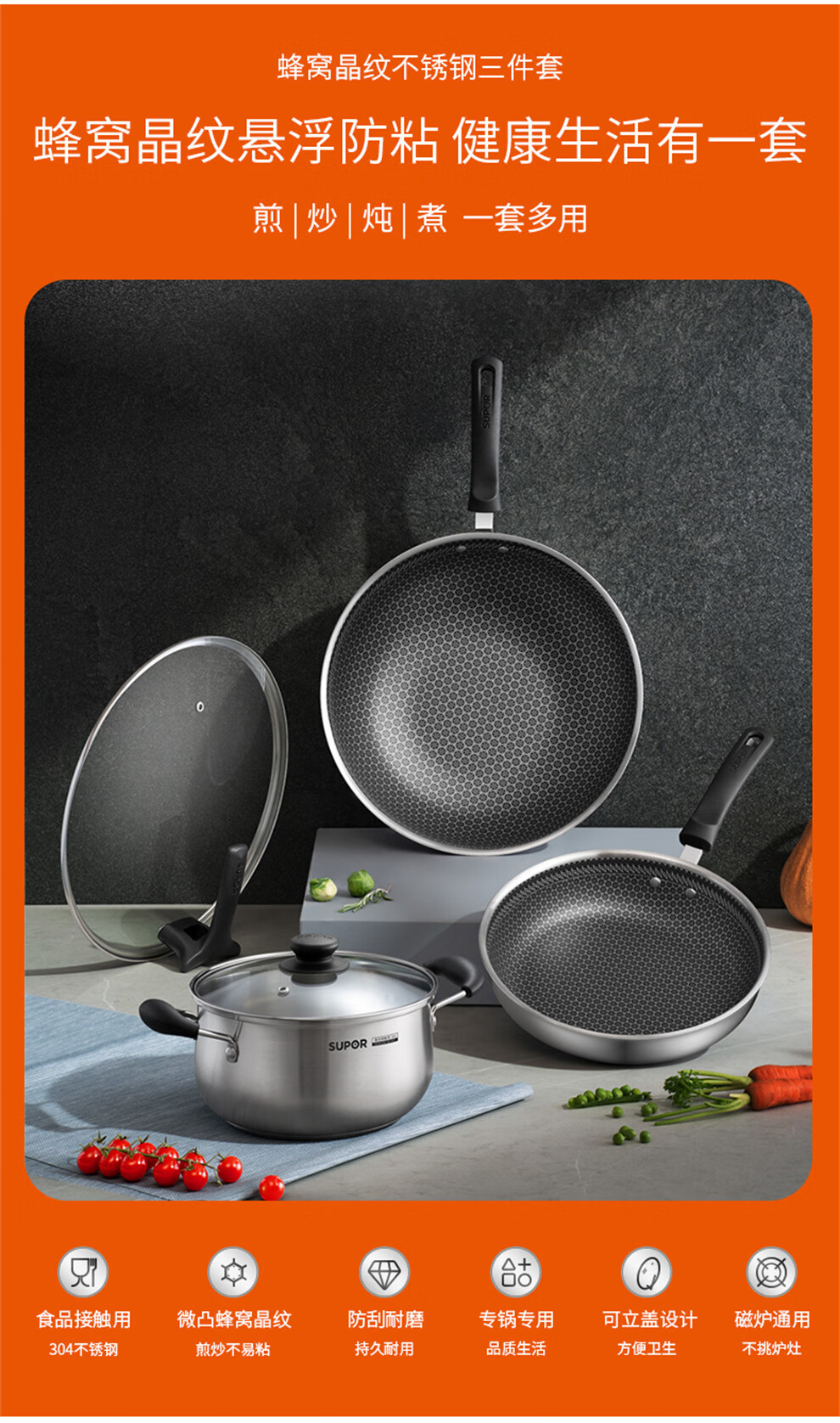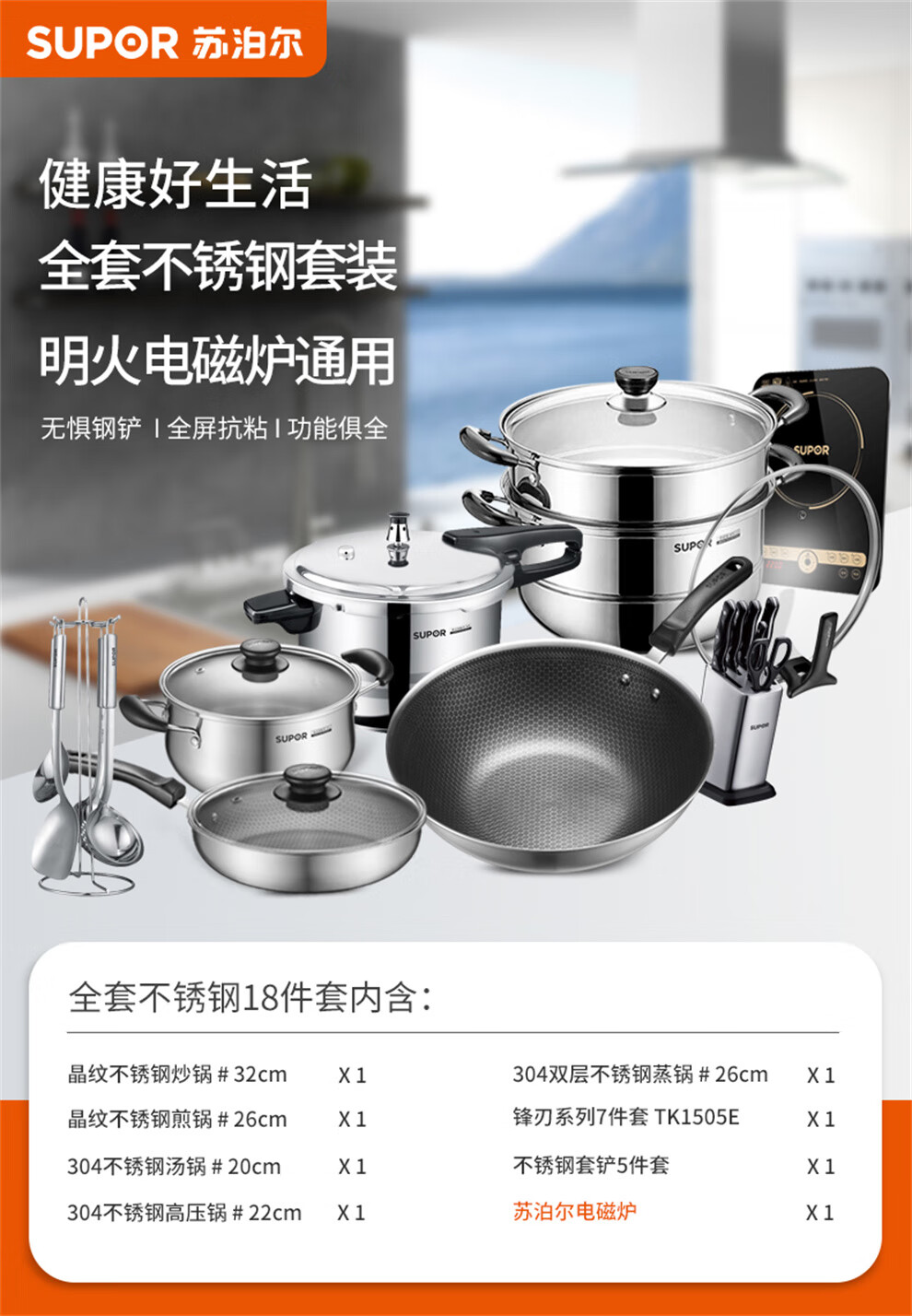 SUPOR pot set, food-grade stainless steel kitchenware set, wok, non-stick wok, frying pan, soup pot, steamer, pressure cooker, high-quality stainless steel non-stick combination, 17-piece set