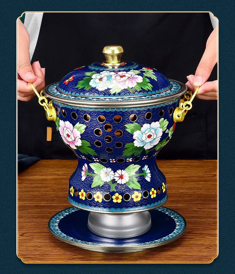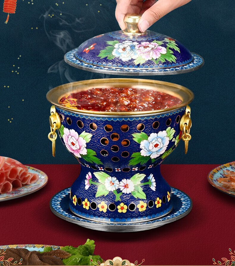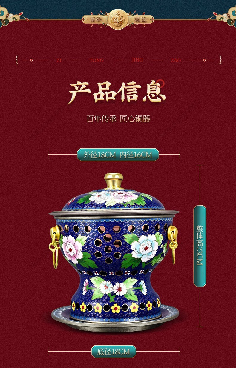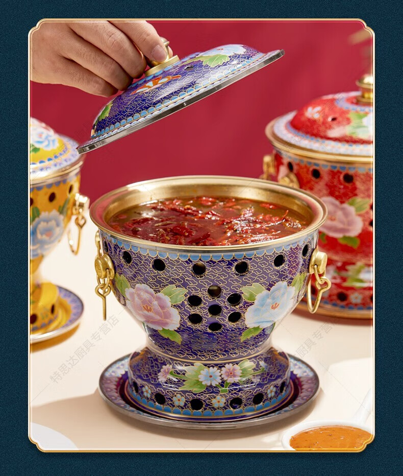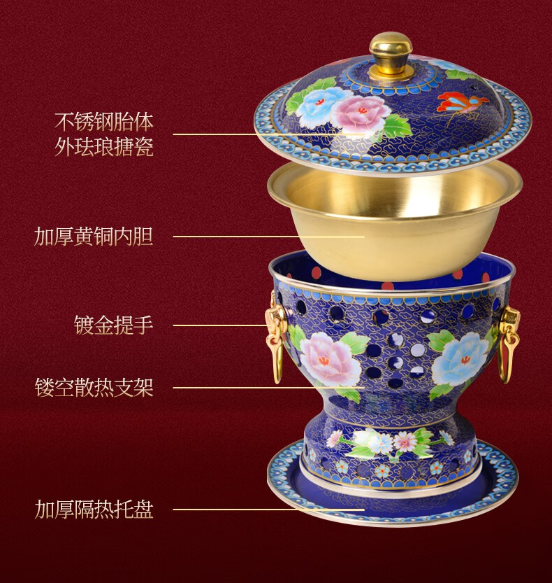 Zhihui New Cloisonné Blue Copper Hot Pot Single Household Enamel Small Hot Pot Old Beijing Sour Soup Fatty Beef Alcohol Stove Hot Pot Flowers Bloom and Wealth-Blue丨Brass Liner 18cm One Pot per Person