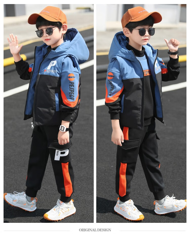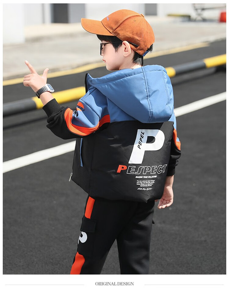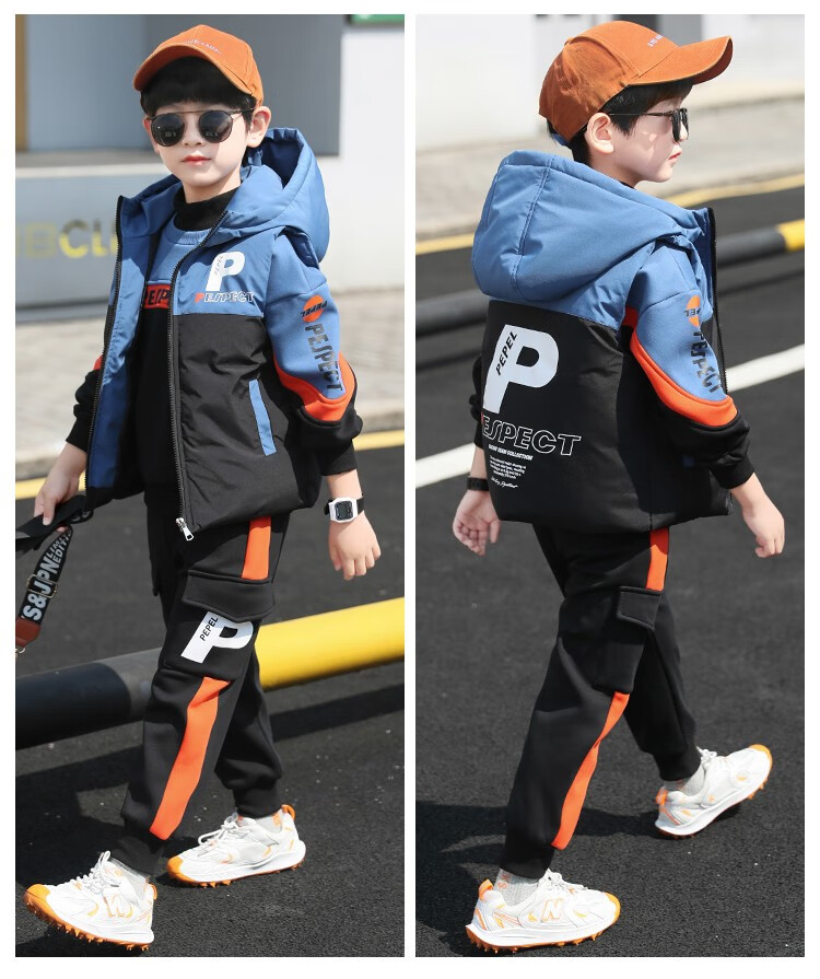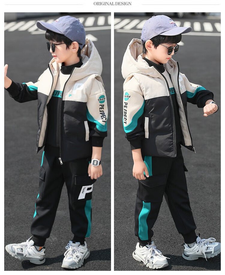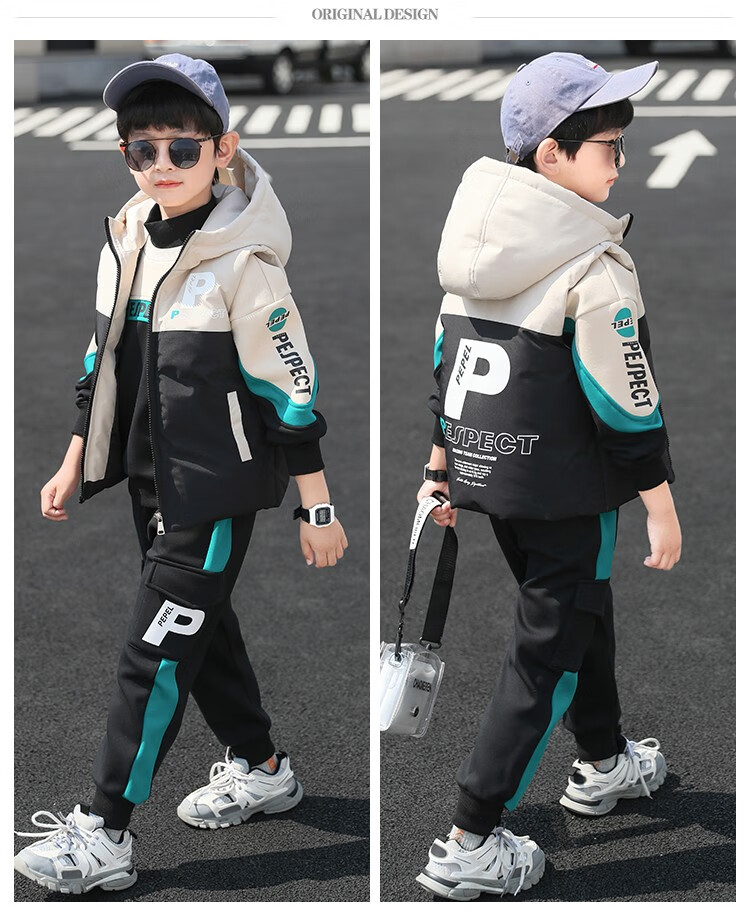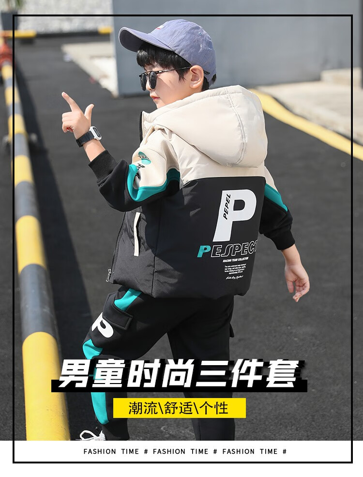 Three-piece set Monkey Brother Children's Clothing Boys' Velvet Suit Winter Clothes New Thickened Medium and Large Children's Winter Vest + Sweatshirt + Casual Pants Boys Student Three-piece Set 3-15 Years Old Trendy Off-White 140 (Recommended Height Around 130CM)