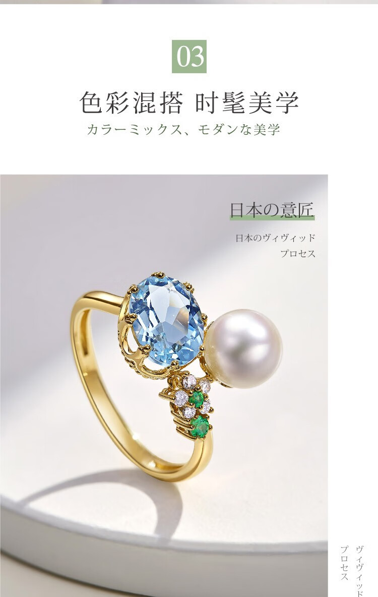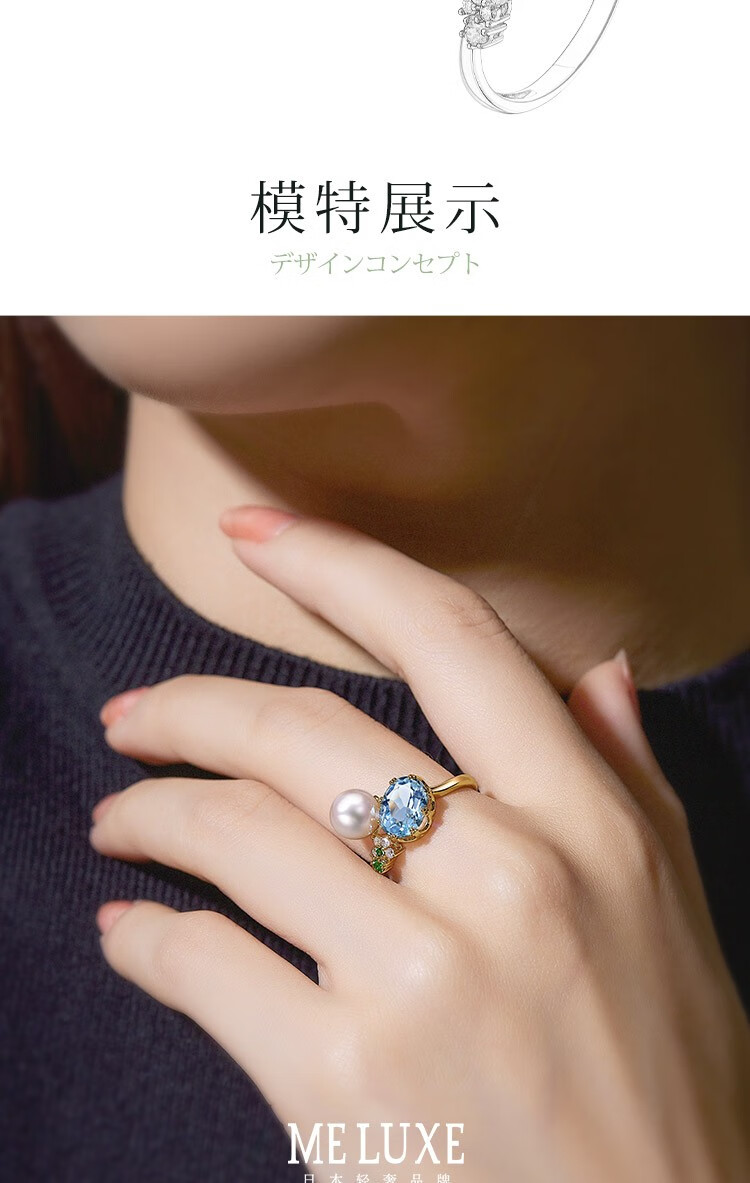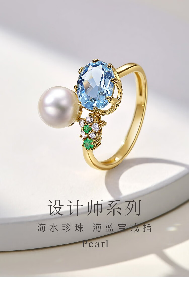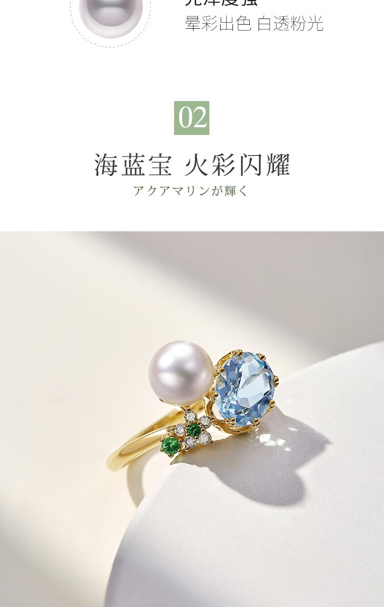 Meluxe18K gold akoya seawater pearl ring women's aquamarine ring designer series Akoya7-7.5mm, side stone 1.72ct