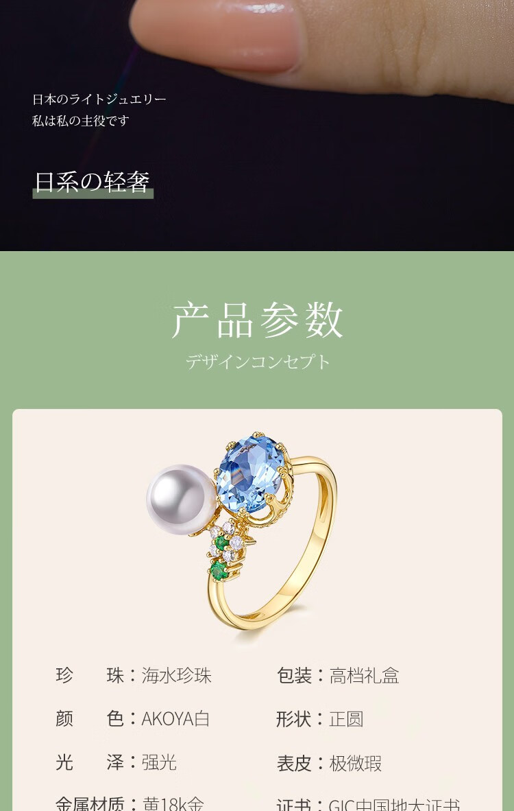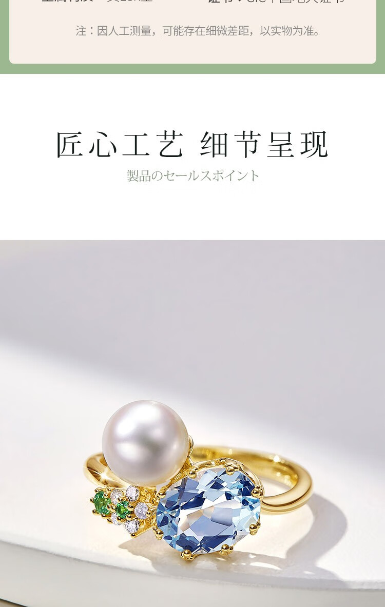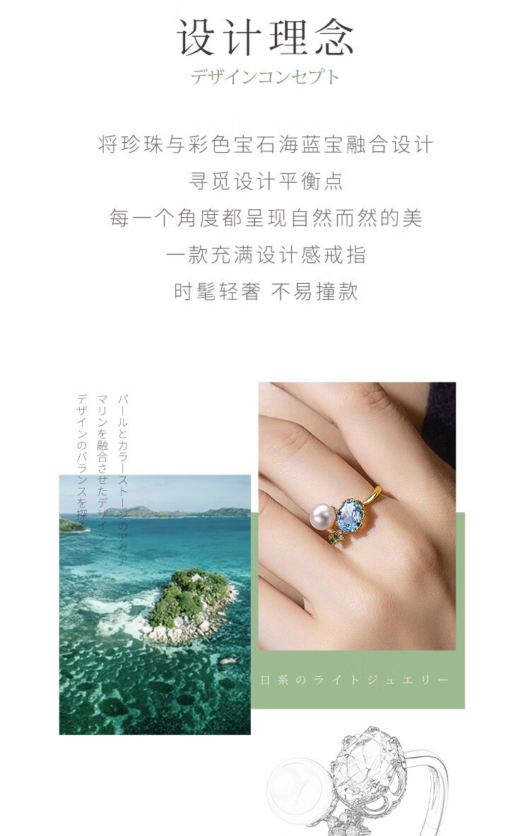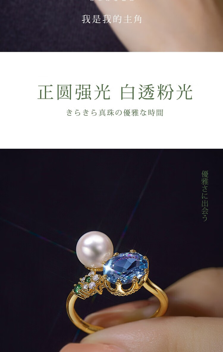 Meluxe18K gold akoya seawater pearl ring women's aquamarine ring designer series Akoya7-7.5mm, side stone 1.72ct