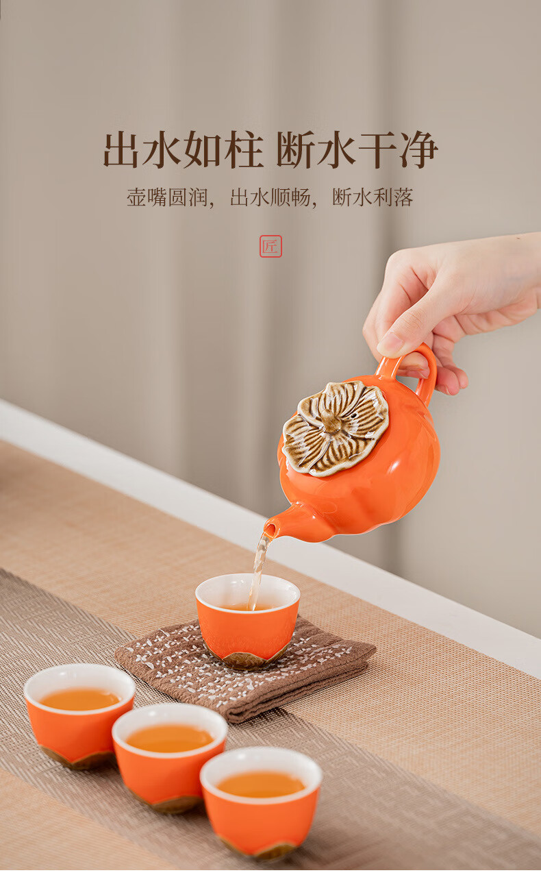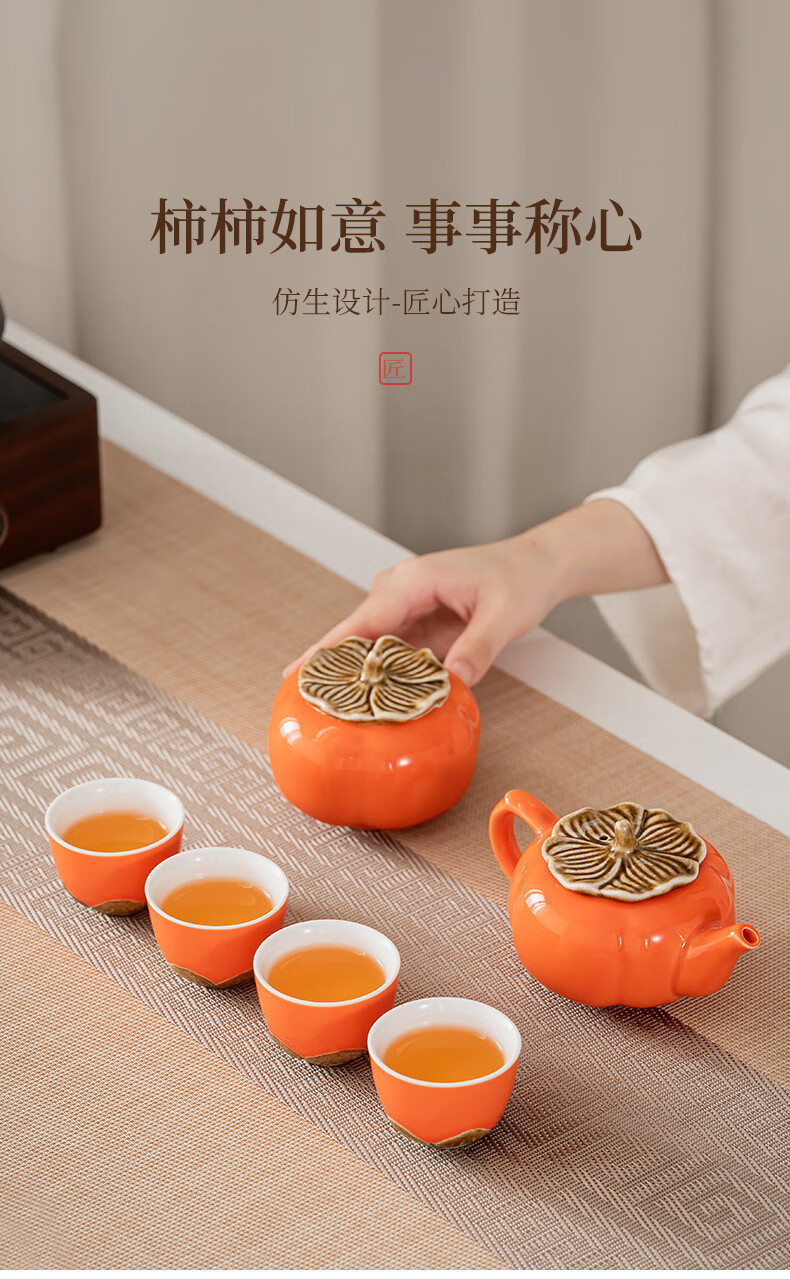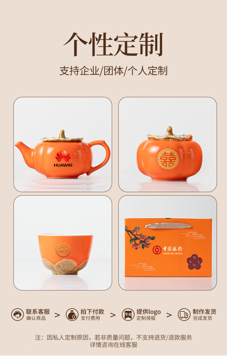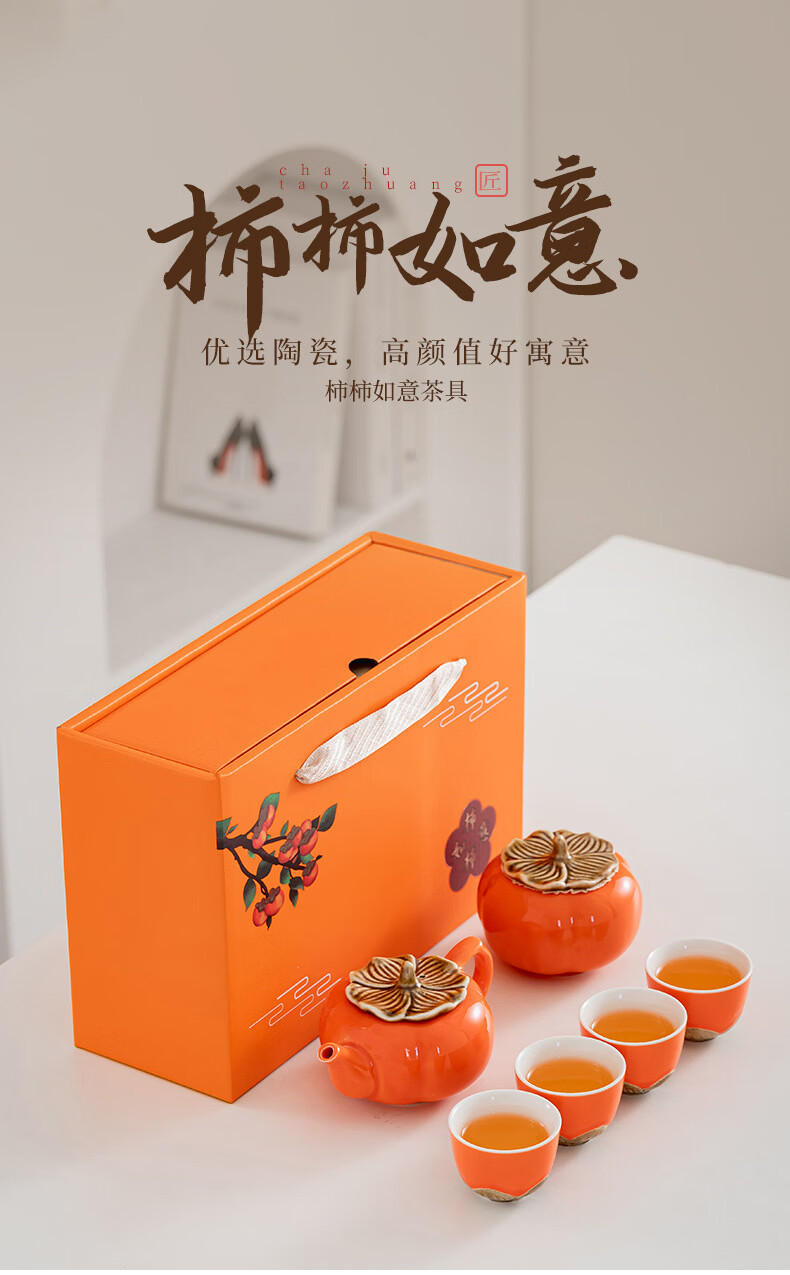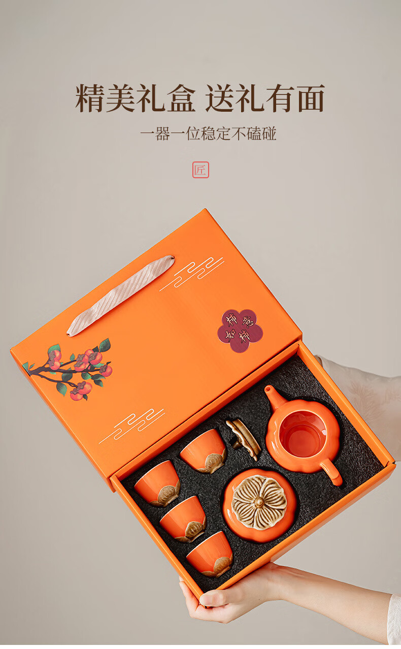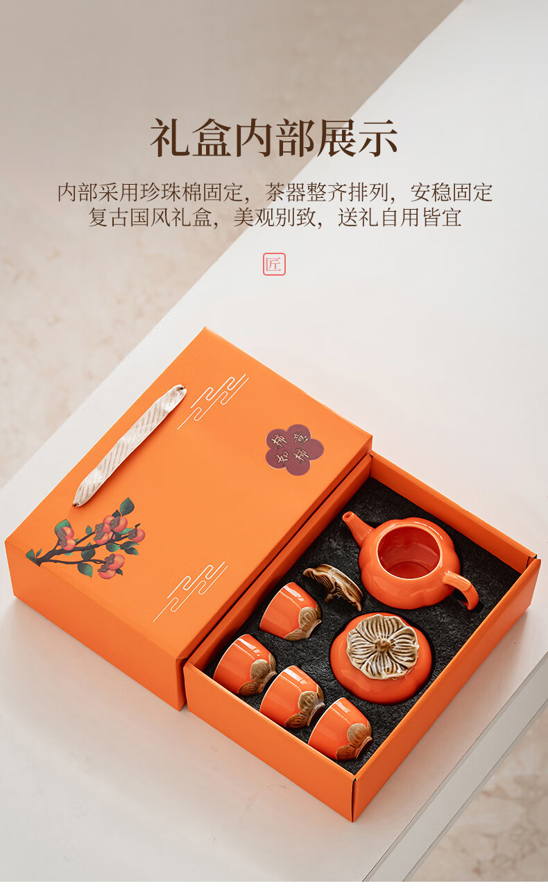 Qianliyuan Company's small gifts for business opening events, customized practical tea sets, annual meeting prizes, and souvenirs for customers. Orange-Persimmon Pot, one pot, four cups + can (orange gift box)
