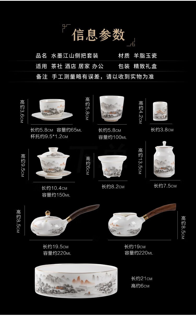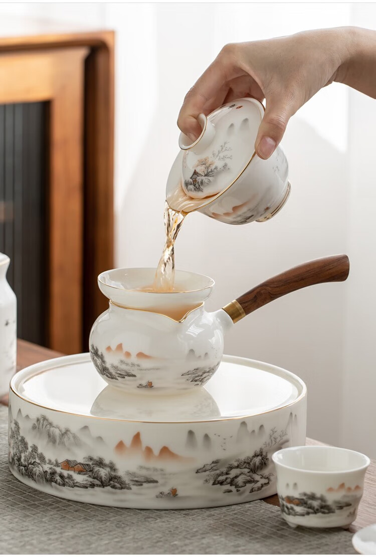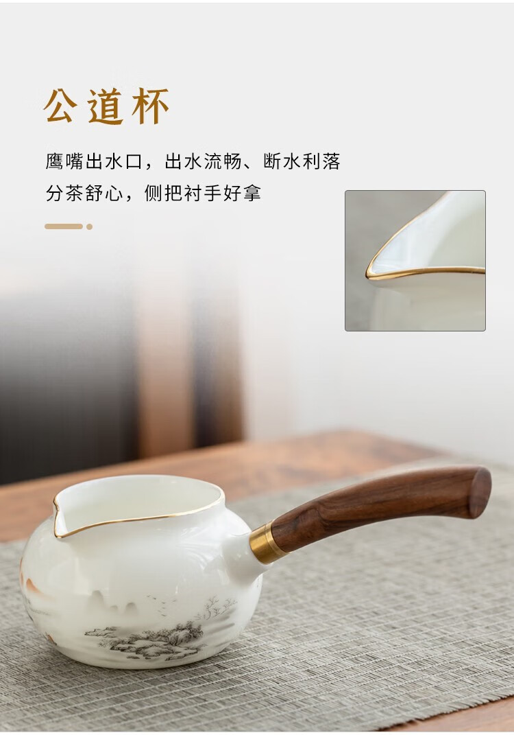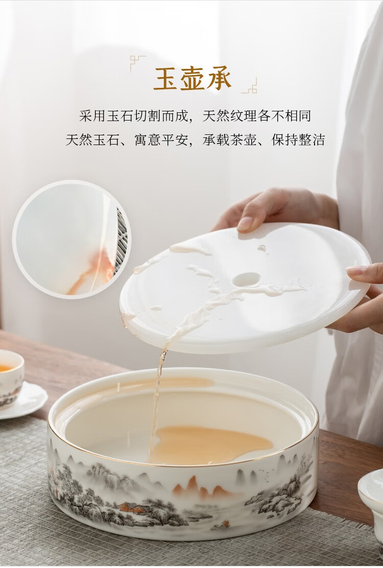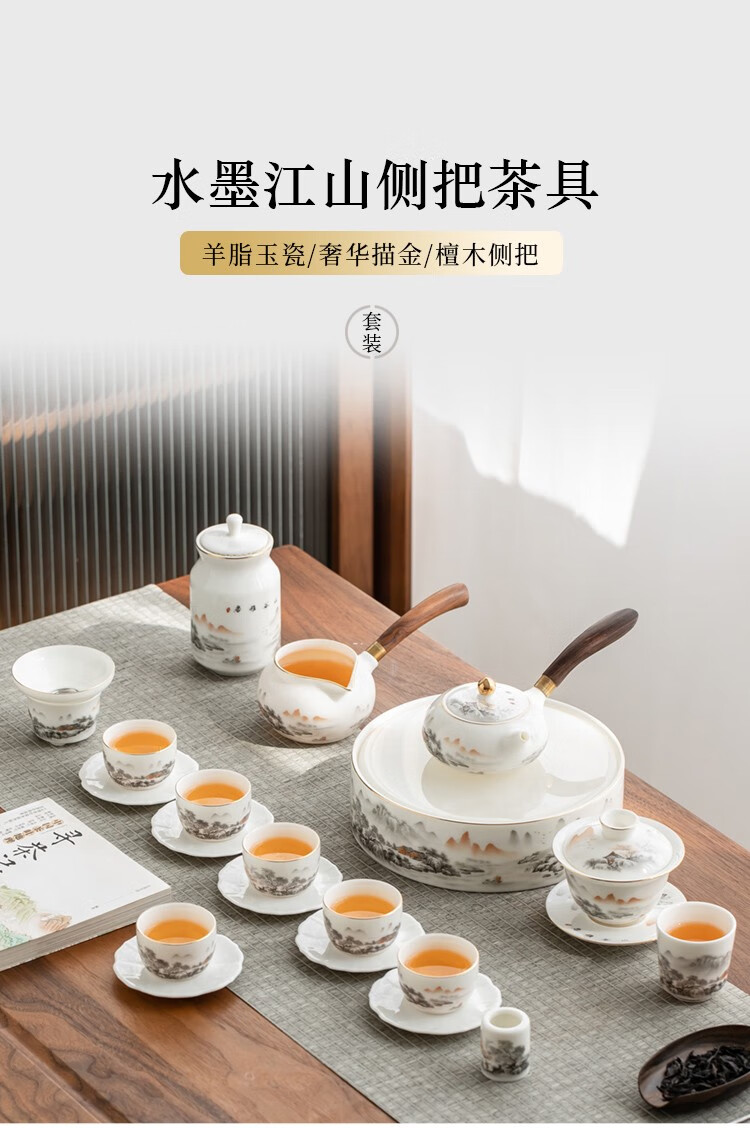 Gold inlaid jade Kung Fu tea set Chinese white mutton fat jade porcelain household ceramics white porcelain tea making set gift gift box ink Jiangshan side handle jade plate mutton fat jade porcelain set