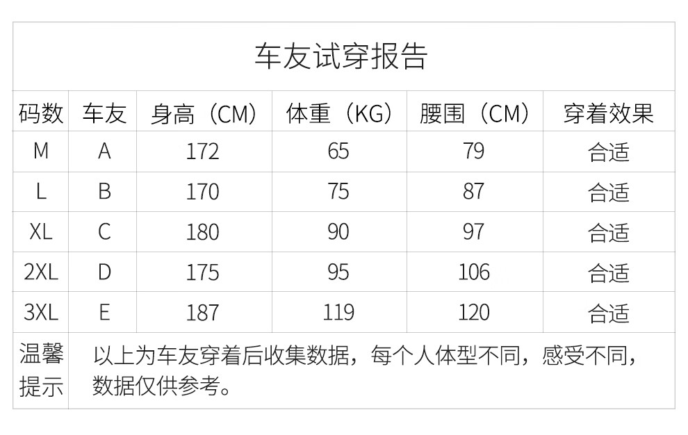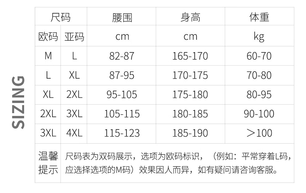 China (cm) 165 / 88-90 170 / 96-98 175 / 108-110 180 / 118-122 185 / 126-130