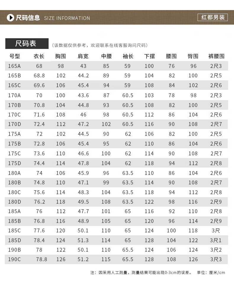 China (cm) 165 / 88-90 170 / 96-98 175 / 108-110 180 / 118-122 185 / 126-130
