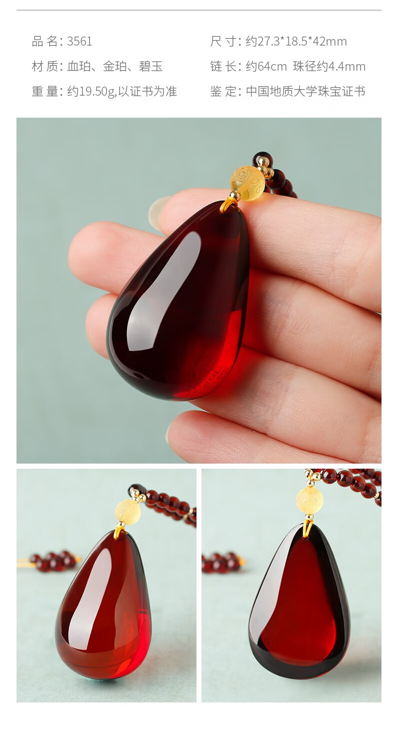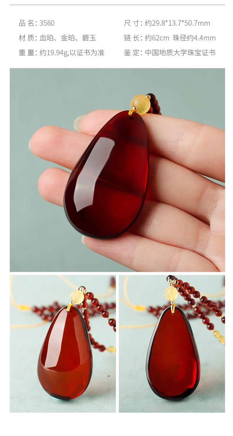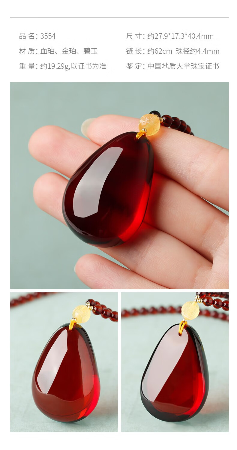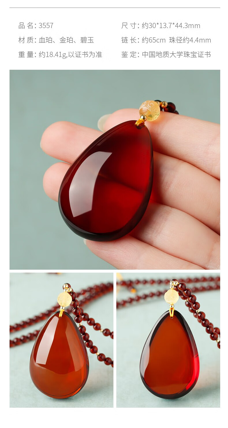 Ancient natural amber beeswax pendant blood amber certificate pendant necklace casual blood amber sweater chain with water drops 7207 about 28.76g about 63.2*34.7