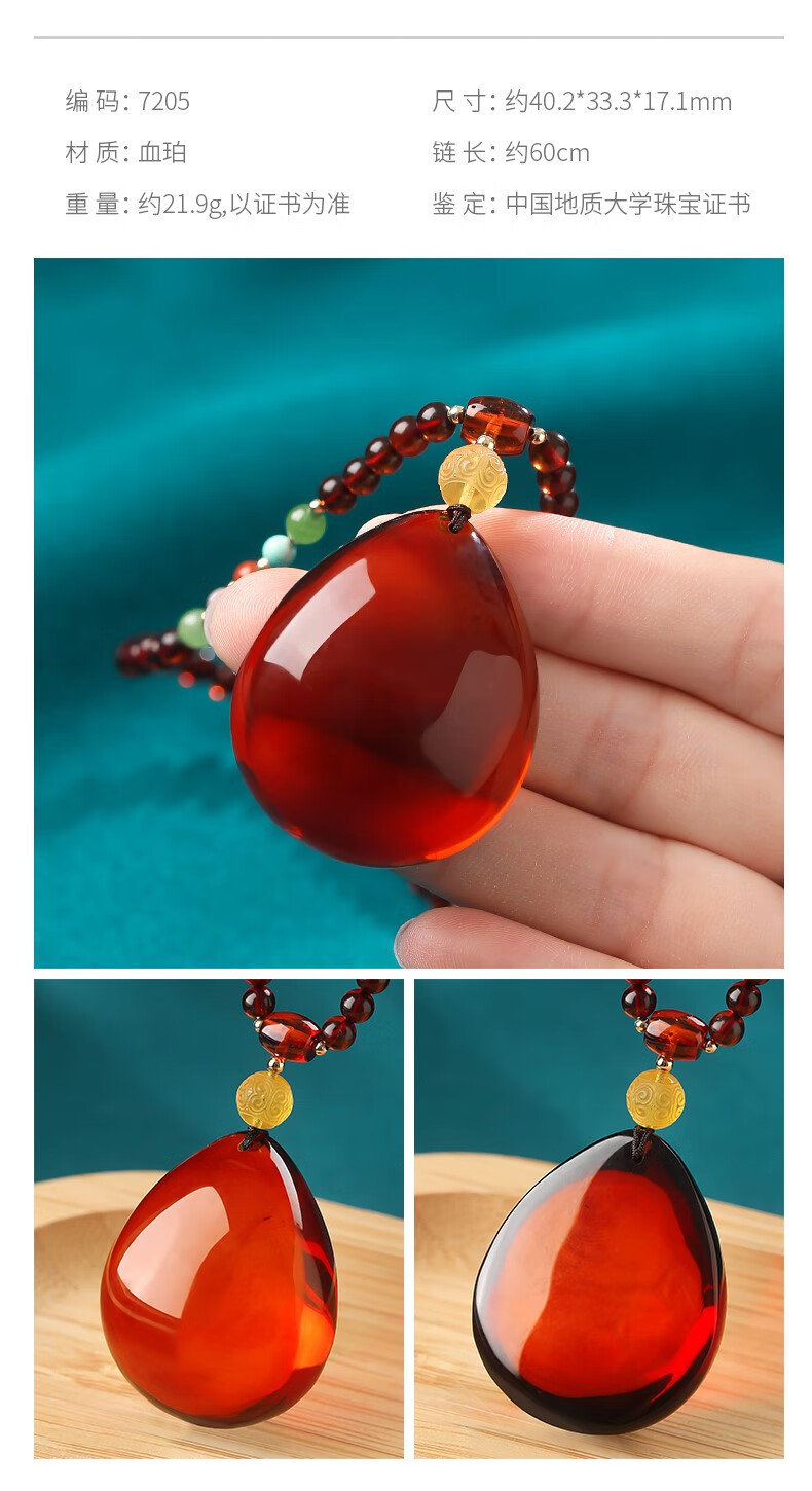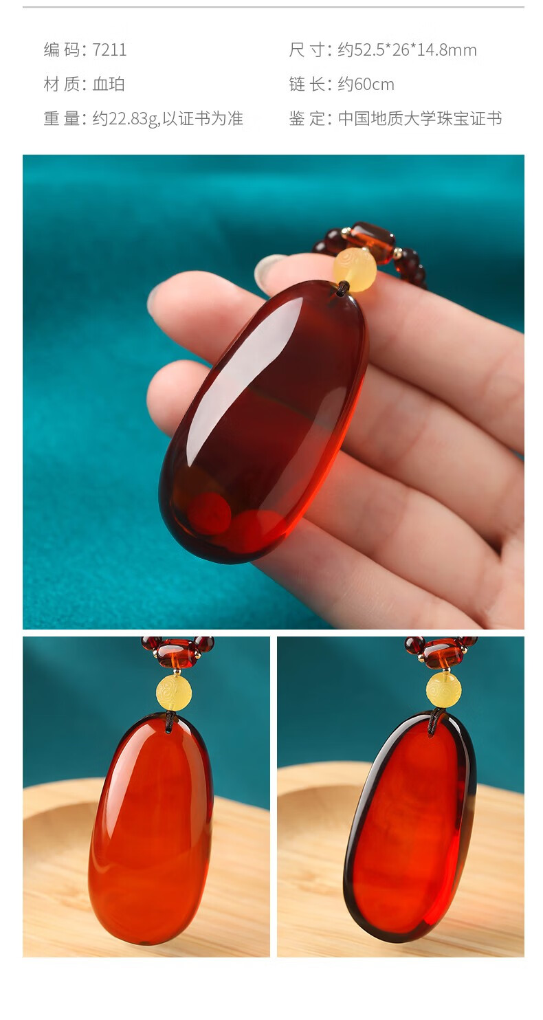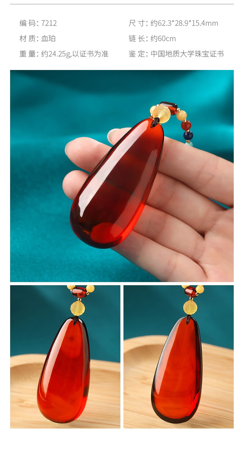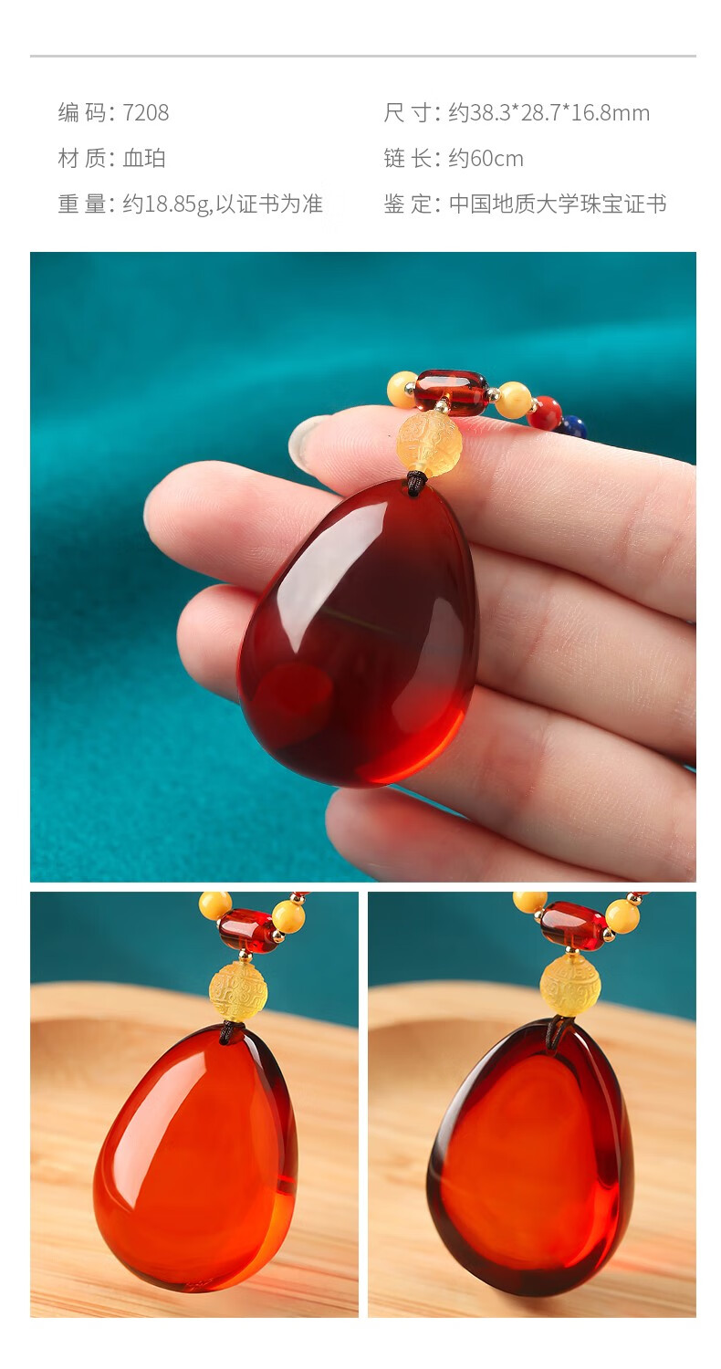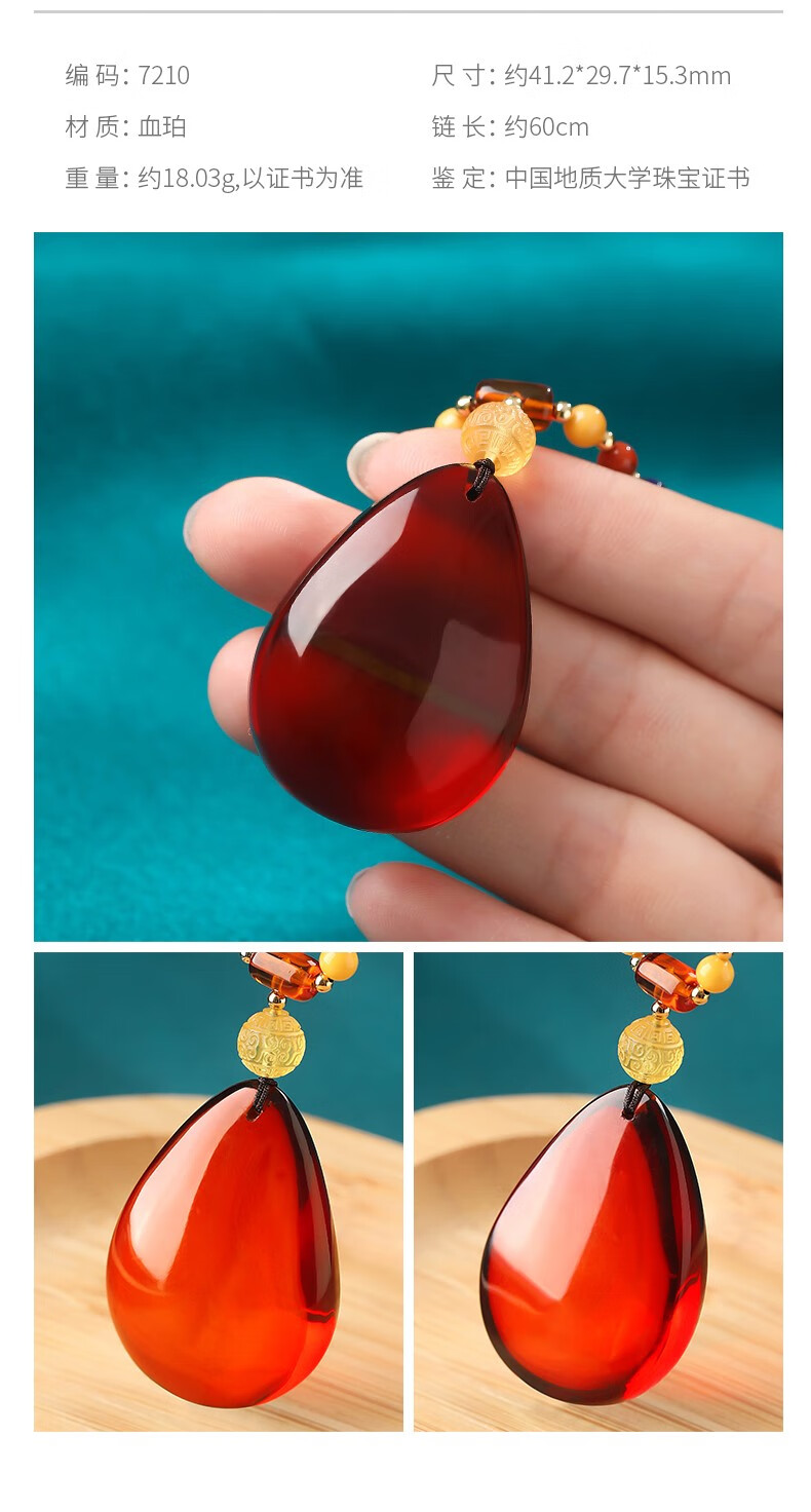 Ancient natural amber beeswax pendant blood amber certificate pendant necklace casual blood amber sweater chain with water drops 7207 about 28.76g about 63.2*34.7