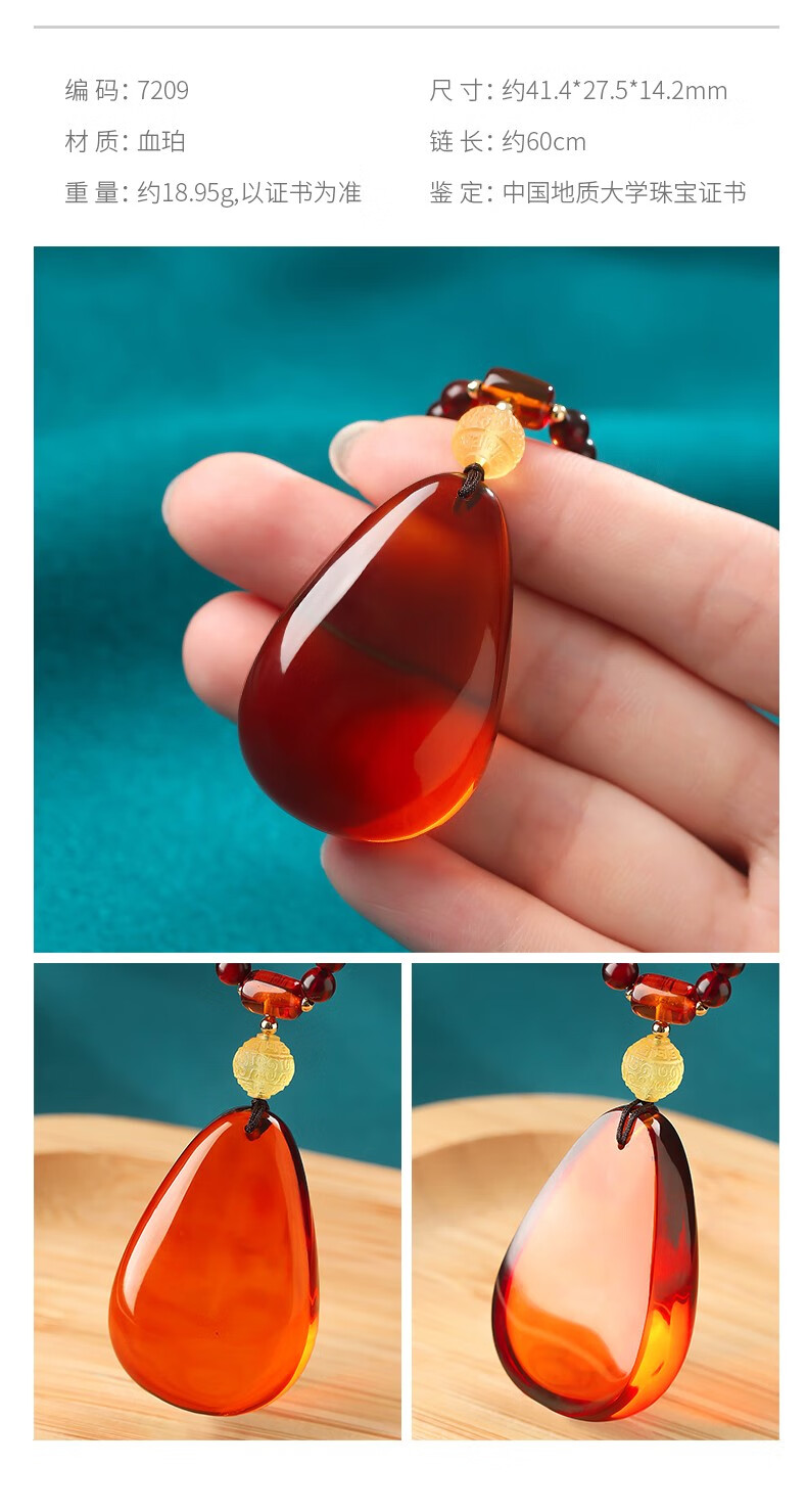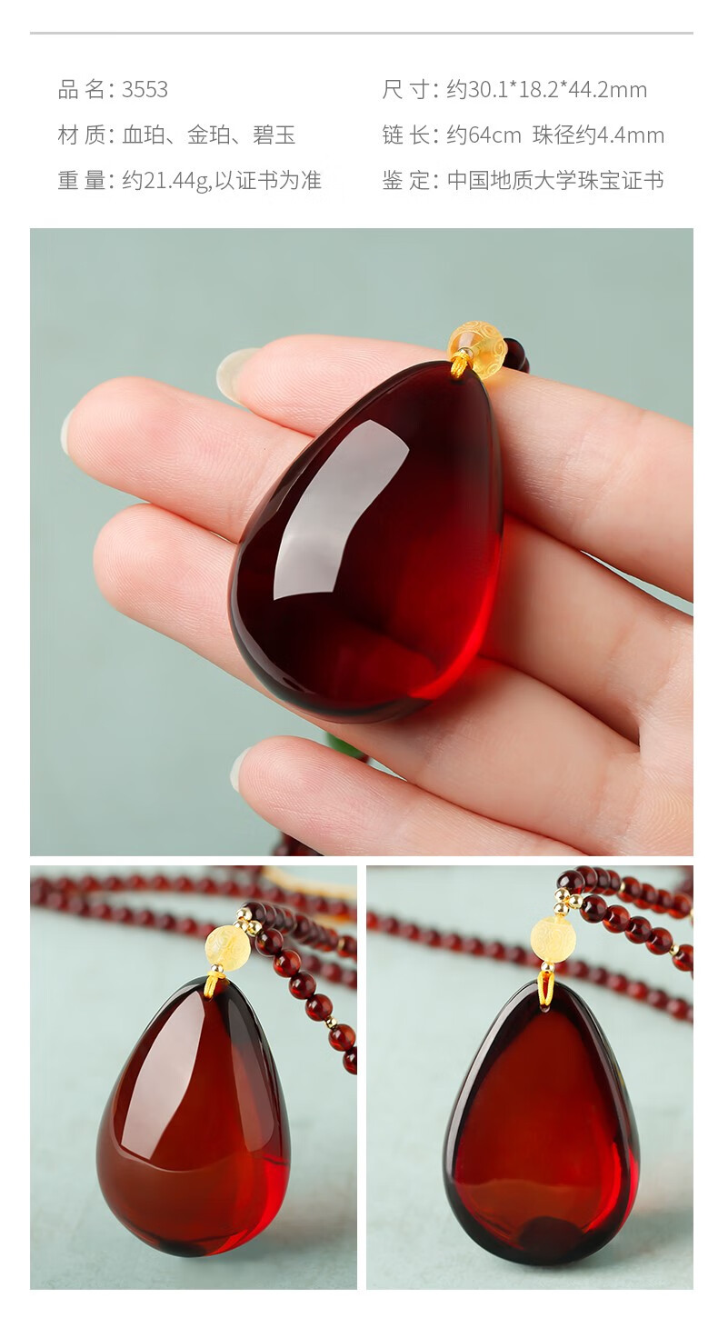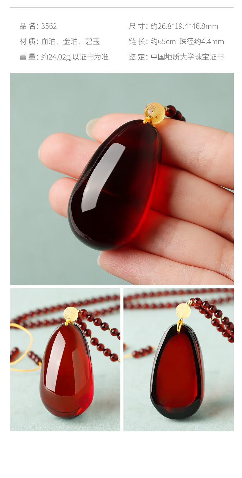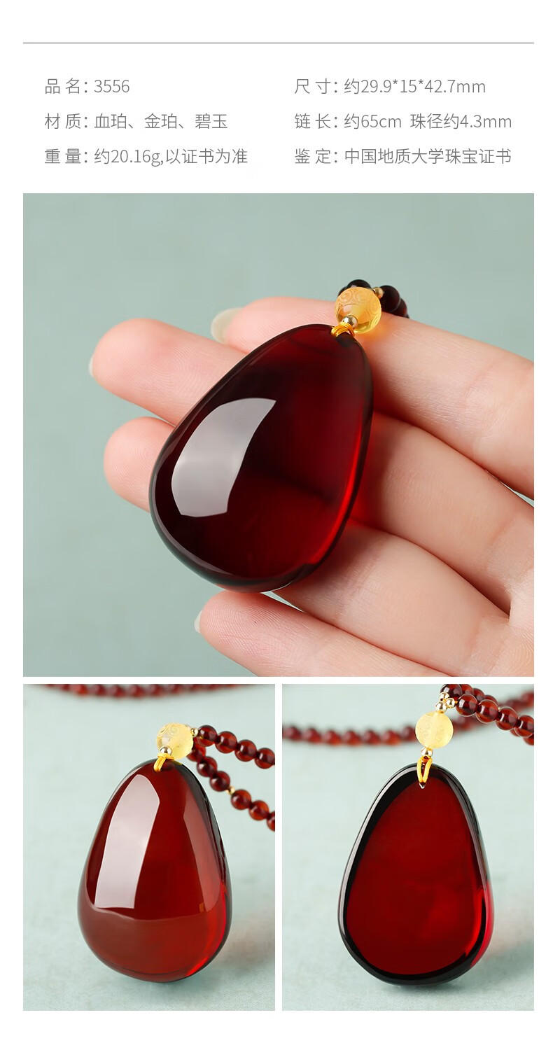Ancient natural amber beeswax pendant blood amber certificate pendant necklace casual blood amber sweater chain with water drops 7207 about 28.76g about 63.2*34.7