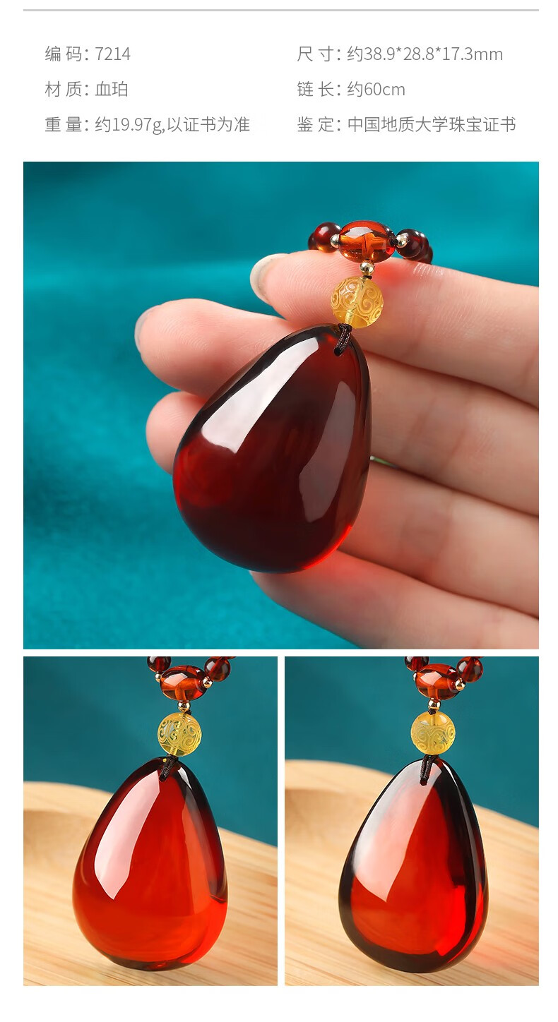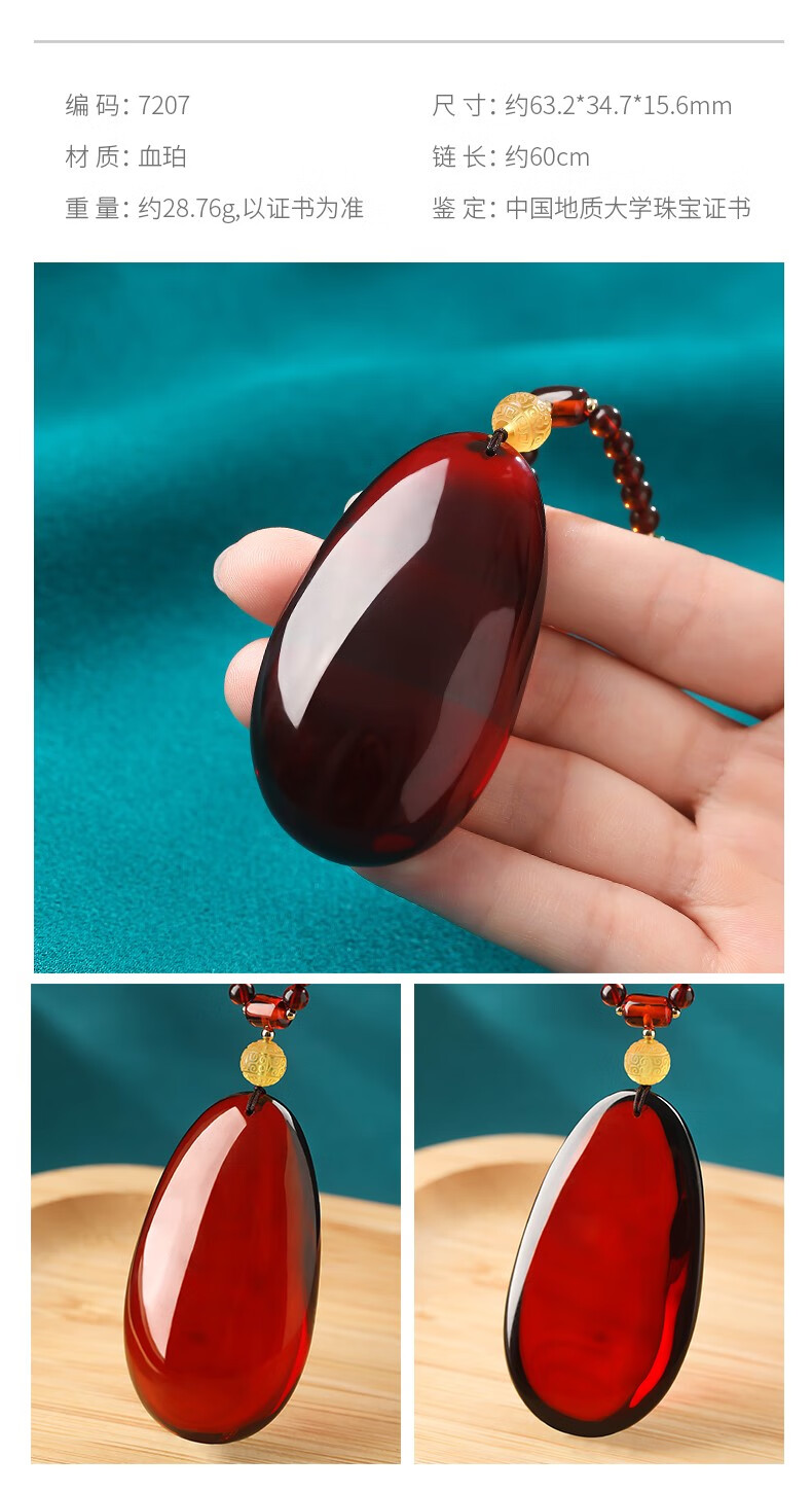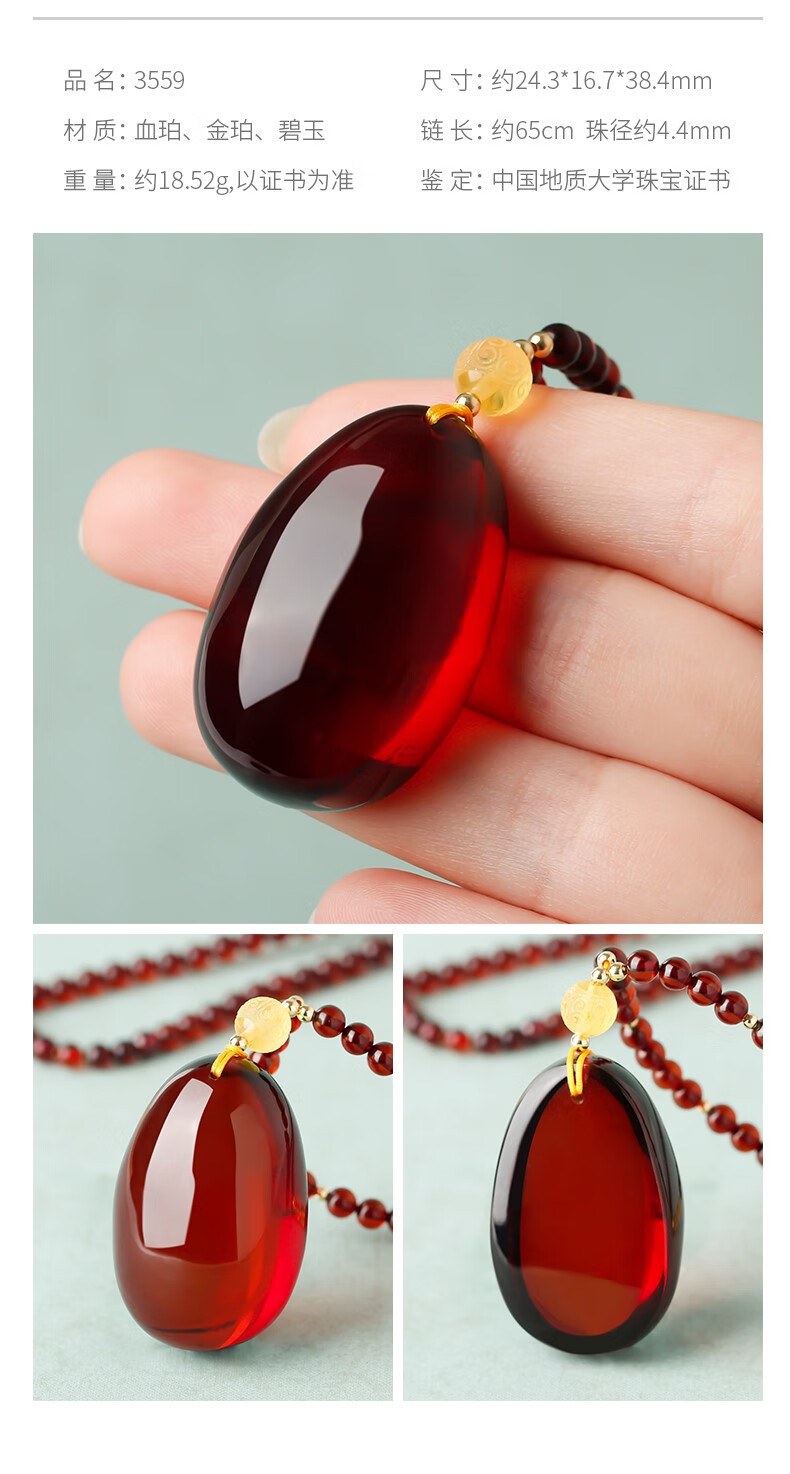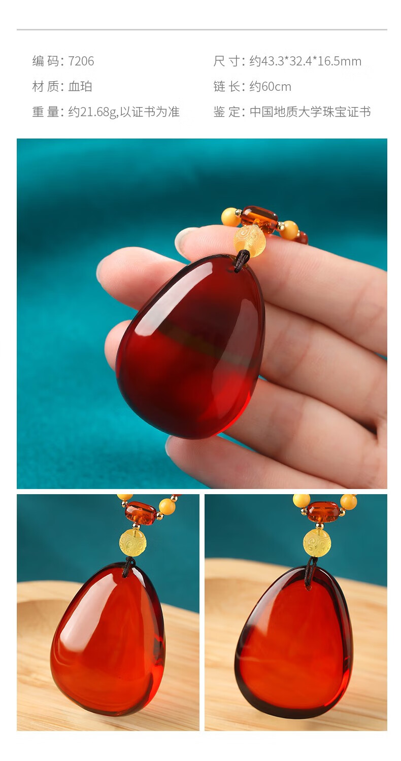 Ancient natural amber beeswax pendant blood amber certificate pendant necklace casual blood amber sweater chain with water drops 7207 about 28.76g about 63.2*34.7