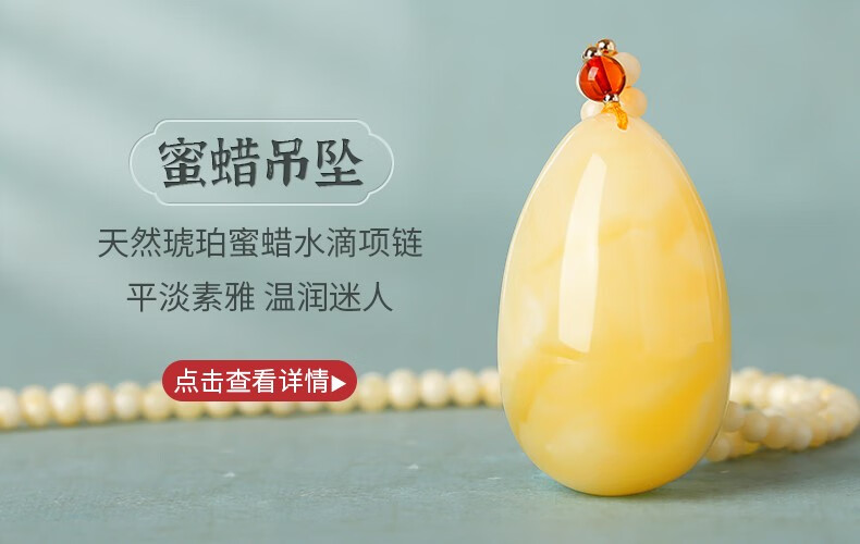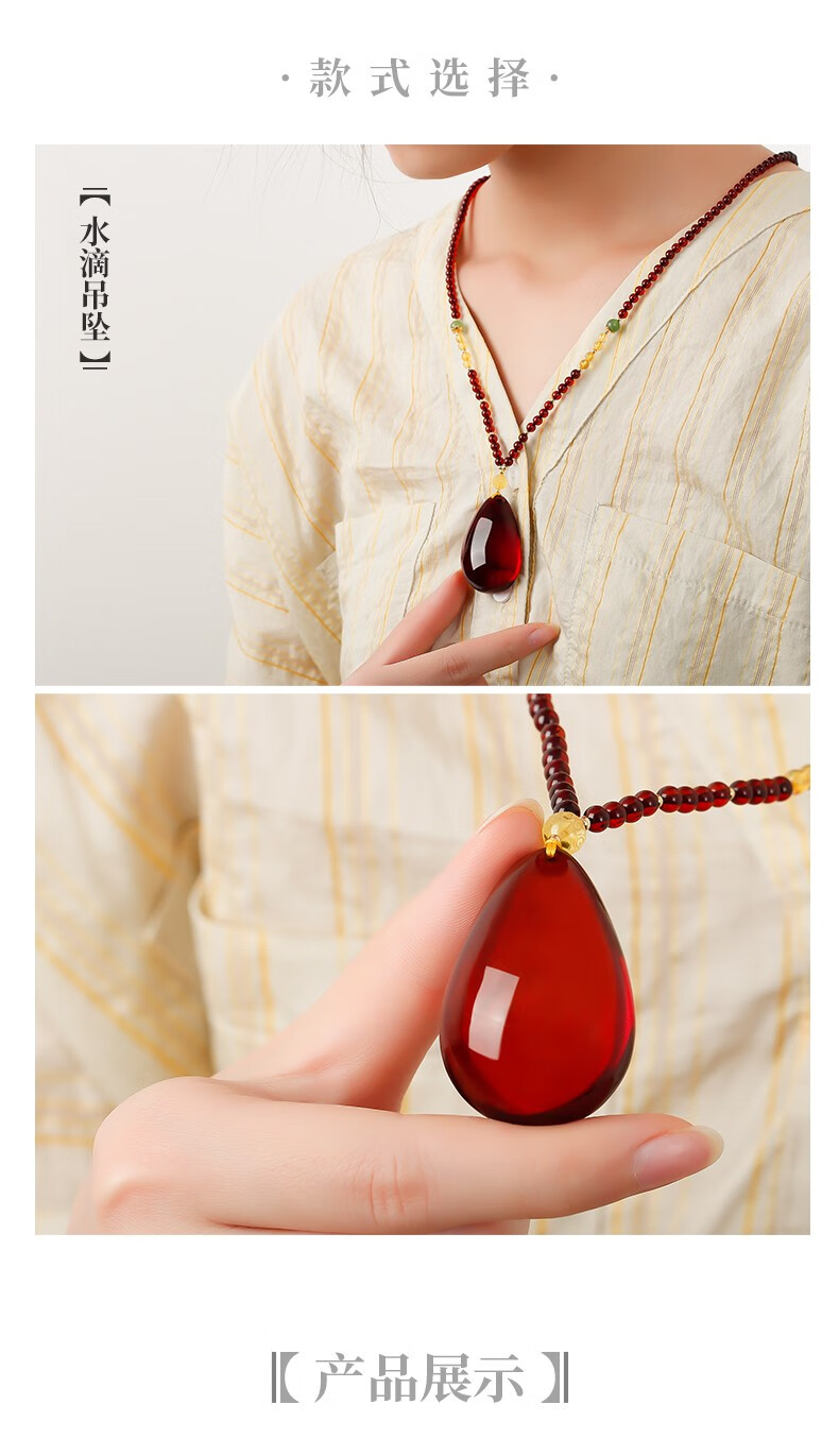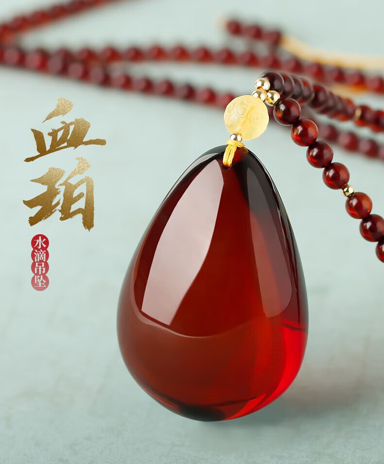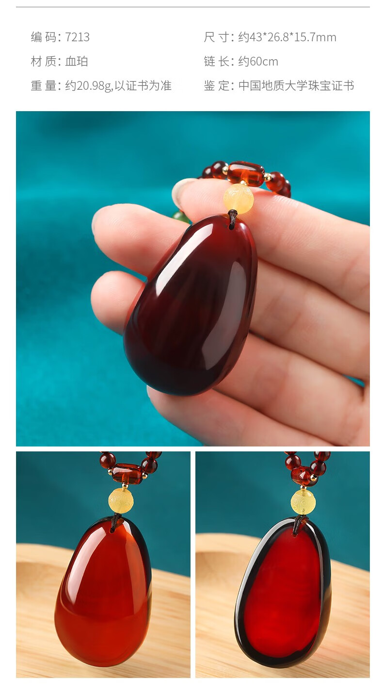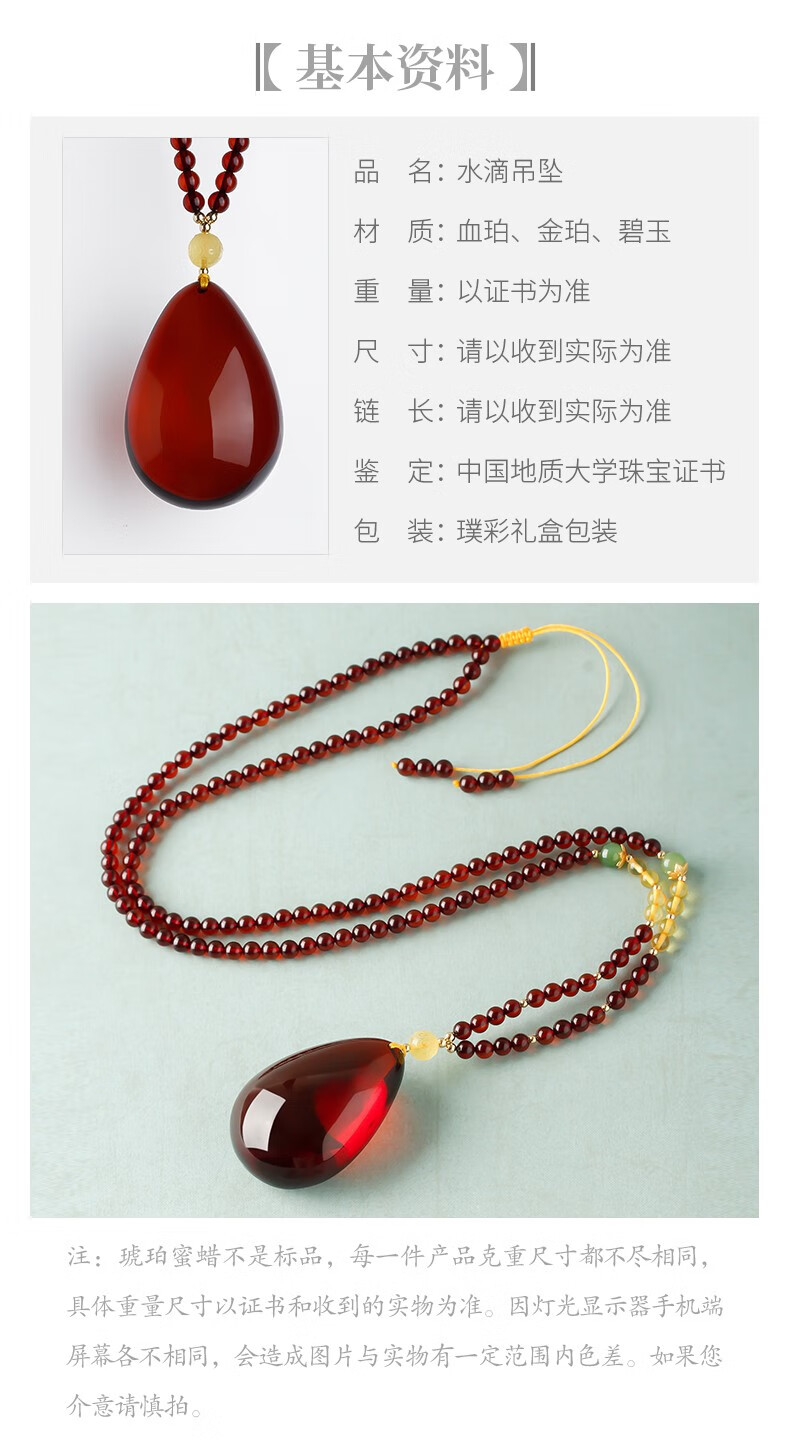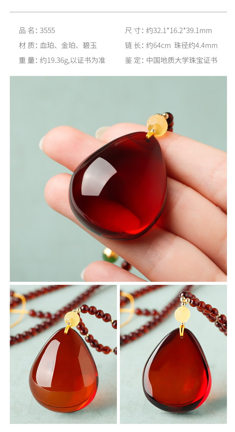 Ancient natural amber beeswax pendant blood amber certificate pendant necklace casual blood amber sweater chain with water drops 7207 about 28.76g about 63.2*34.7
