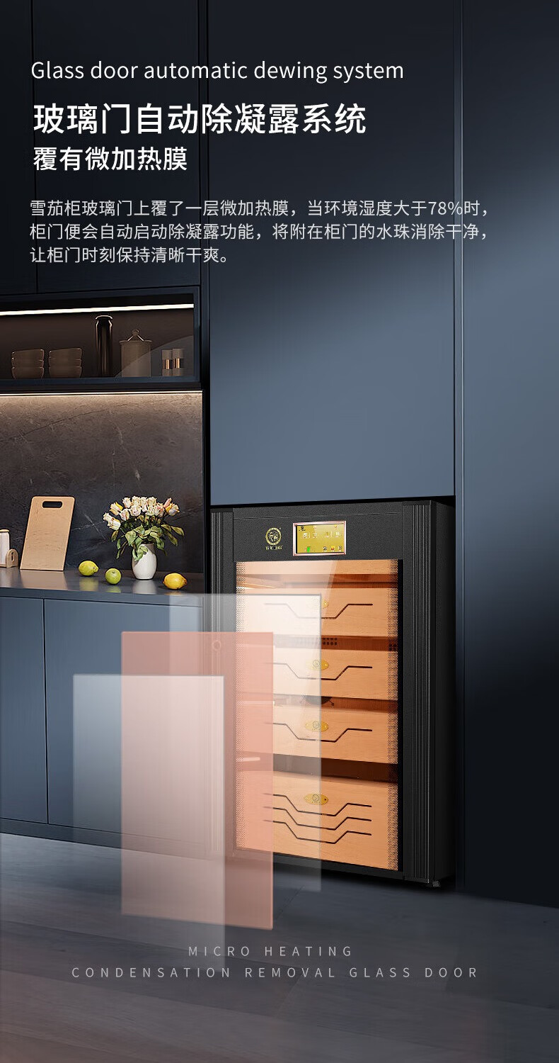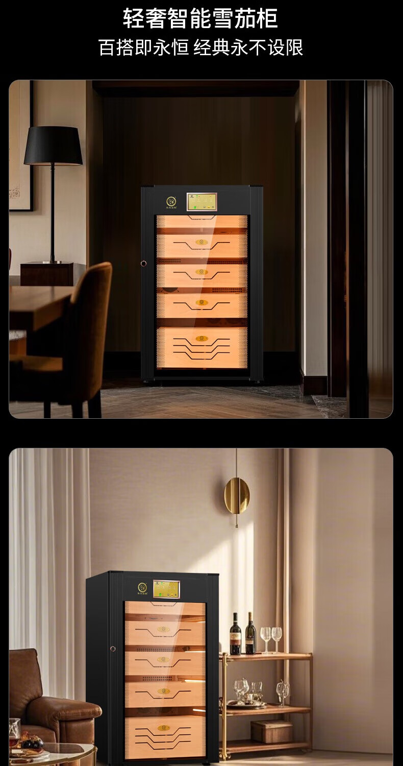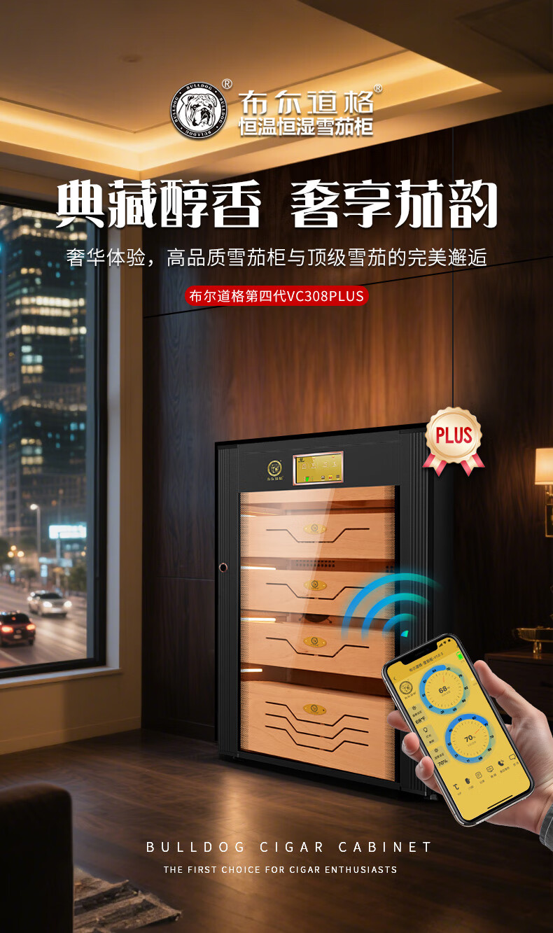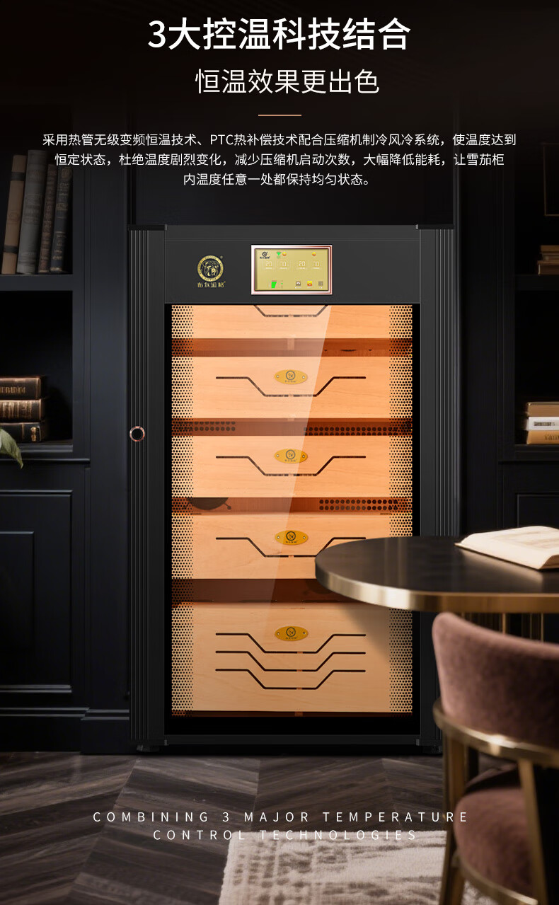 Bulldog cigar cabinet, constant temperature and humidity control, eggplant ammonia removal, German compressor, household moisturizing, wine cabinet, energy-saving, variable frequency, imported fingerprint password lock, WiFi Bulldog vc308, new product, fourth generation coffee color, 1000 pieces capacity, key lock