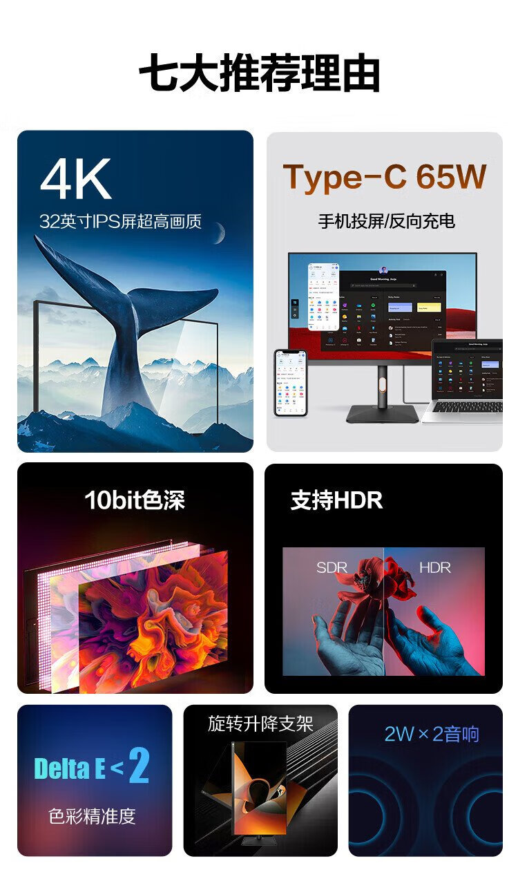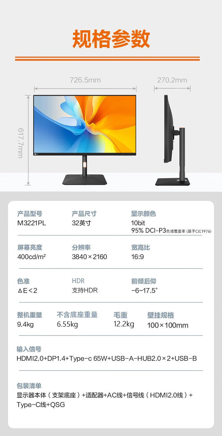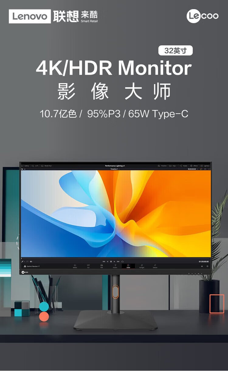 Lenovo 32-inch 4K monitor IPS screen HDR400 wide color gamut 10bit factory calibration Type-C65w interface built-in speaker rotating lift professional design computer display screen M3221PL