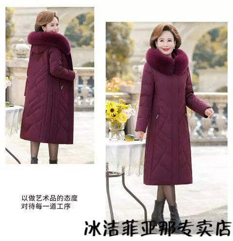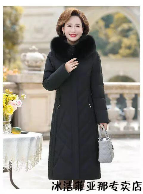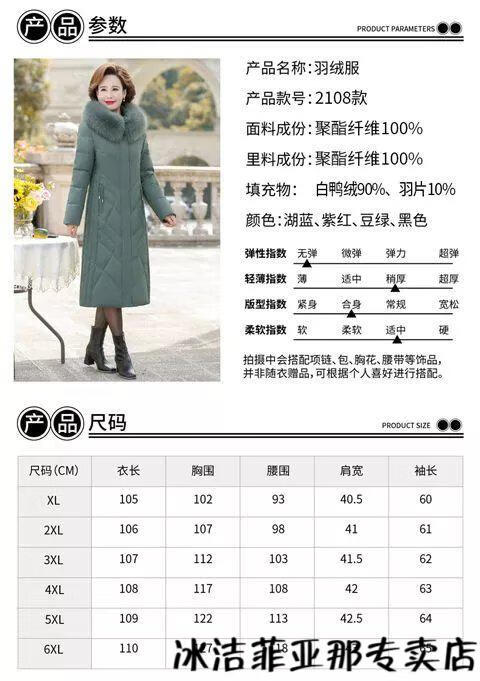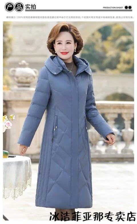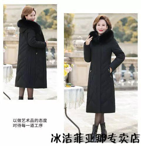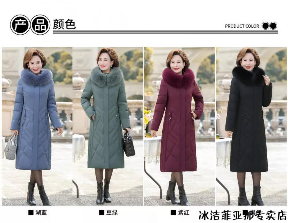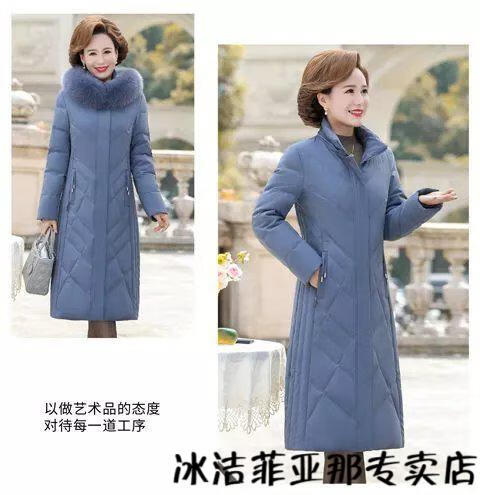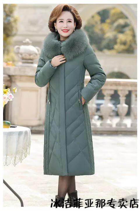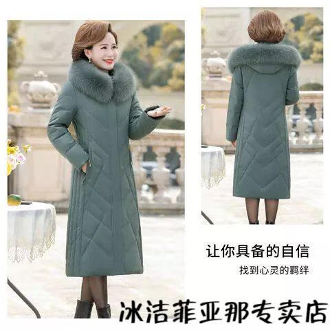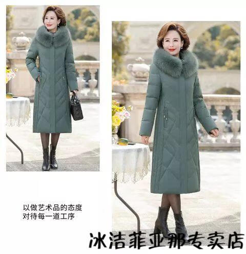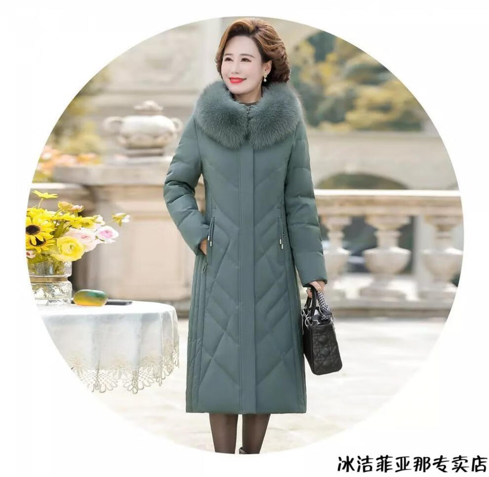 Pierre Cardin middle-aged and elderly down jacket women's new white duck down mother's wear long knee-length slim large size winter jacket pea green temperament and fashionable hat removable 5XL recommended 156-170Jin Jin equals 0.5 kg