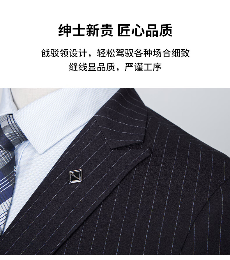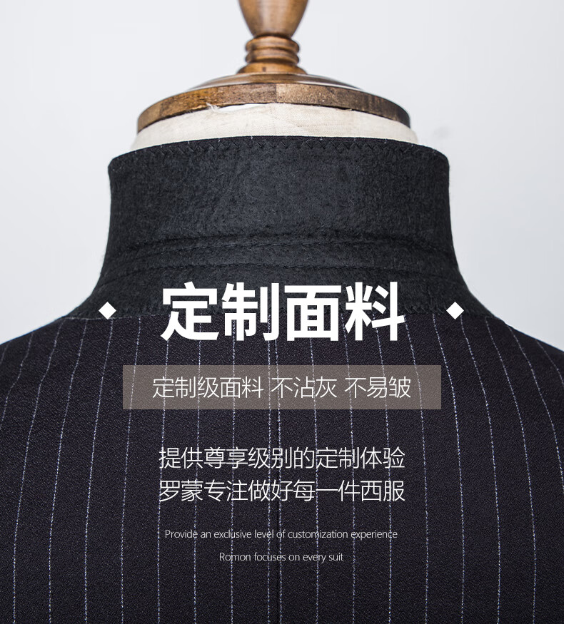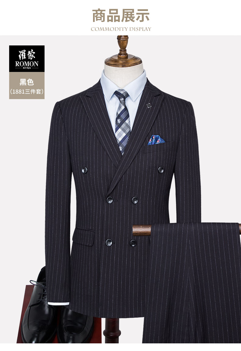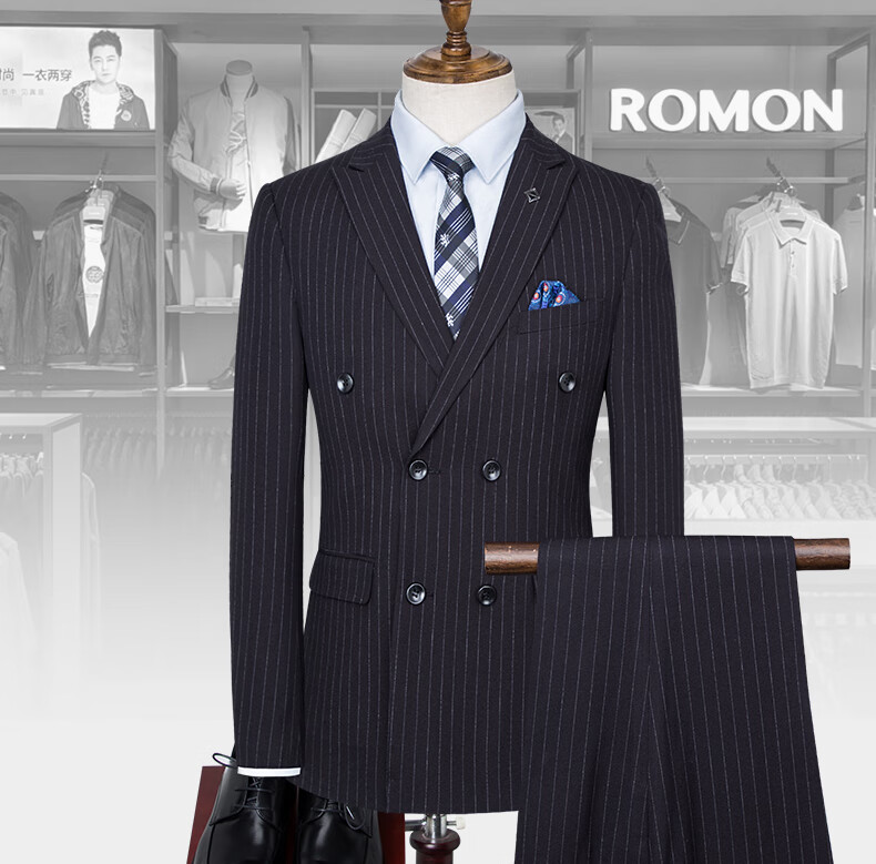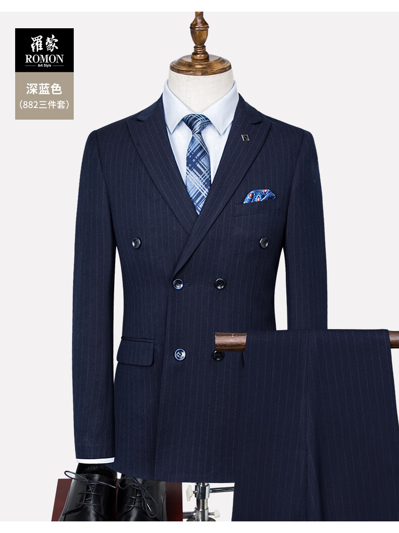 ROMON brand high-end suit suit men's double-breasted striped wedding British slim suit men's groom's wedding dress 1882 navy three-piece suit 180