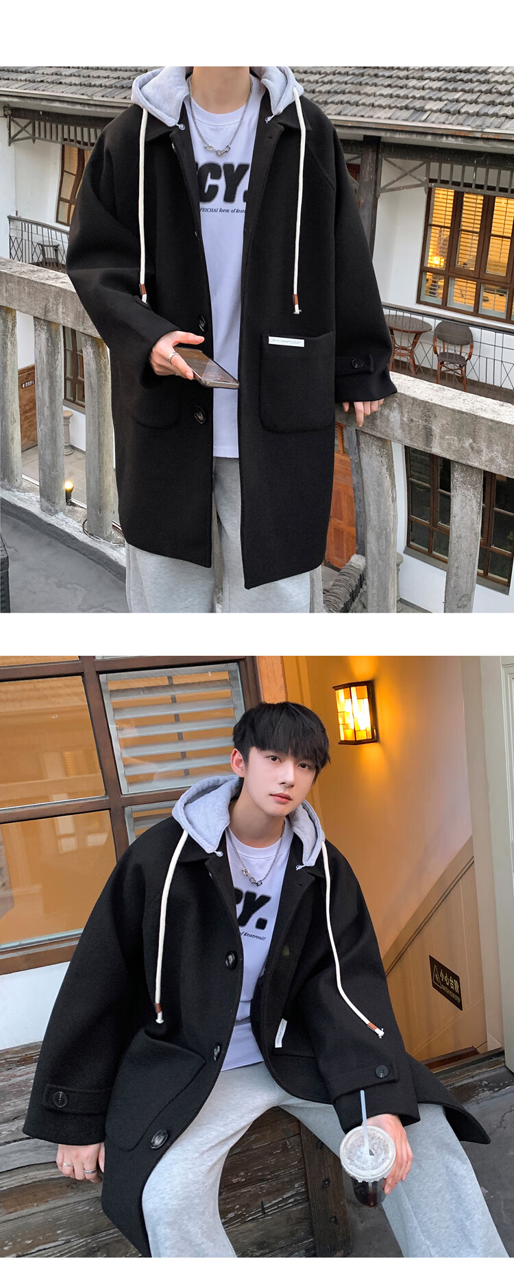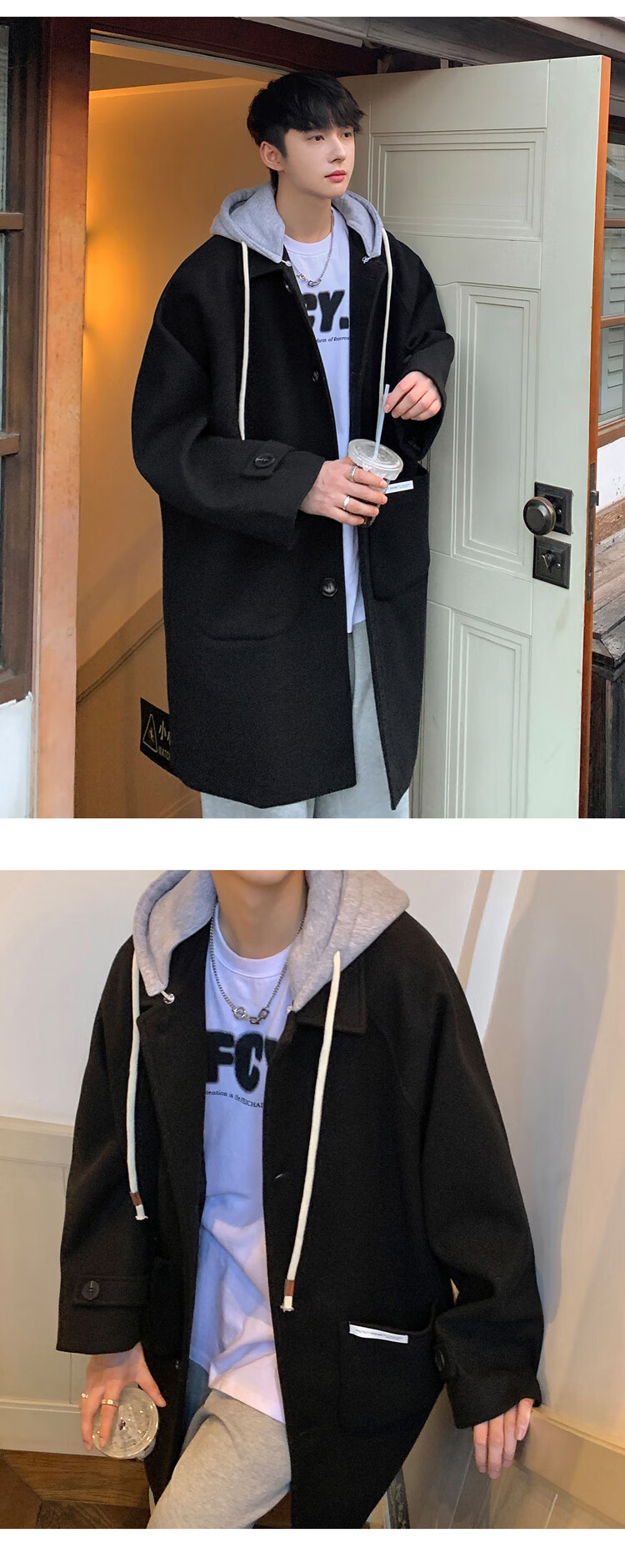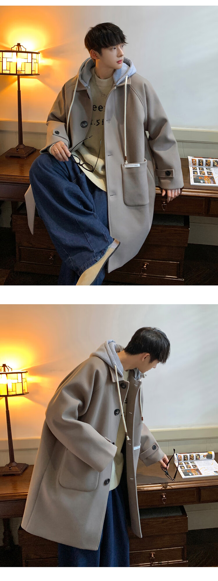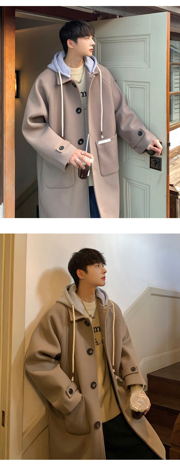 NEW OR MODE American mid-length woolen coat for men in autumn and winter, knee-high trendy brand windbreaker, thickened hooded woolen coat, off-white 2XL