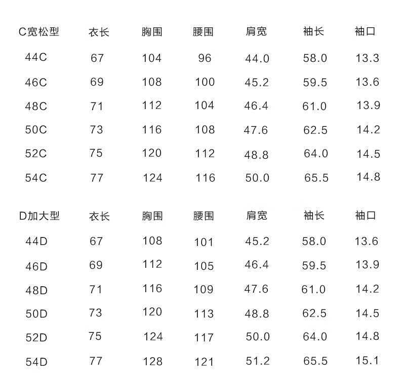 China (cm) 165 / 88-90 170 / 96-98 175 / 108-110 180 / 118-122 185 / 126-130