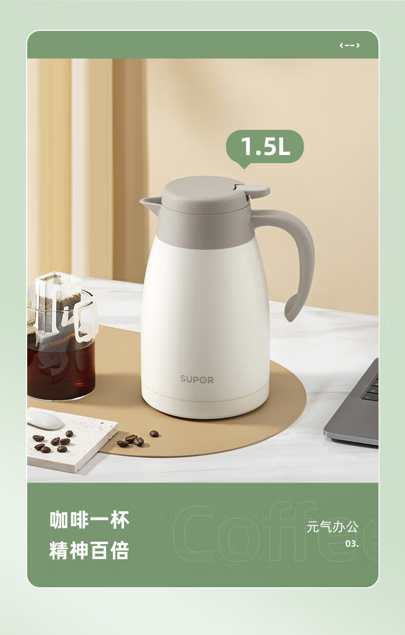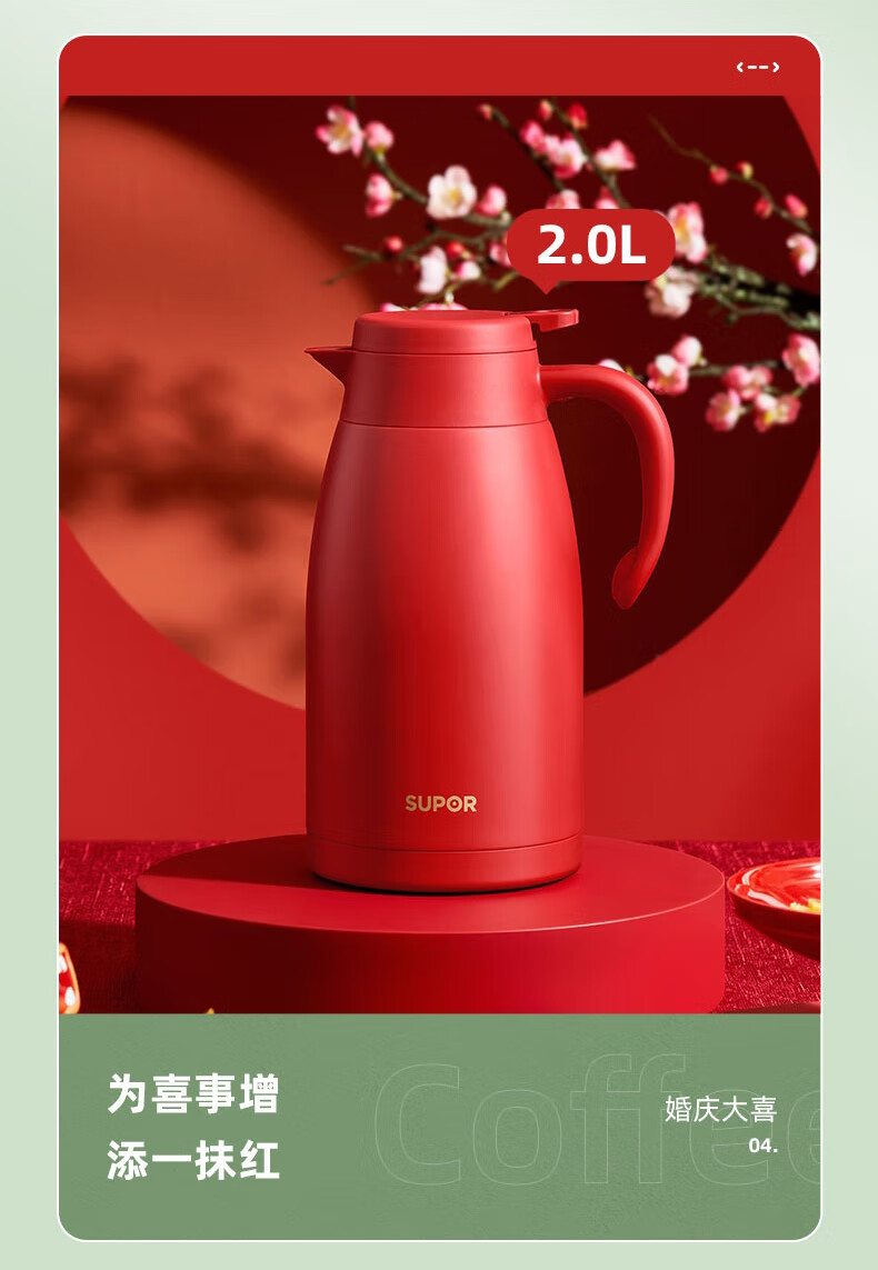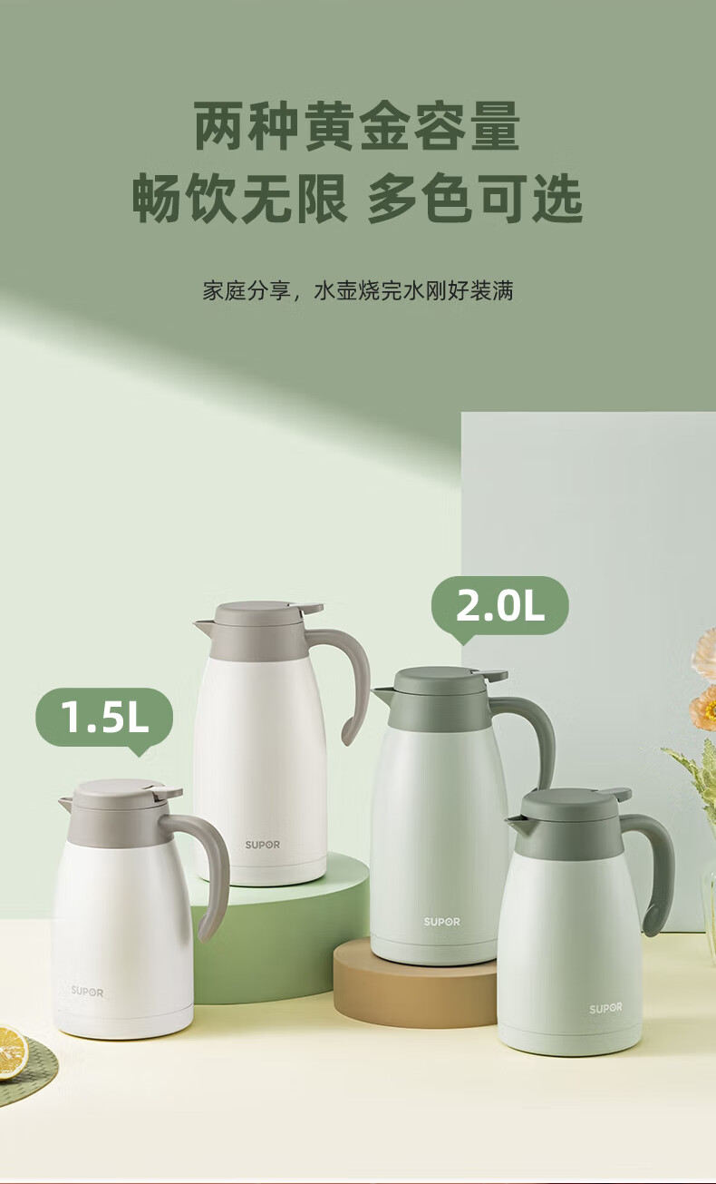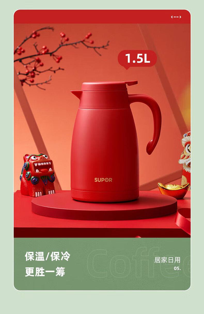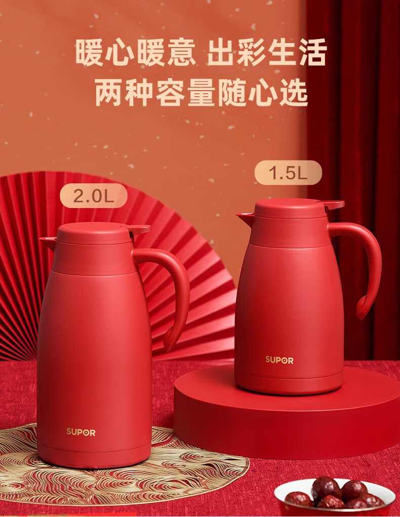 SUPOR thermos kettle household long-lasting thermal insulation large-capacity kettle stainless steel vacuum thermos flask hot water kettle thermos boiling water bottle 1.5L carmine red 1.5L