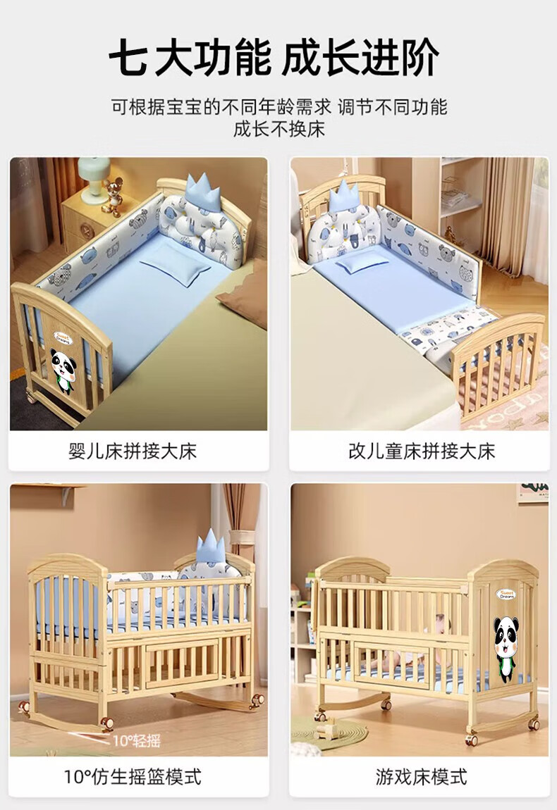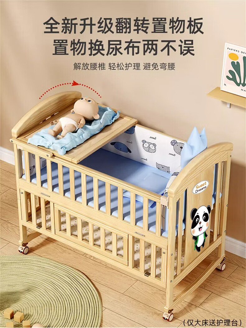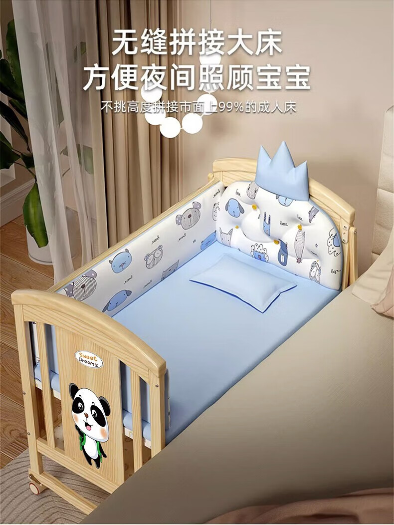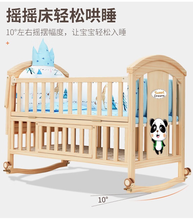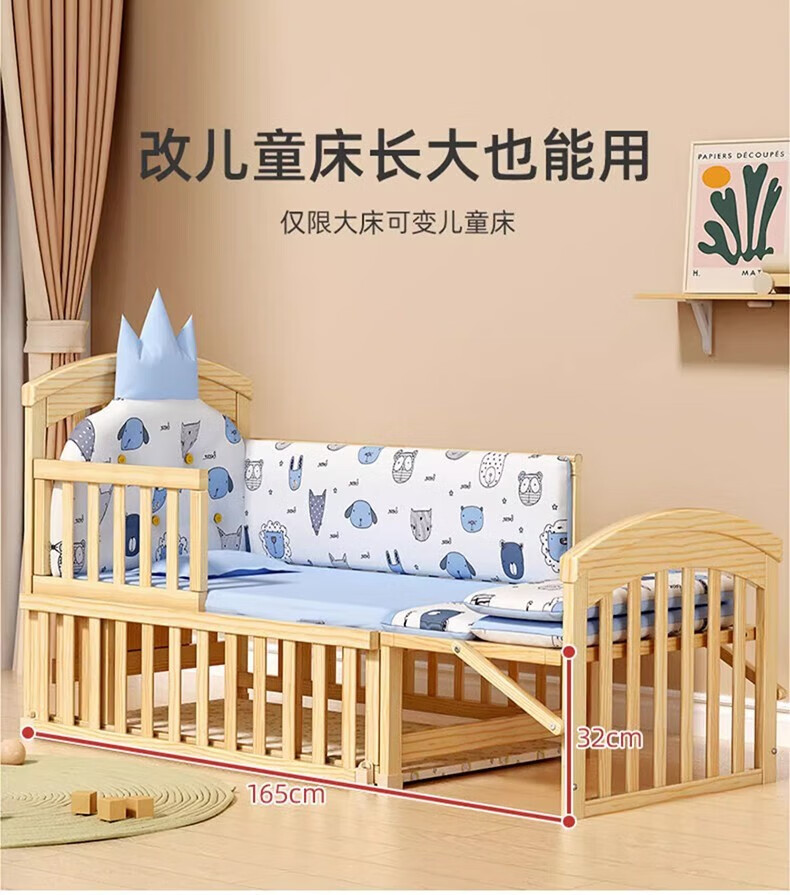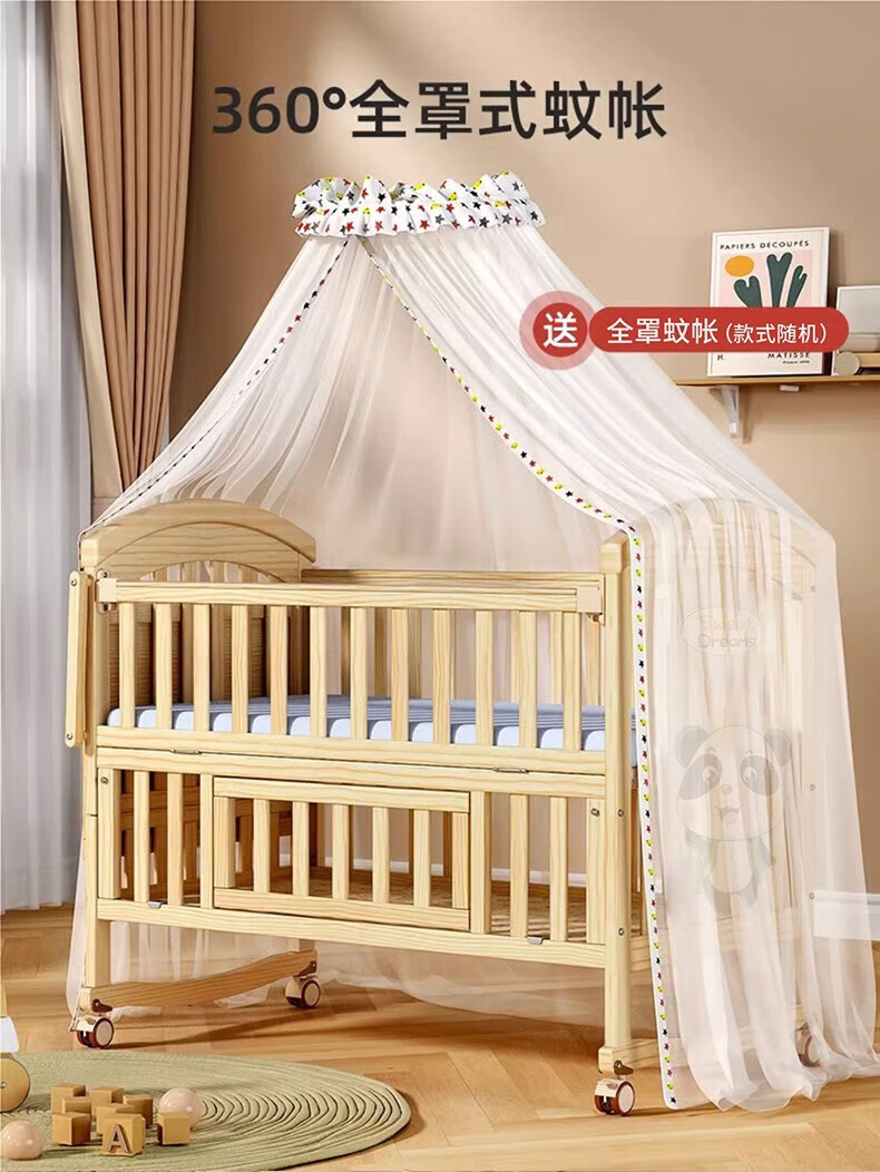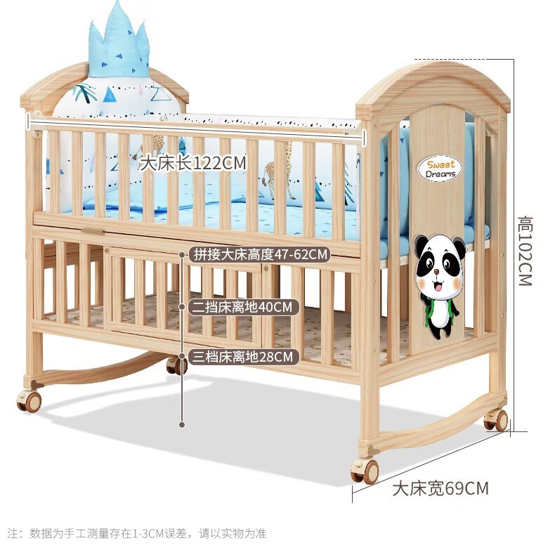 ULOP German crib solid wood removable splicing large bed multi-functional newborn bb baby comfort bed children's wooden bed animal 5-piece set-double-layer mosquito net + changing table