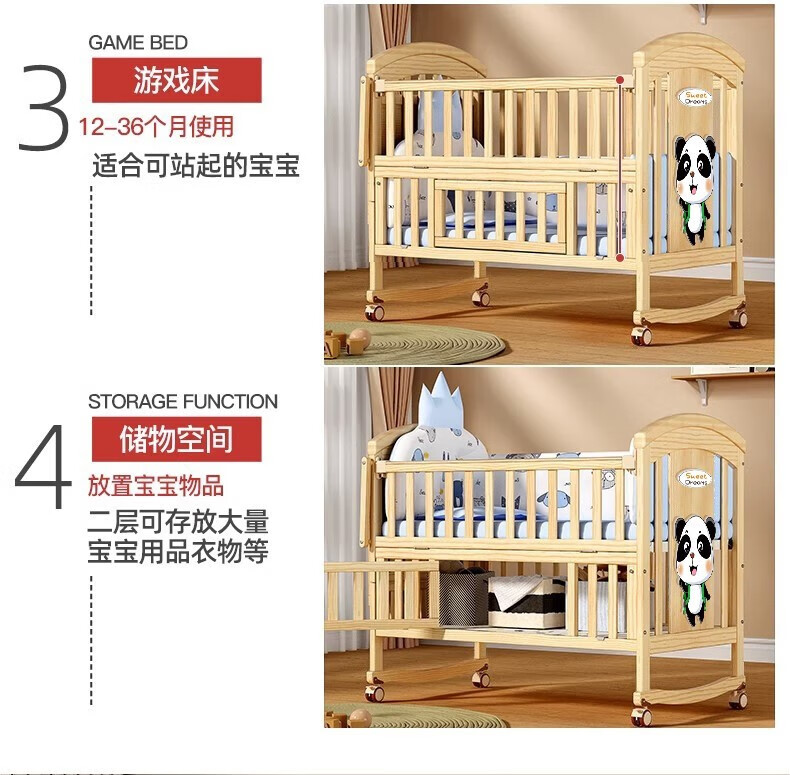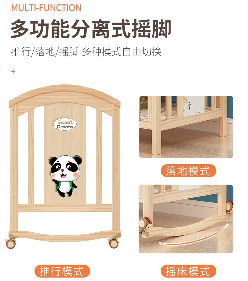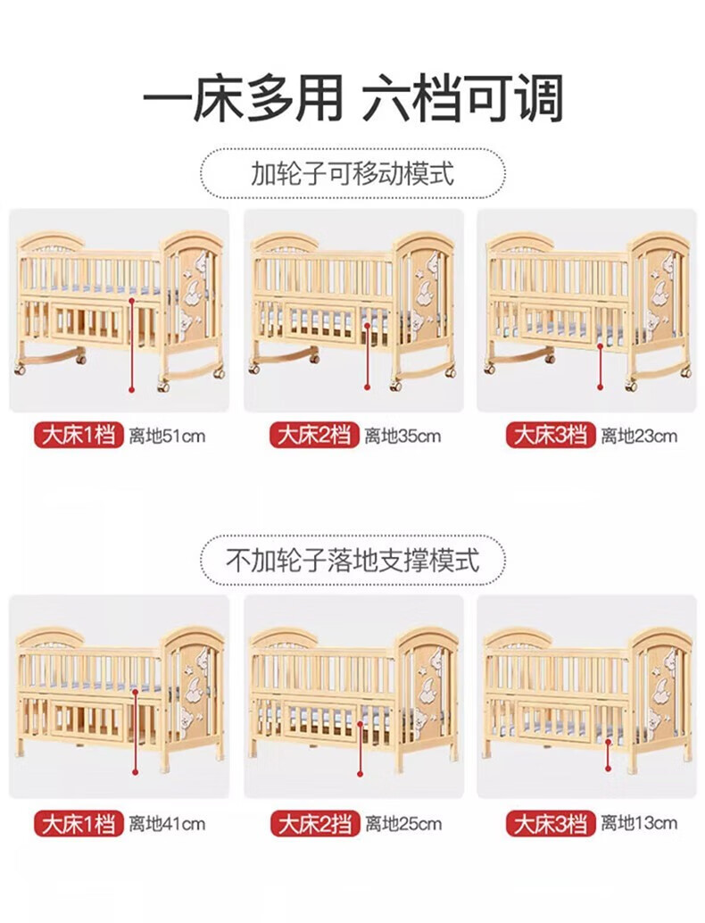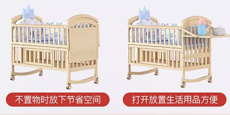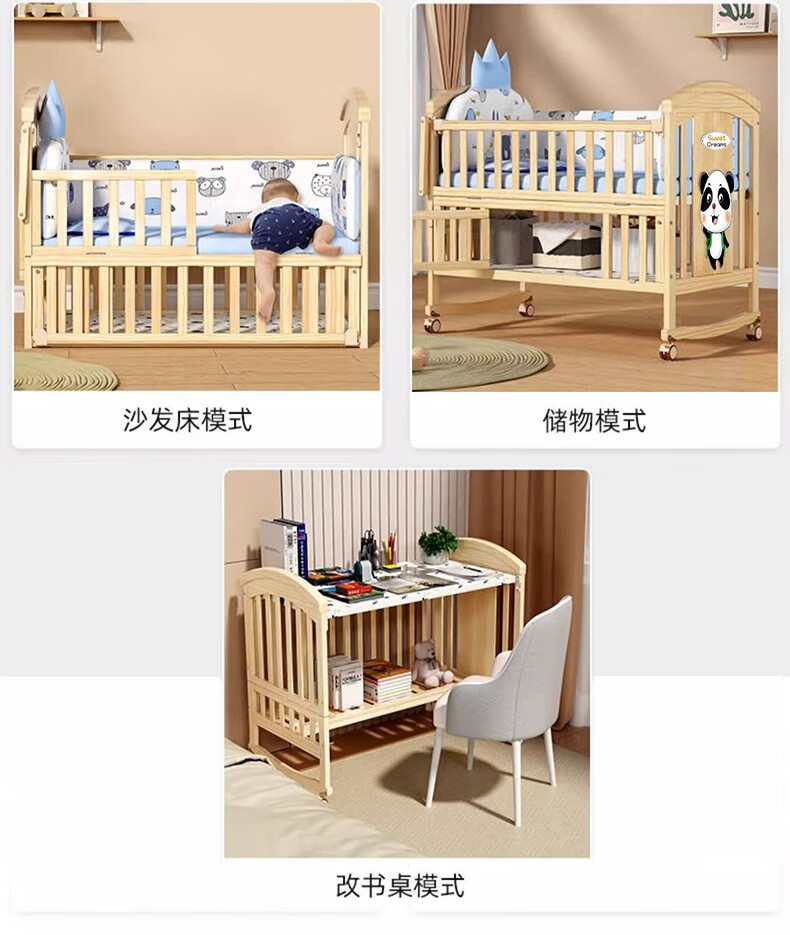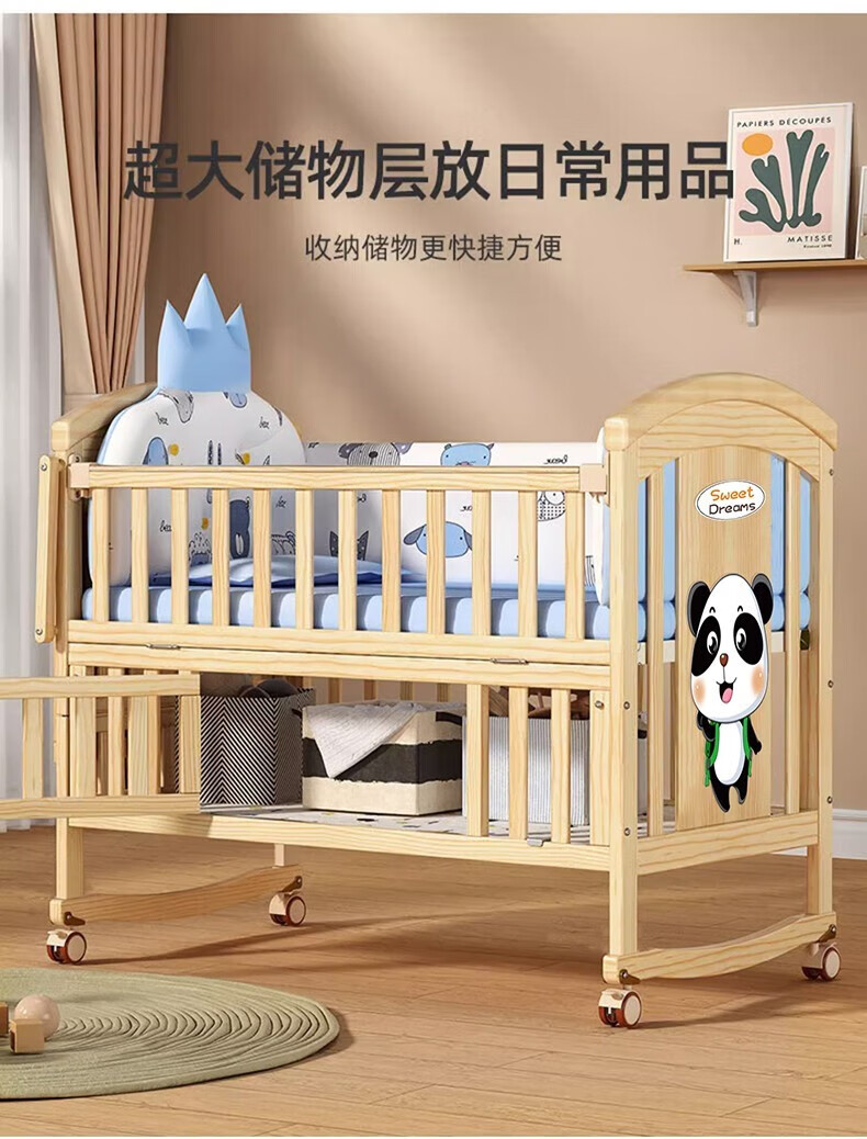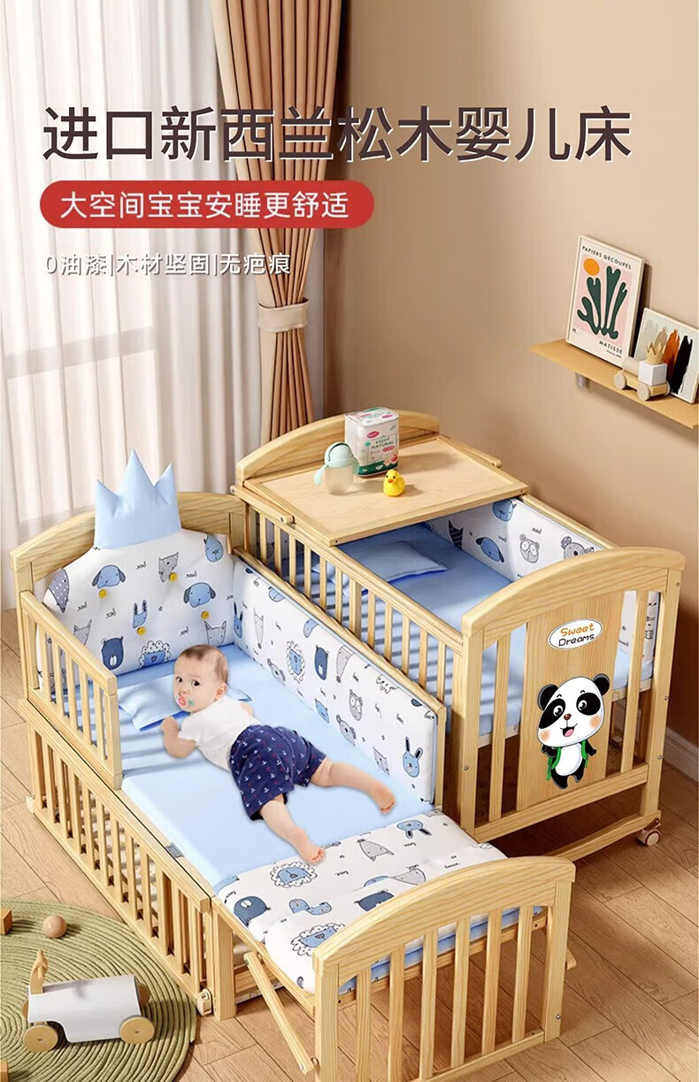 ULOP German crib solid wood removable splicing large bed multi-functional newborn bb baby comfort bed children's wooden bed animal 5-piece set-double-layer mosquito net + changing table