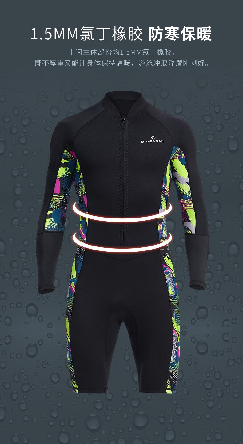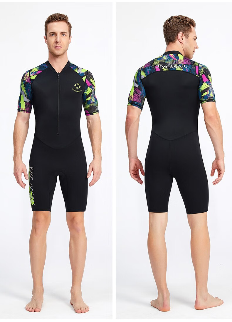 Yobel men's one-piece swimsuit 1.5MM neoprene warm long-sleeved sun protection swimsuit snorkeling surfing boating wetsuit black pattern short-sleeved shorts M recommended weight 120-140Jin Jin equals 0.5 kg