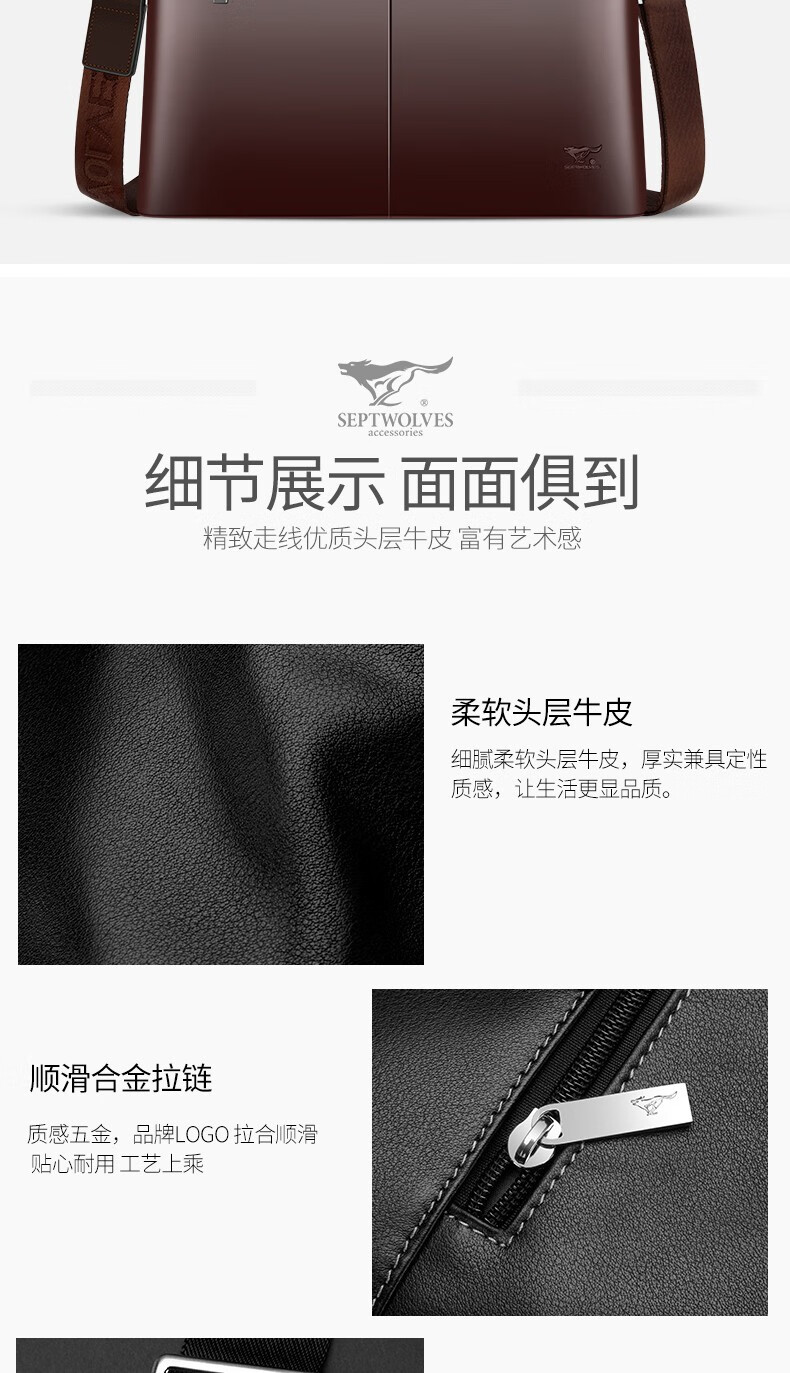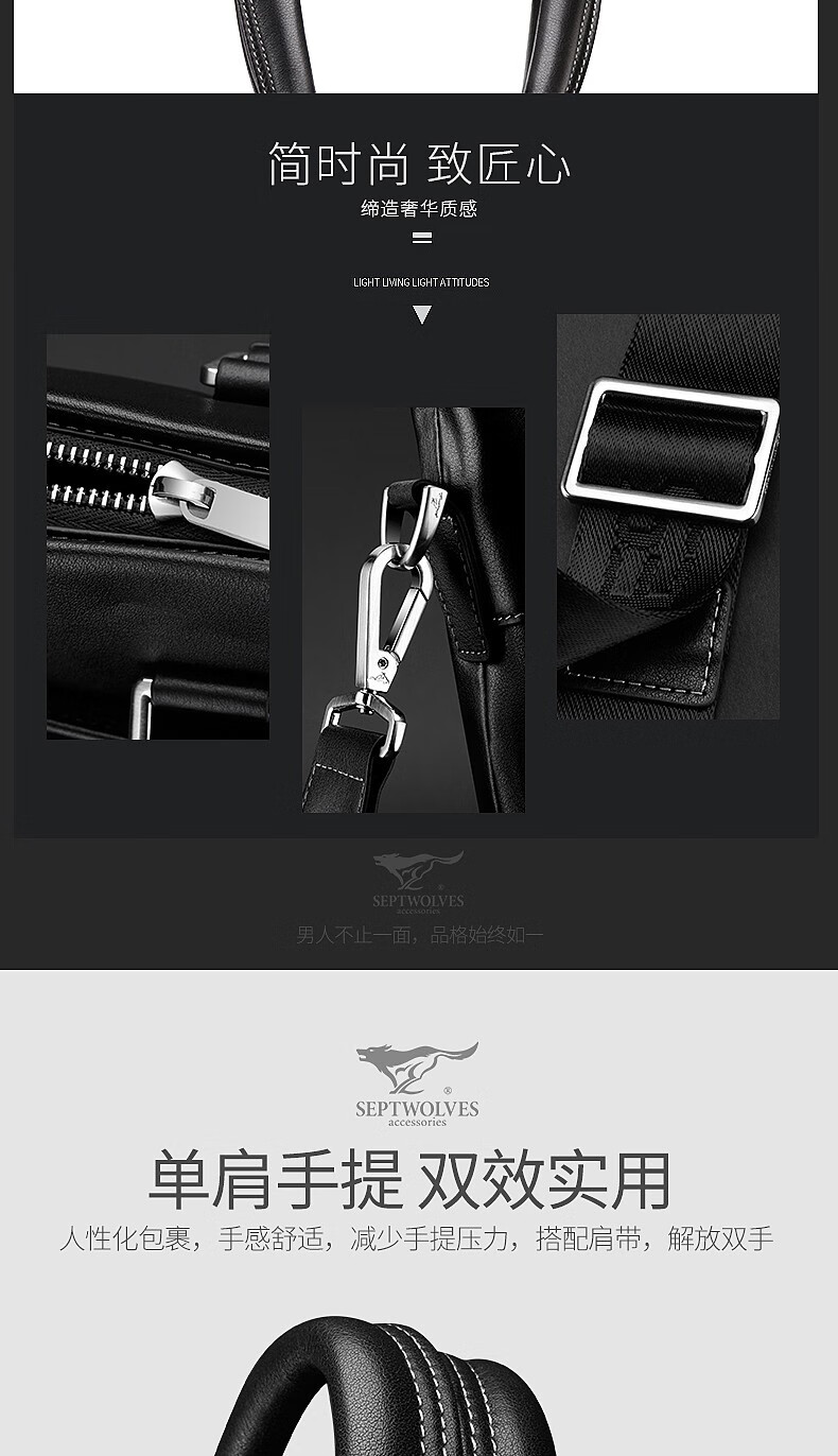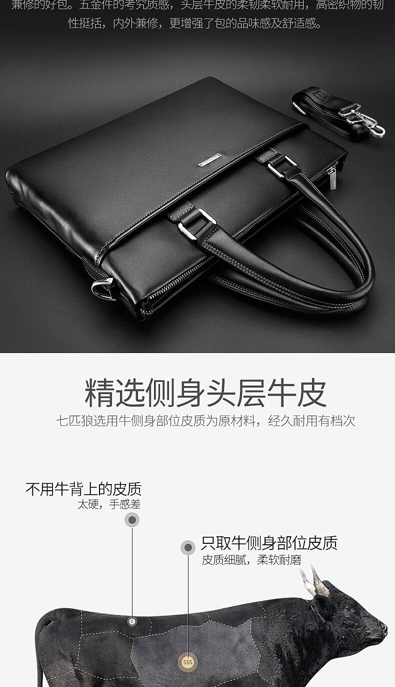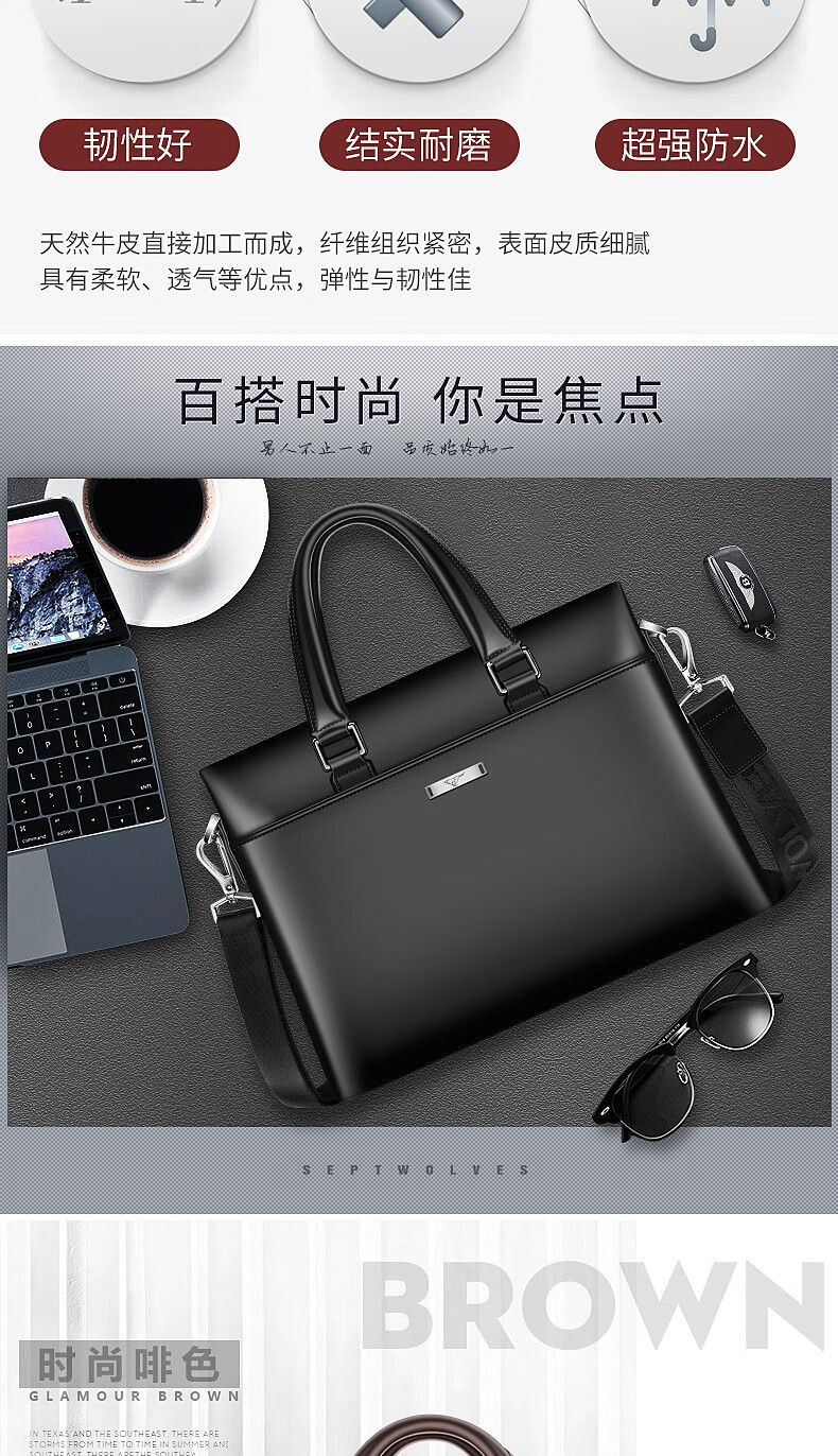 Septwolves Briefcase Men's Genuine Leather Handbag Business Casual First Layer Cowhide Crossbody Bag Chinese Valentine's Day Gift for Boyfriend Black
