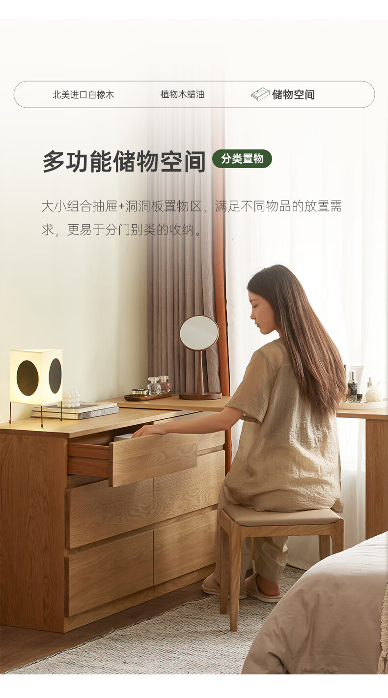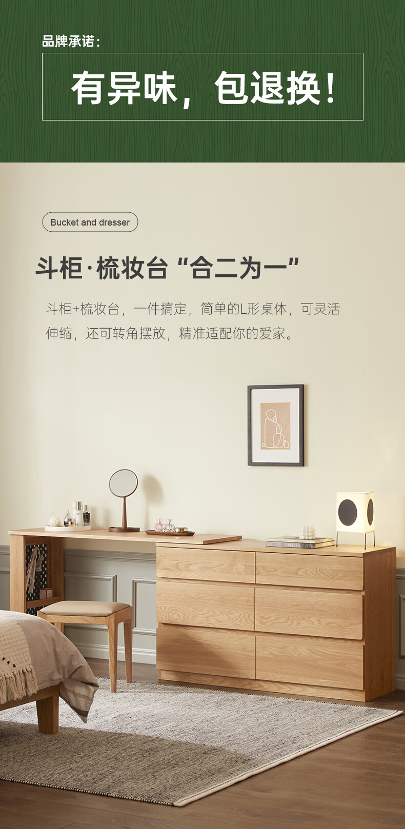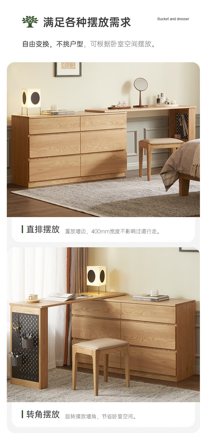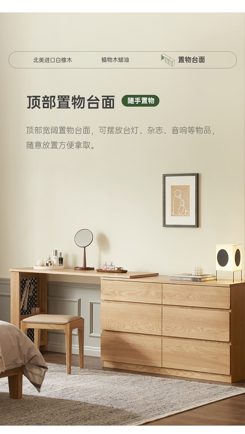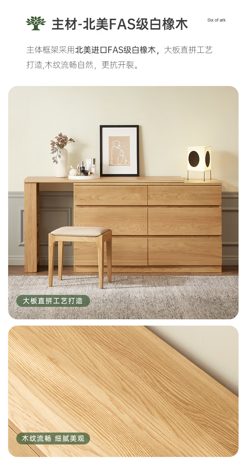 Original elements all solid wood drawer cabinet dresser white oak one-piece multifunctional floor-standing storage cabinet dressing table M2031 wide six drawers + L table without stool - white oak