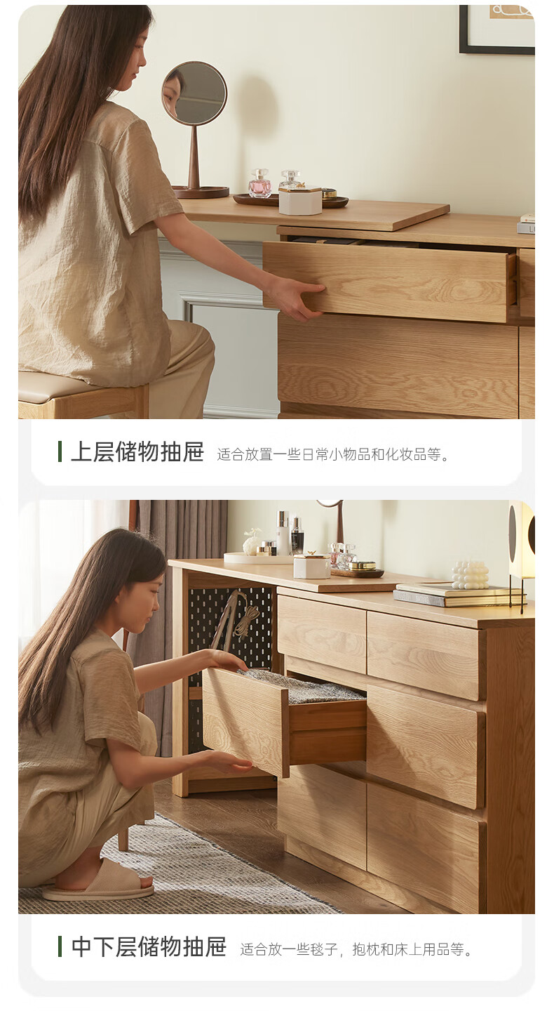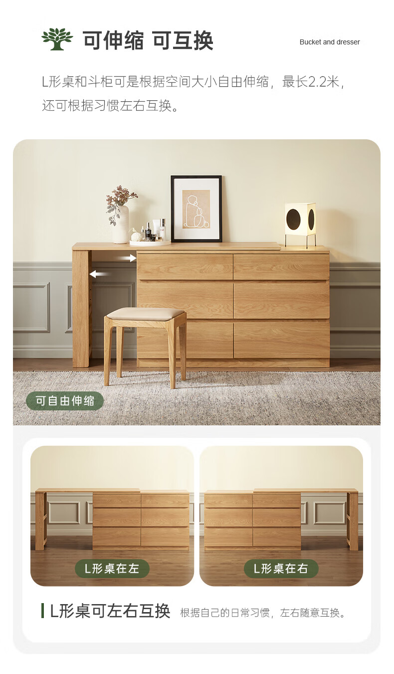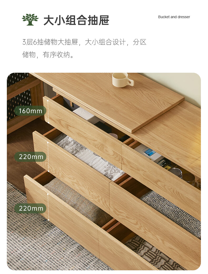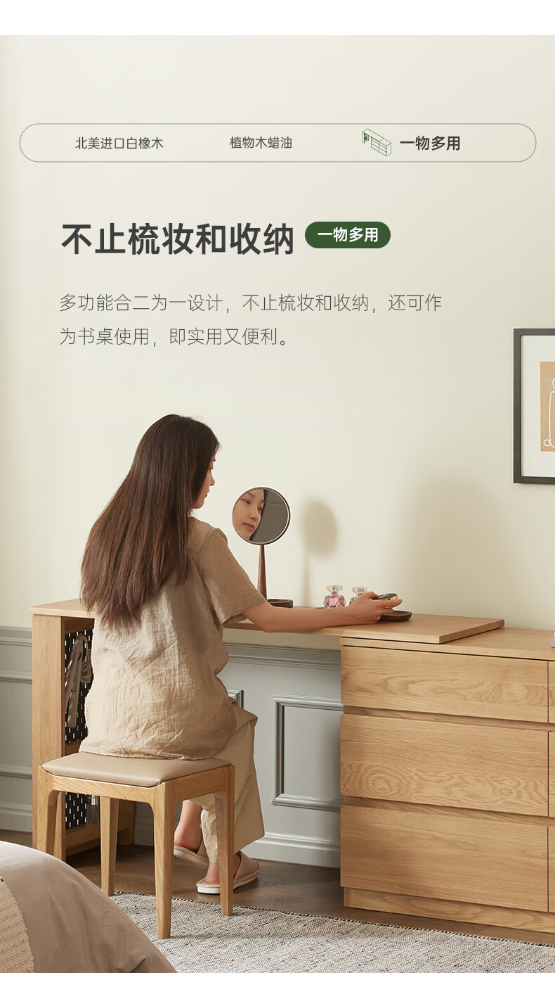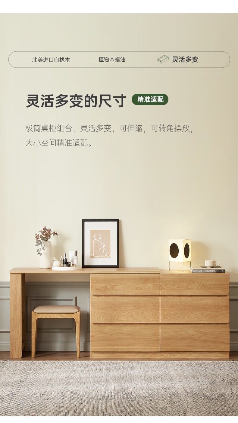 Original elements all solid wood drawer cabinet dresser white oak one-piece multifunctional floor-standing storage cabinet dressing table M2031 wide six drawers + L table without stool - white oak