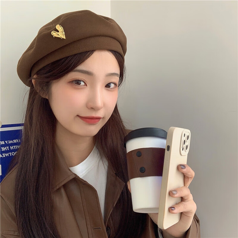 Beret Winter Korean Style Autumn and Winter Woolen Beret Women's Retro Versatile Fashion Love Metal Painter Hat Chestnut Brown M (56-58cm)