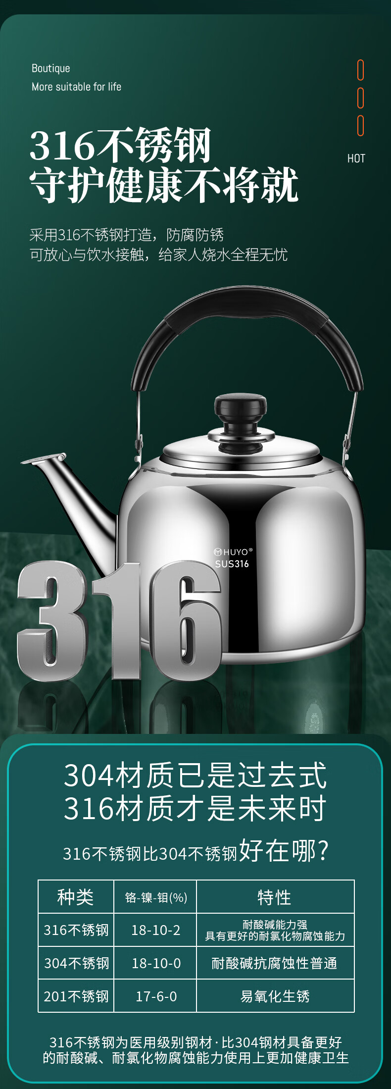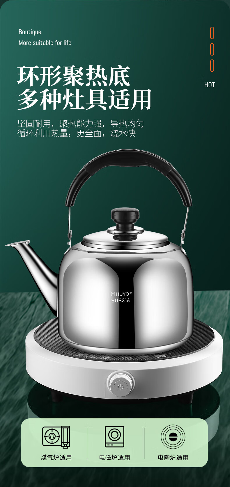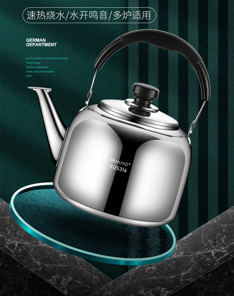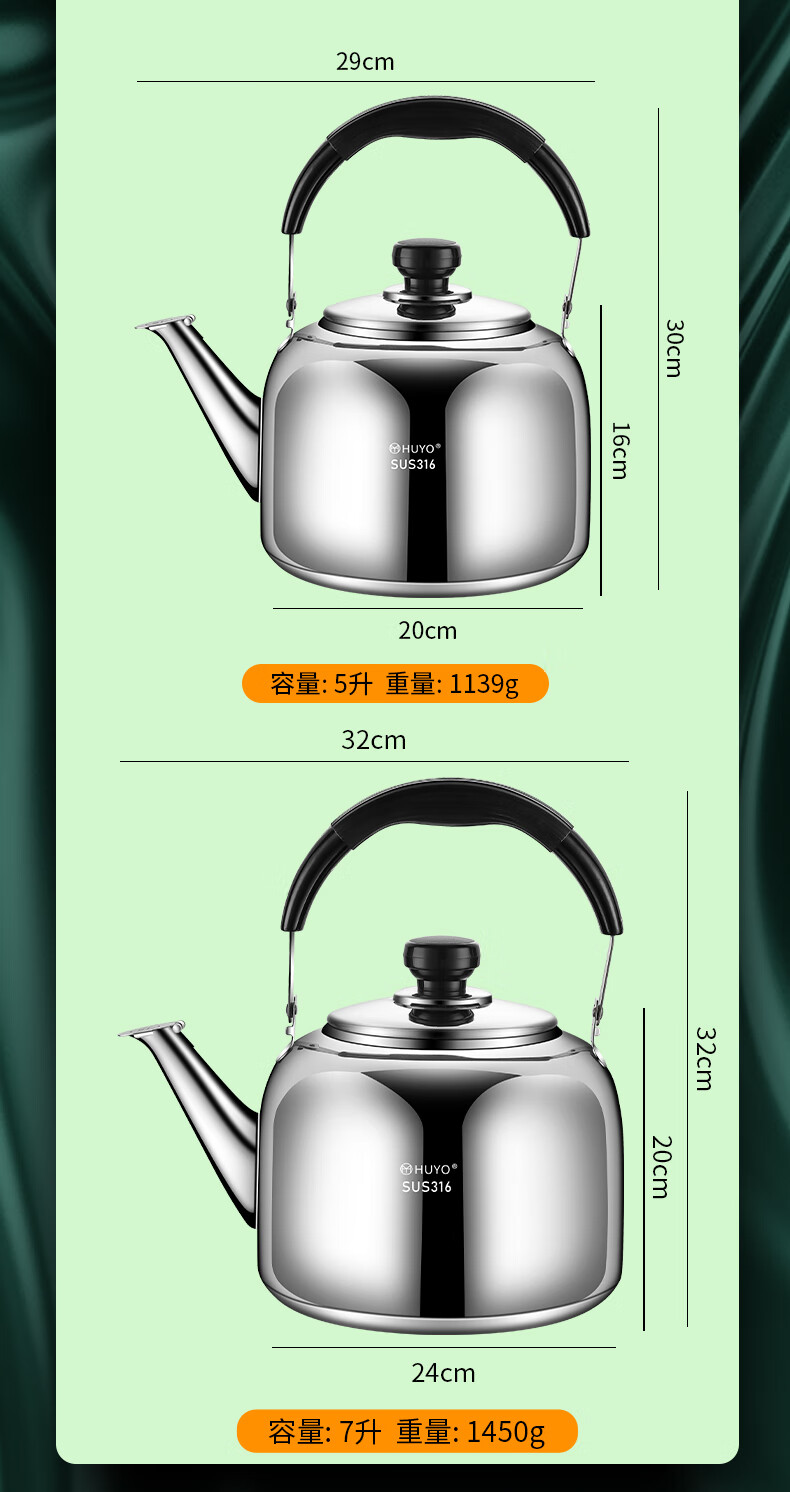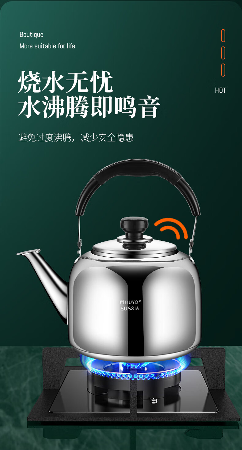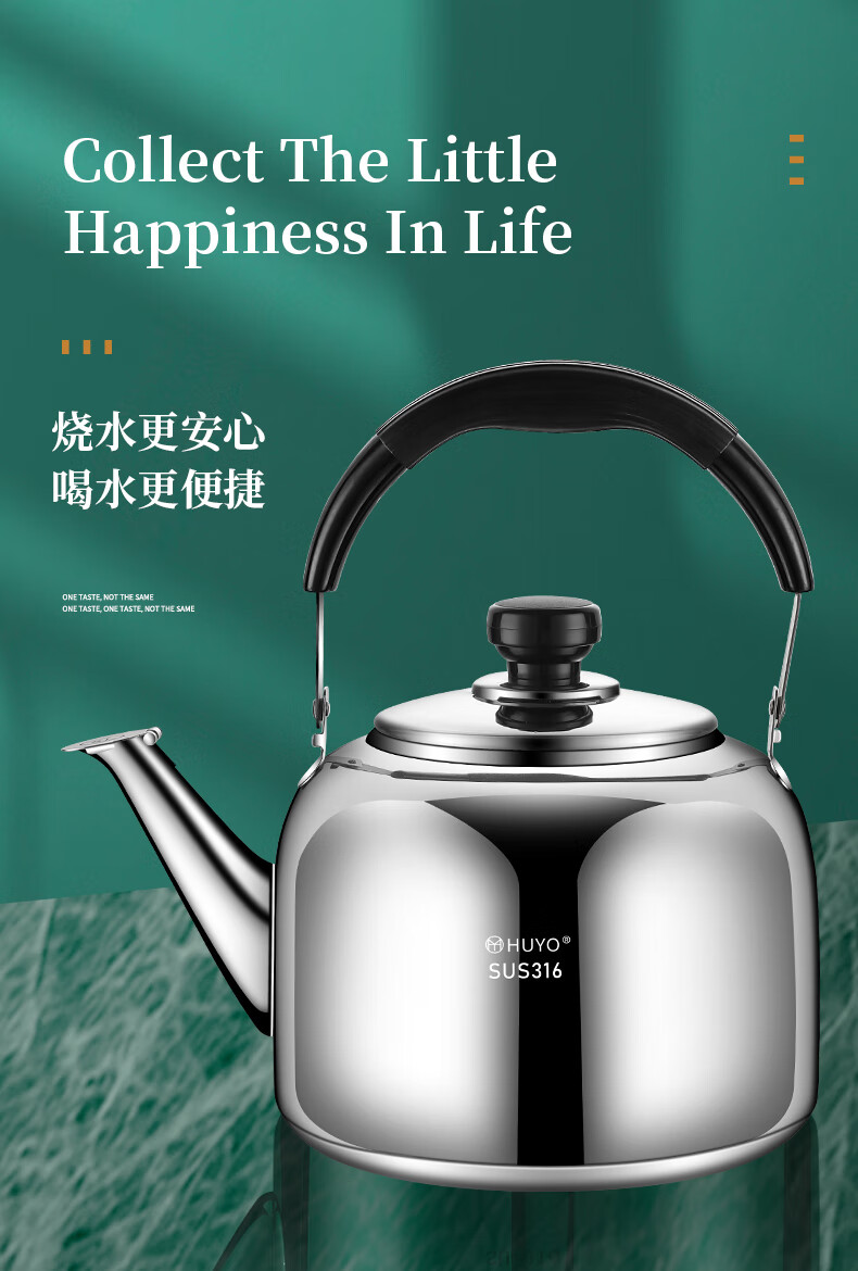 HUYO food grade 316 stainless steel kettle large capacity household open flame hot water kettle gas induction cooker old-fashioned tea kettle antibacterial 316 steel kettle water boiling sound 5L