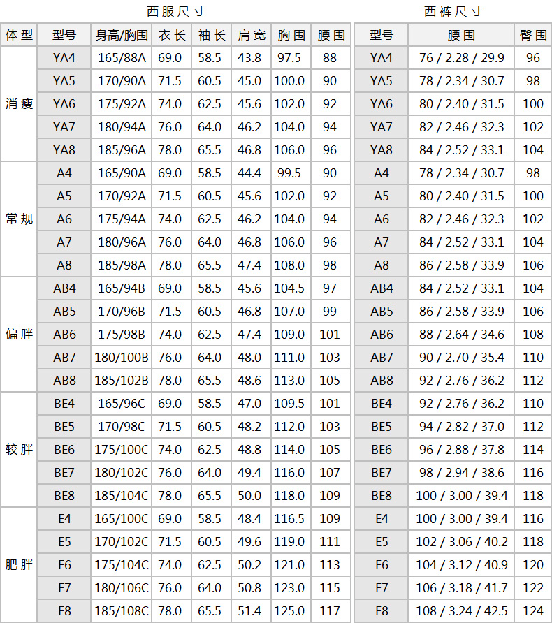 China (cm) 160-165/84-86 165-170 / 88-90 167-172 / 92-96 168-173 / 98-102 170-176 / 106-110