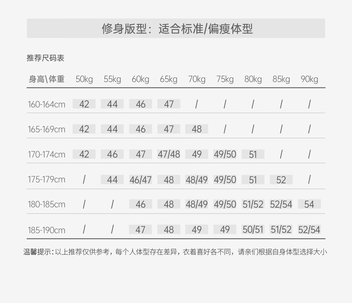 China (cm) 160-165/84-86 165-170 / 88-90 167-172 / 92-96 168-173 / 98-102 170-176 / 106-110