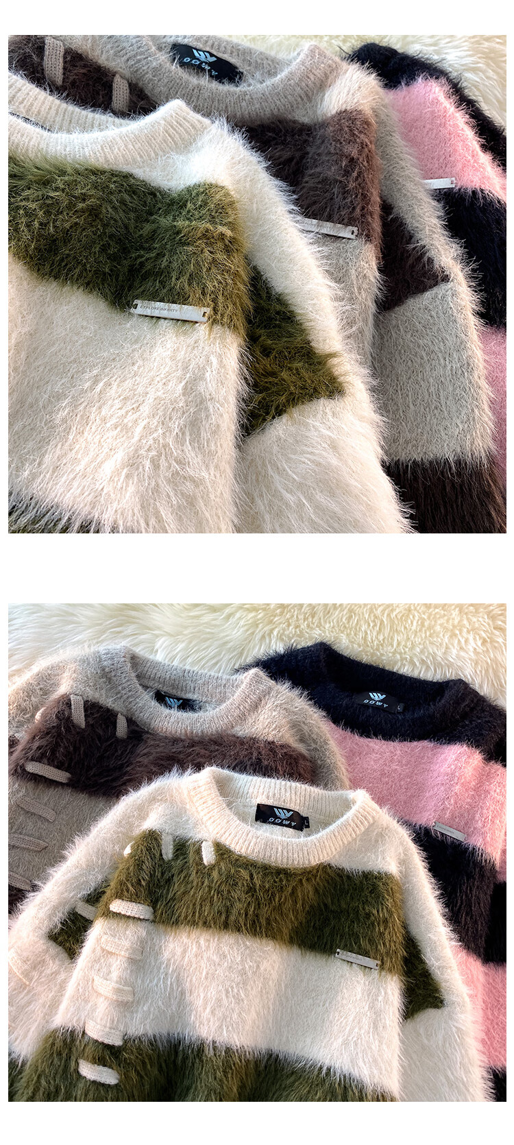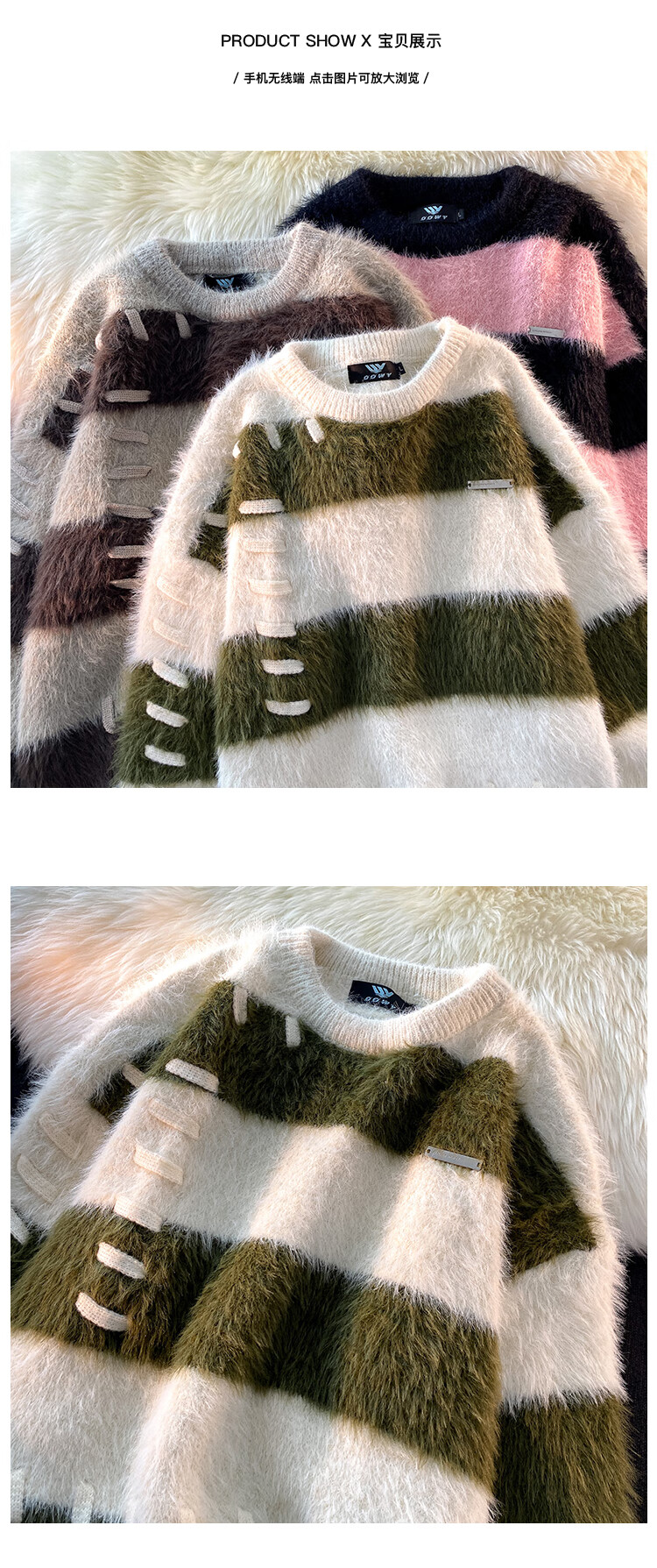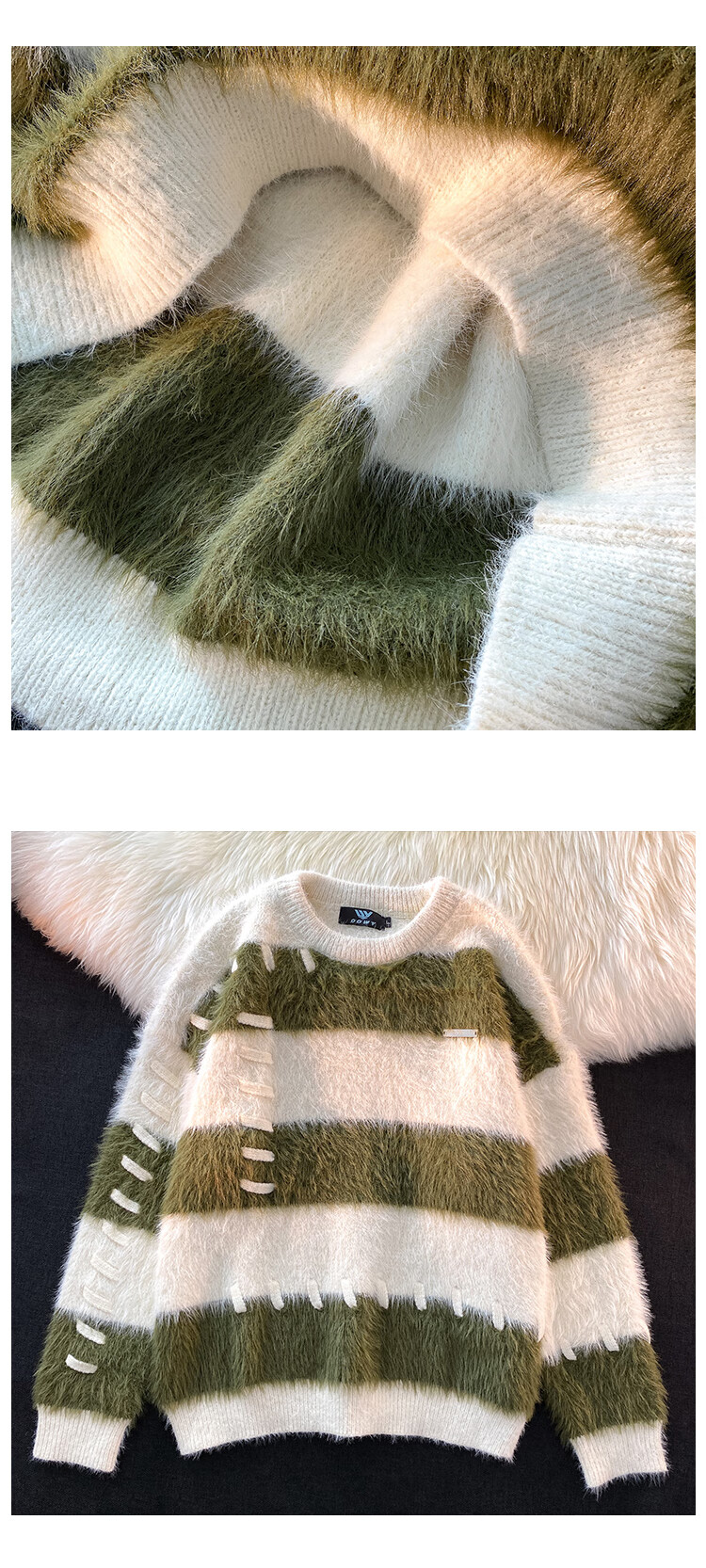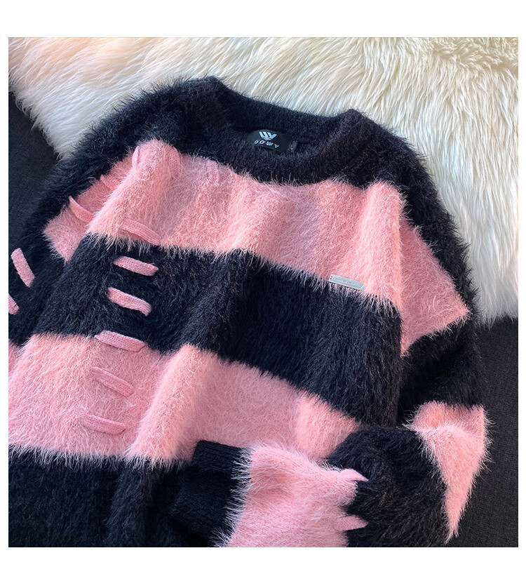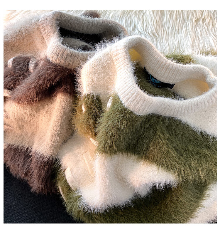 Style Rabbit Sweater Women's 2025 New Winter Stripe Contrast Color Age Reduction Thickening Design Loose Lazy Trendy Knitted Sweater Green One Size