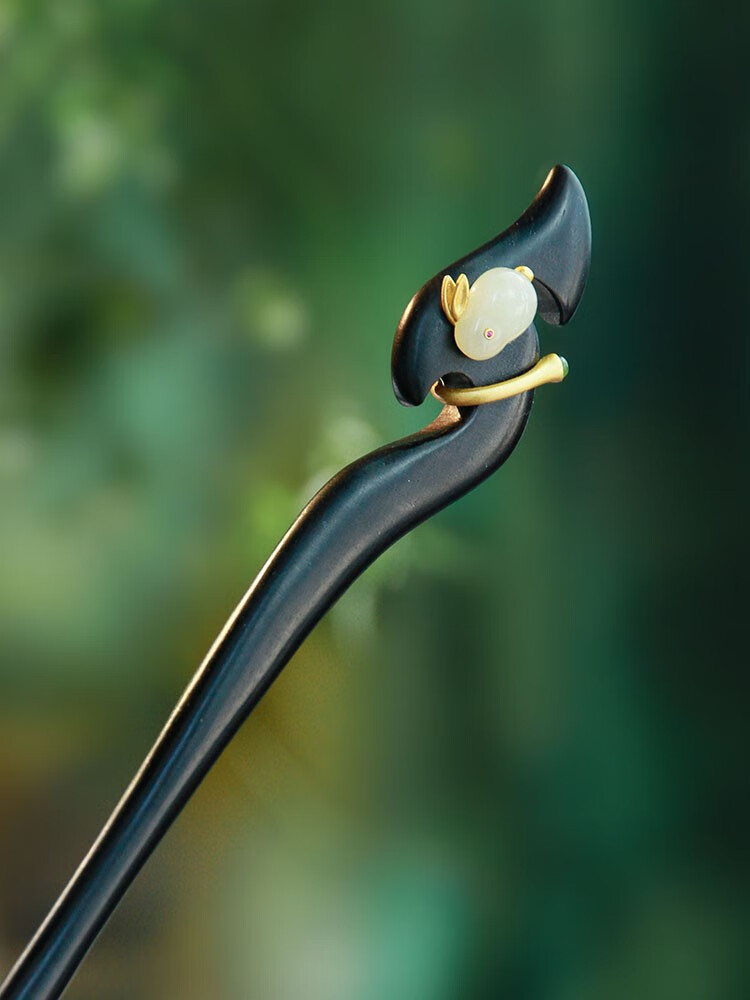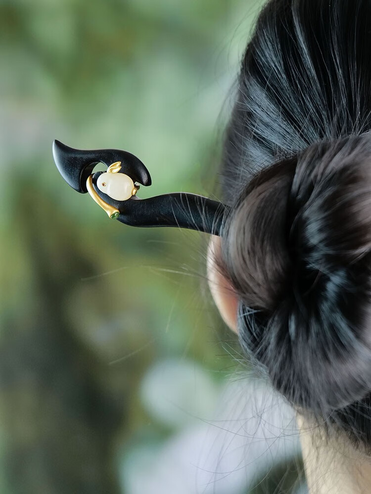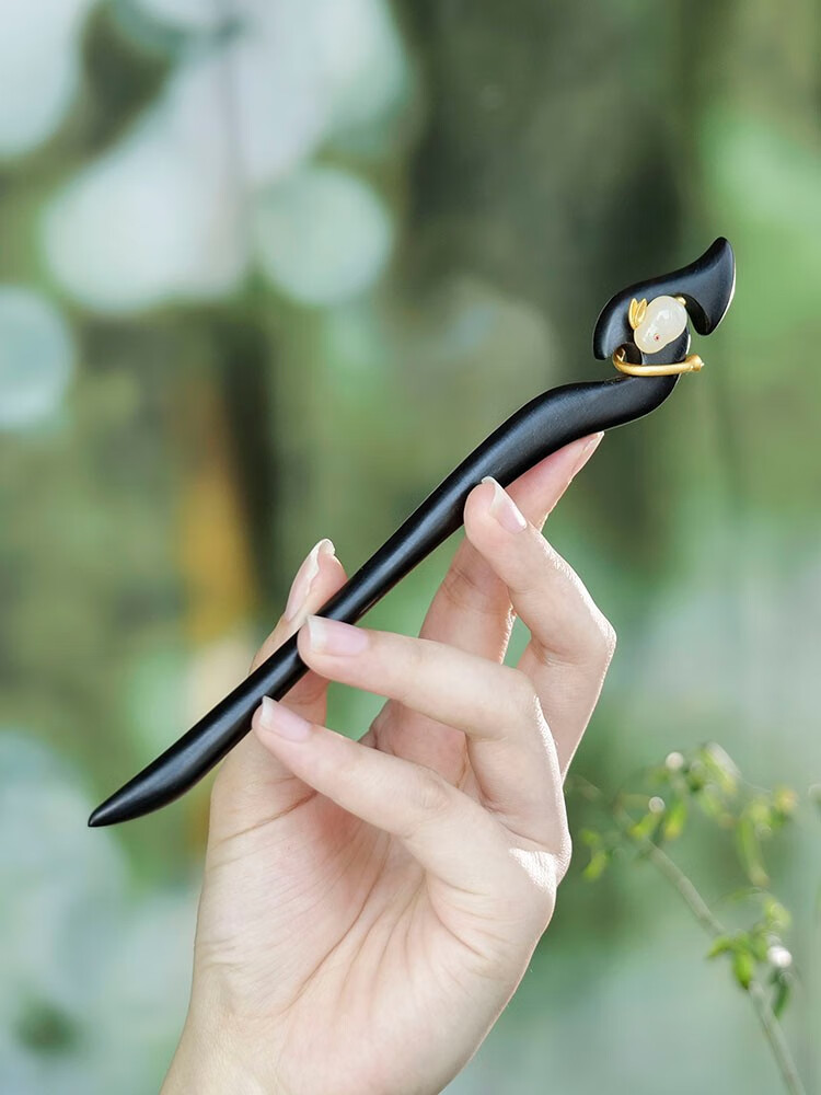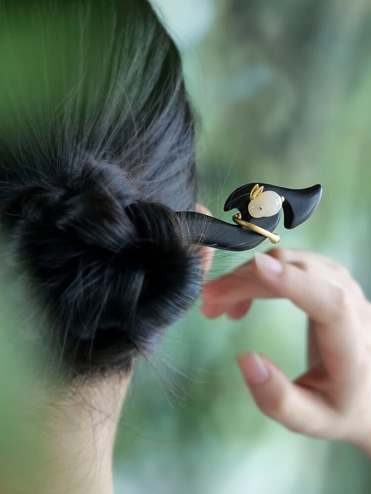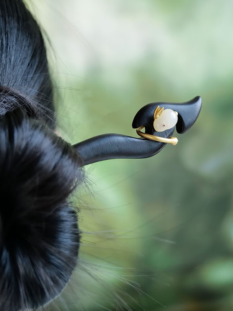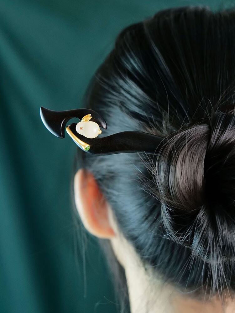 AIF Black Sandalwood Hetian Jade Rabbit Hairpin Women's Ancient Style Hairpin Hair Accessory Valentine's Day Birthday Gift for Girlfriend and Wife Black Sandalwood Jade Rabbit Hairpin
