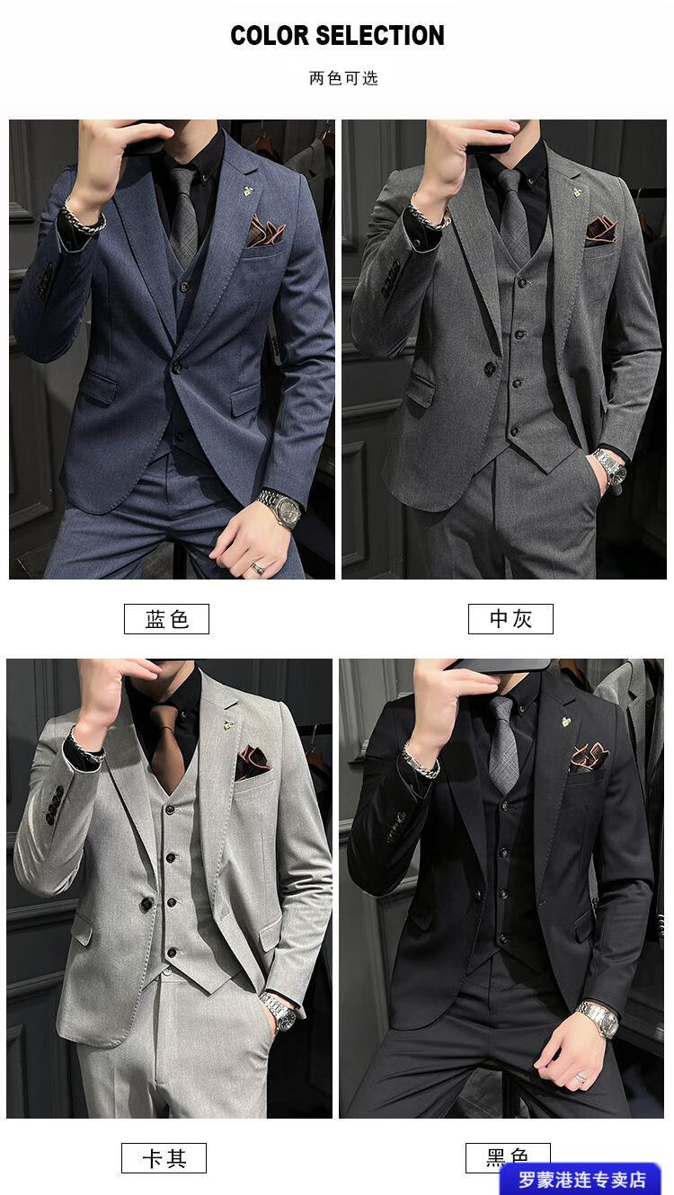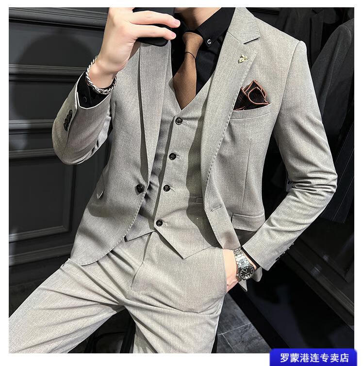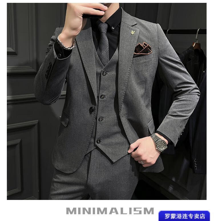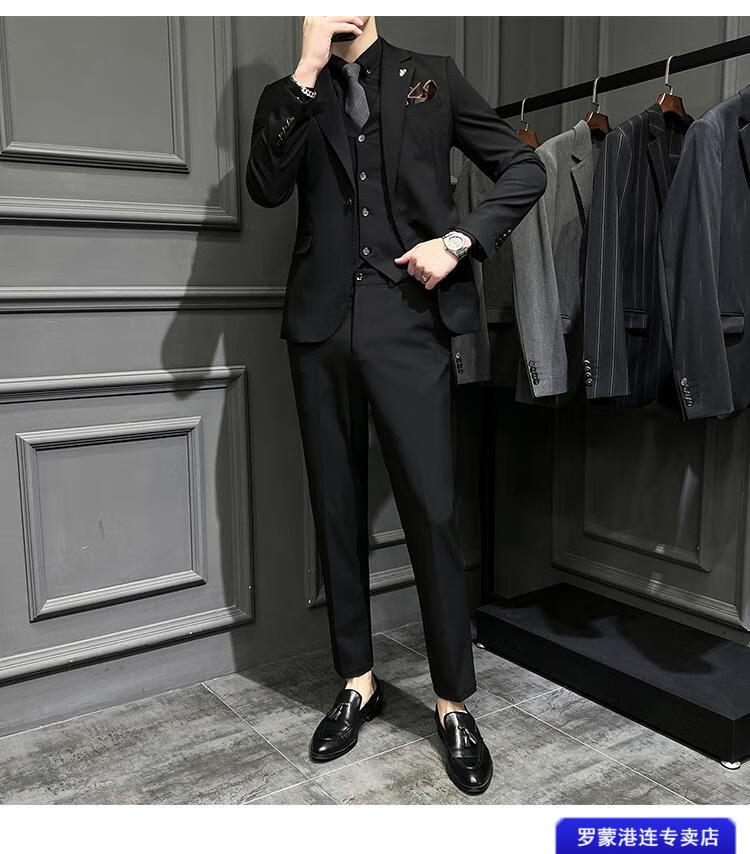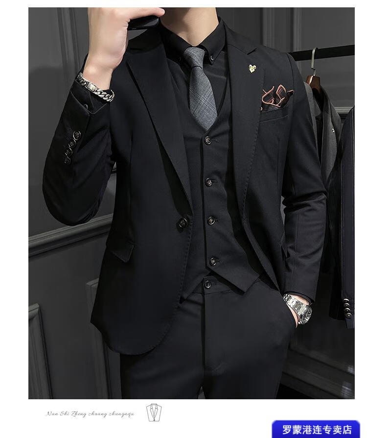 ROMON Groom's Suit Men's Three-piece Complete Set Korean Style Slim Temperament Business Casual Formal Wedding Groomsmen Dress SJT9931 Black 2XL