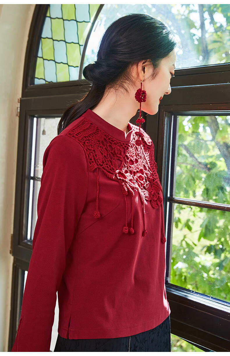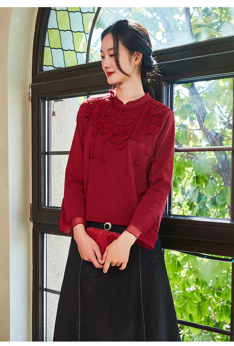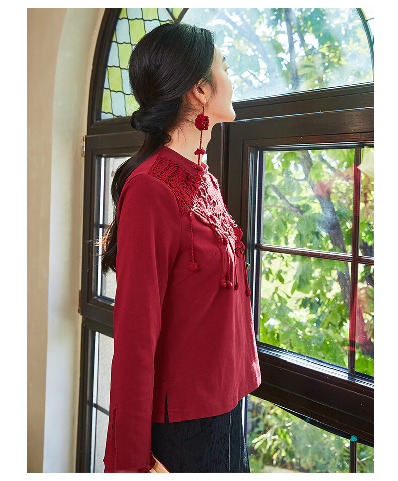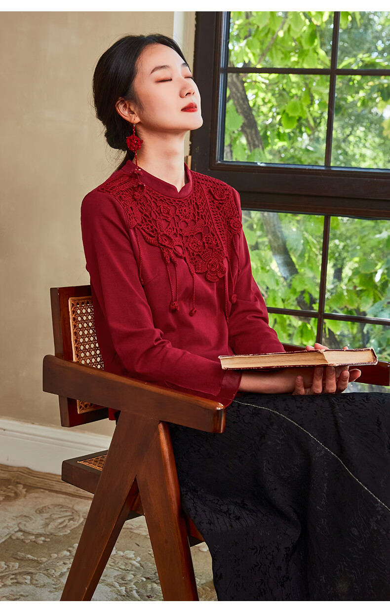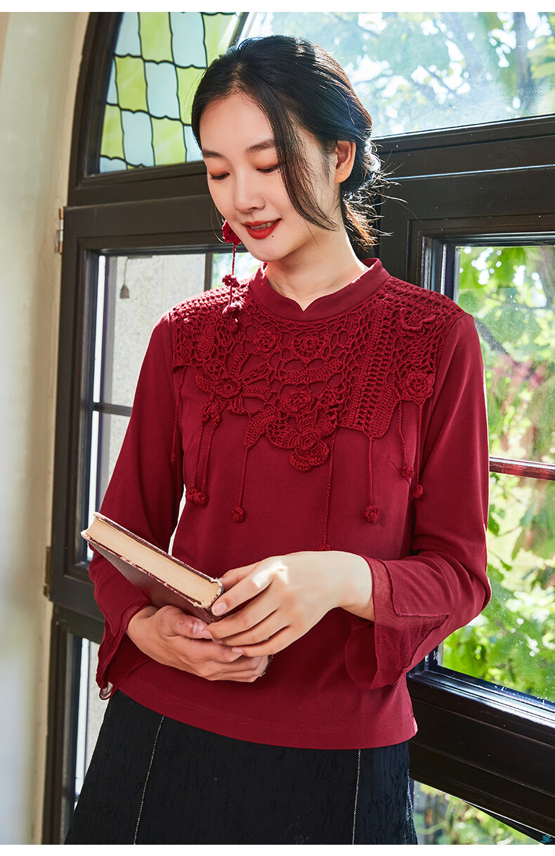 Bufu Bufu autumn new Chinese style long-sleeved red improved cheongsam top for women oriental simple luxury style Zhuying XL