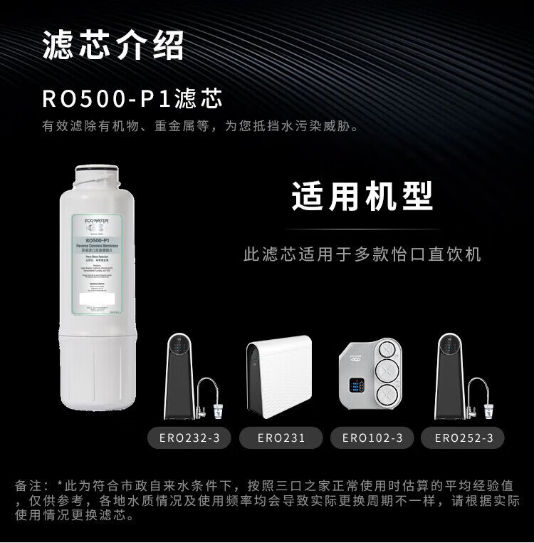 ECOWATER reverse osmosis RO500-P1 filter element is suitable for ERO252/251/232/231-3 models. Please contact customer service for details