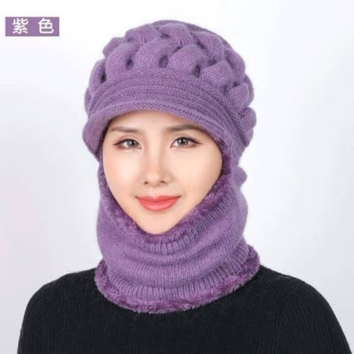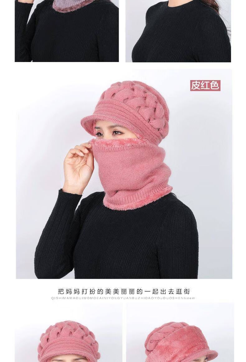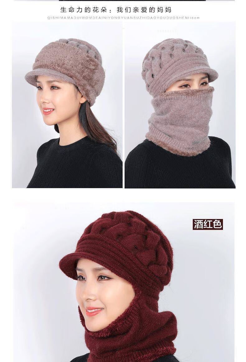 Weilang hat women middle-aged and elderly winter casual thickened woolen hat plus velvet warm scarf mother hat one-piece wine red one size