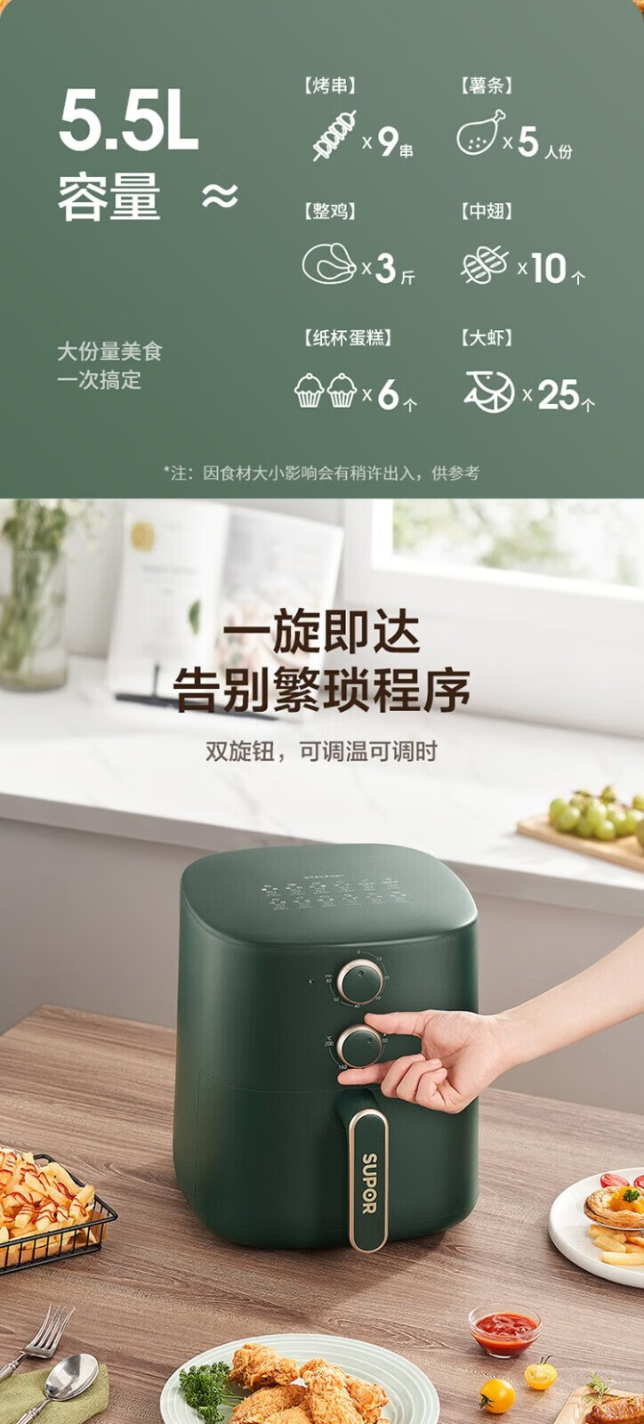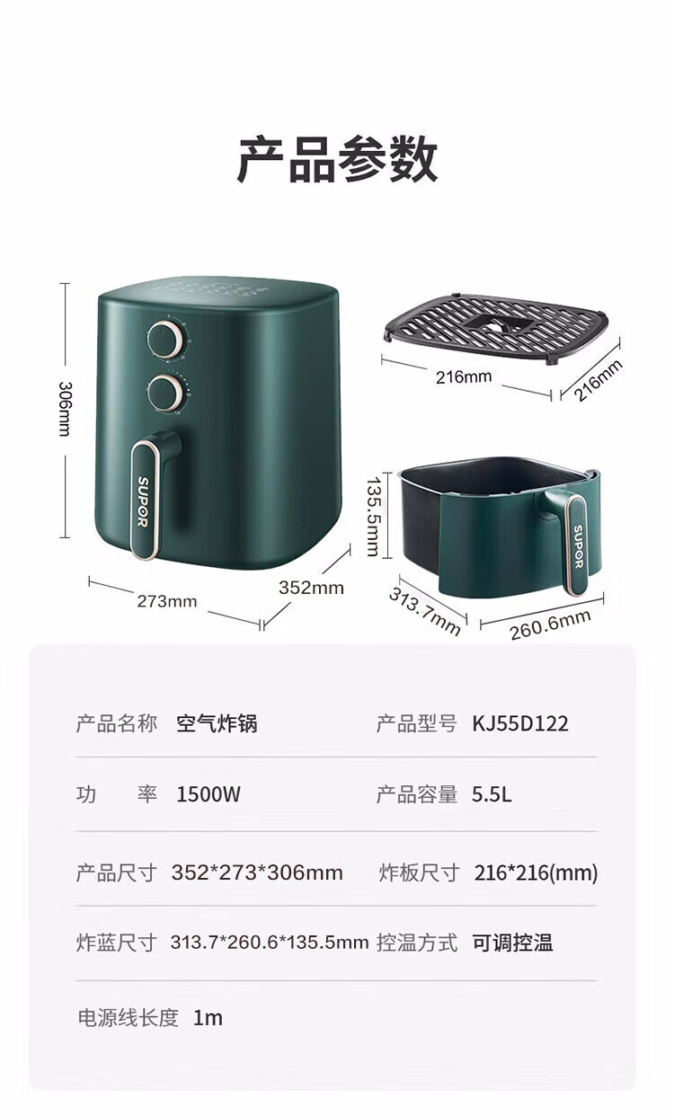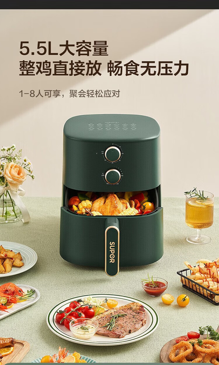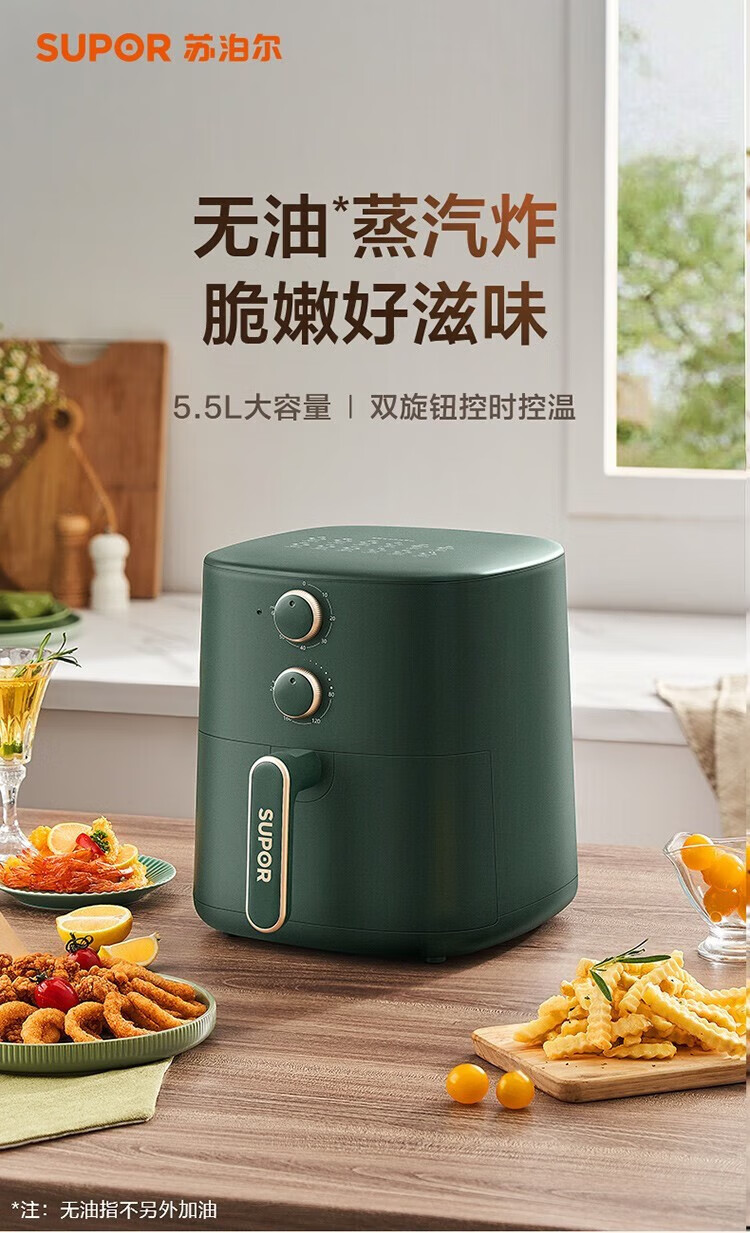 SUPOR household air fryer 5.5L large capacity multi-functional low-fat electric fryer non-stick high-power French fries machine KJ55D122 5.5L