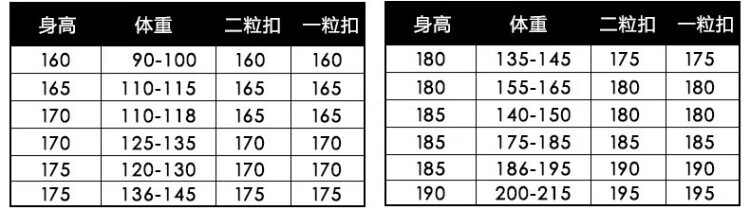 China (cm) 165 / 88-90 170 / 96-98 175 / 108-110 180 / 118-122 185 / 126-130