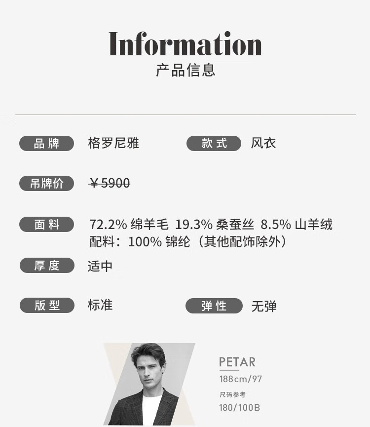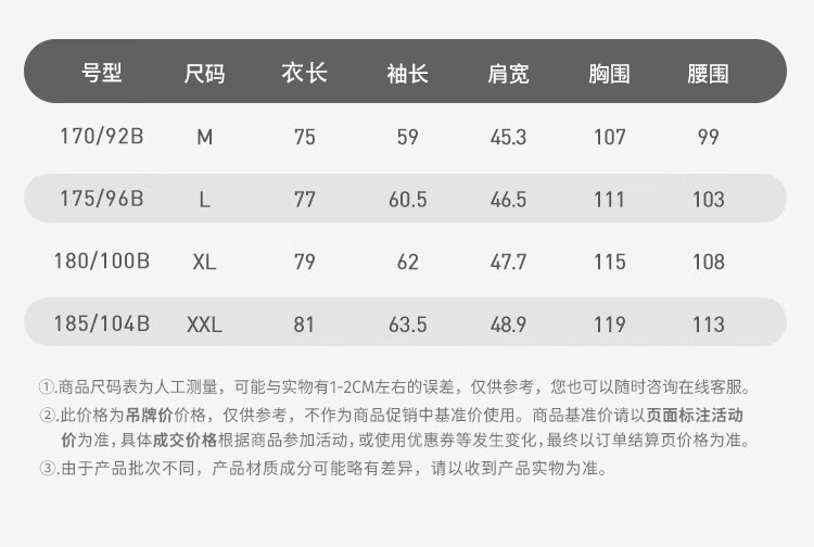 China (cm) 165 / 88-90 170 / 96-98 175 / 108-110 180 / 118-122 185 / 126-130