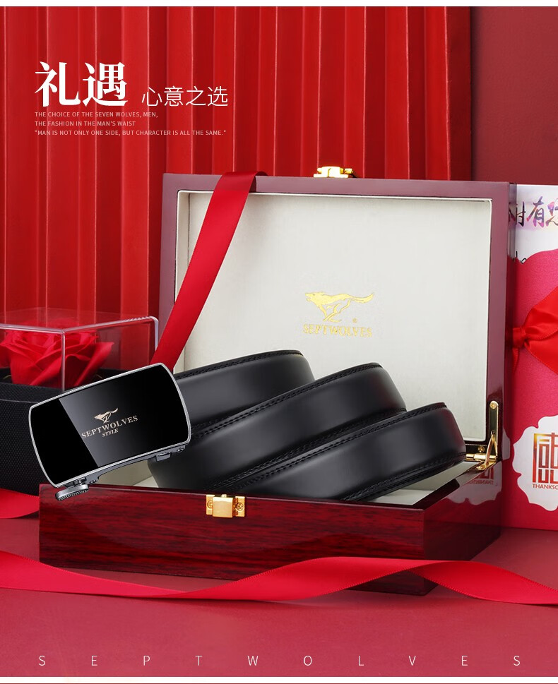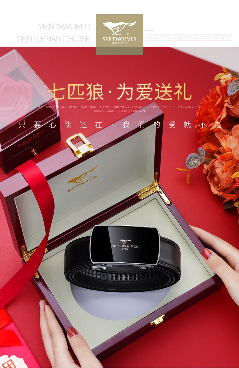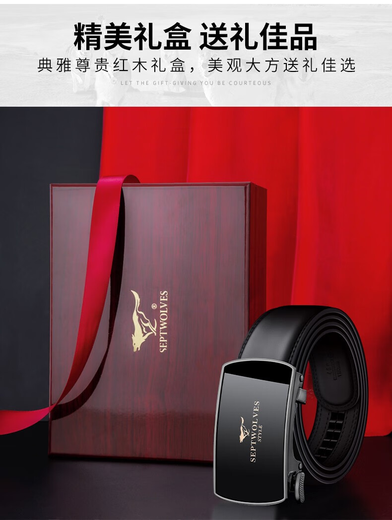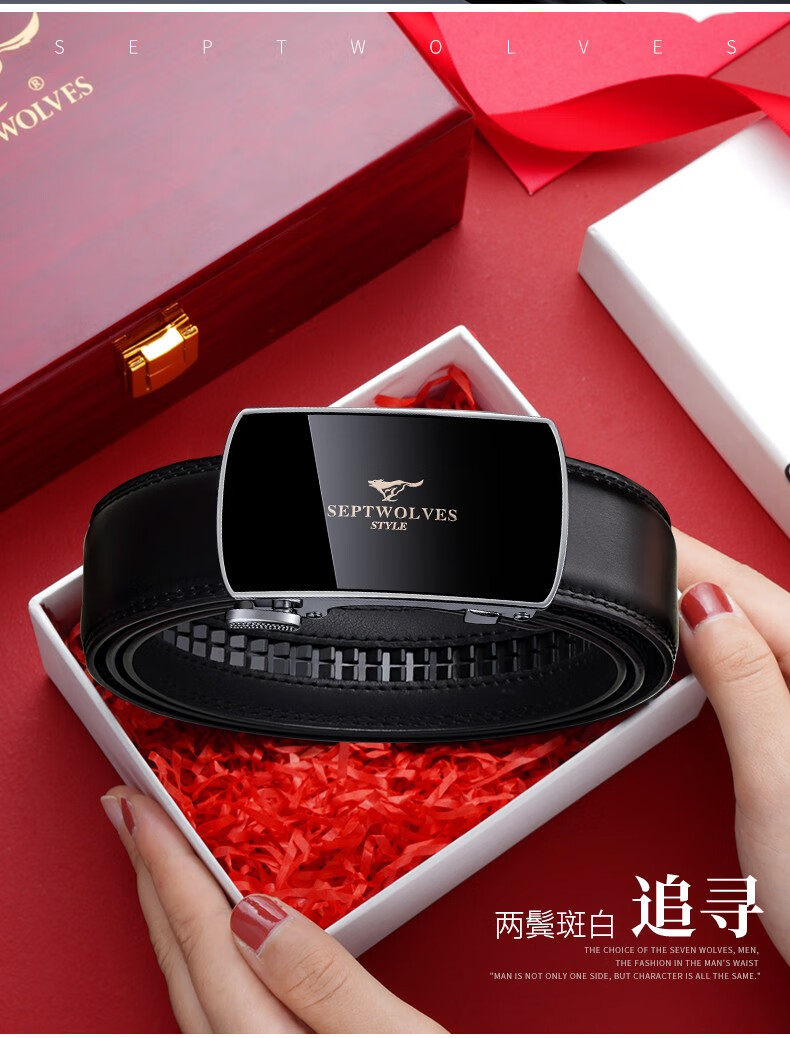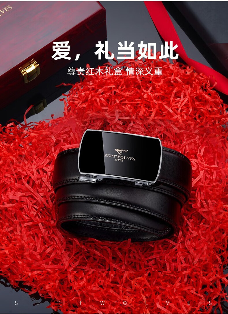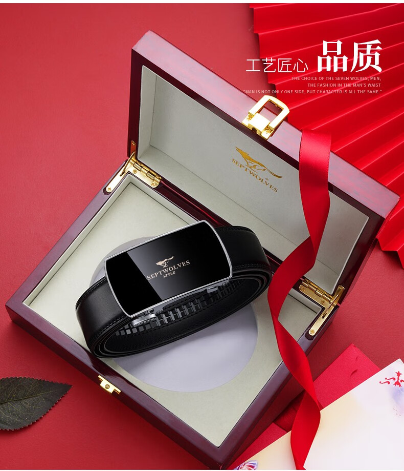 Septwolves Belt Men's Genuine Leather Underwear Belt Cowhide High-end Birthday Chinese Valentine's Day Gift for Boyfriend and Husband Premium Black Style Wooden Gift Box