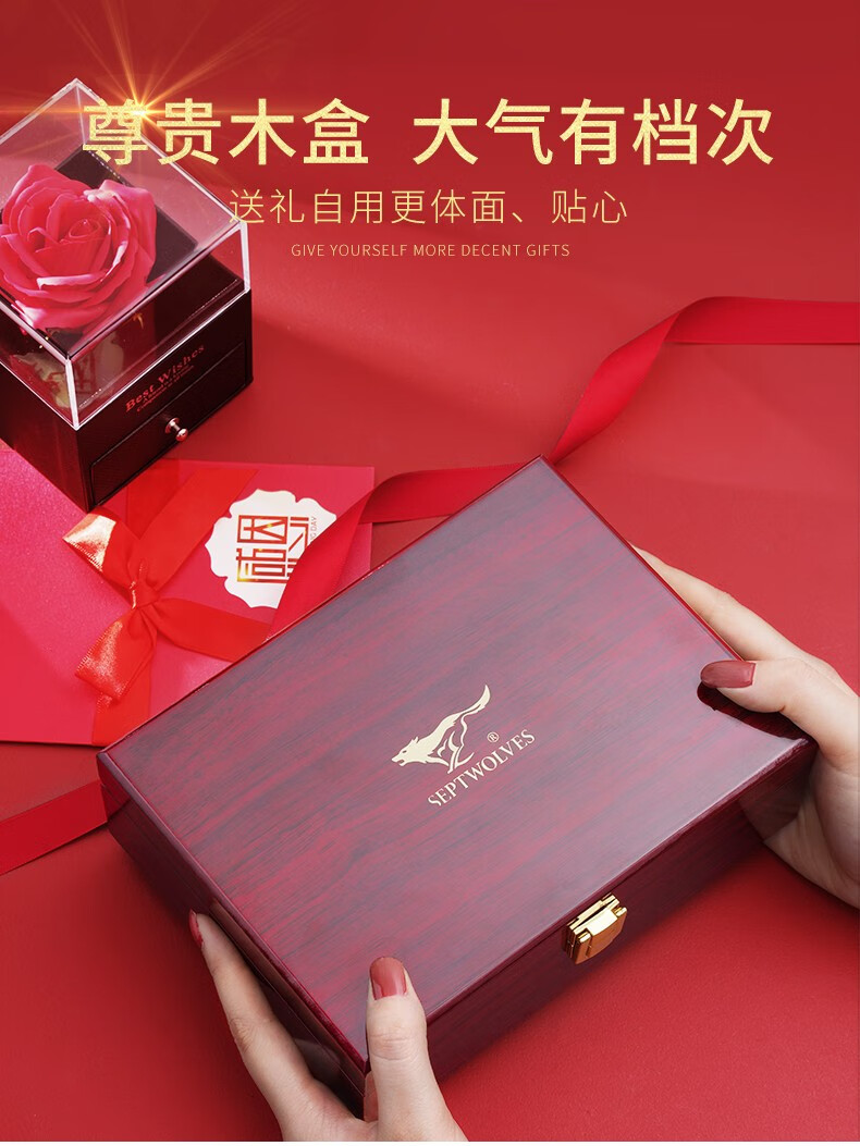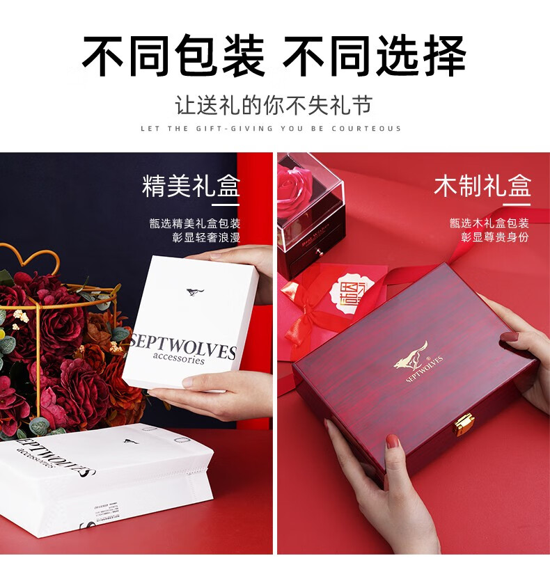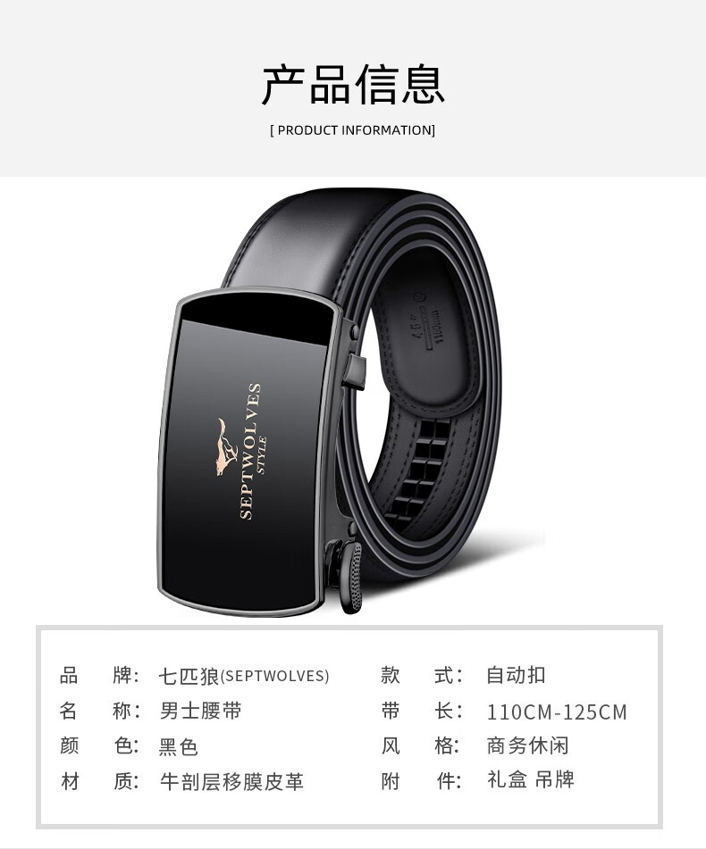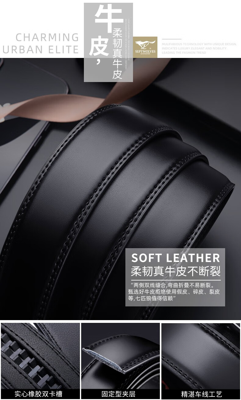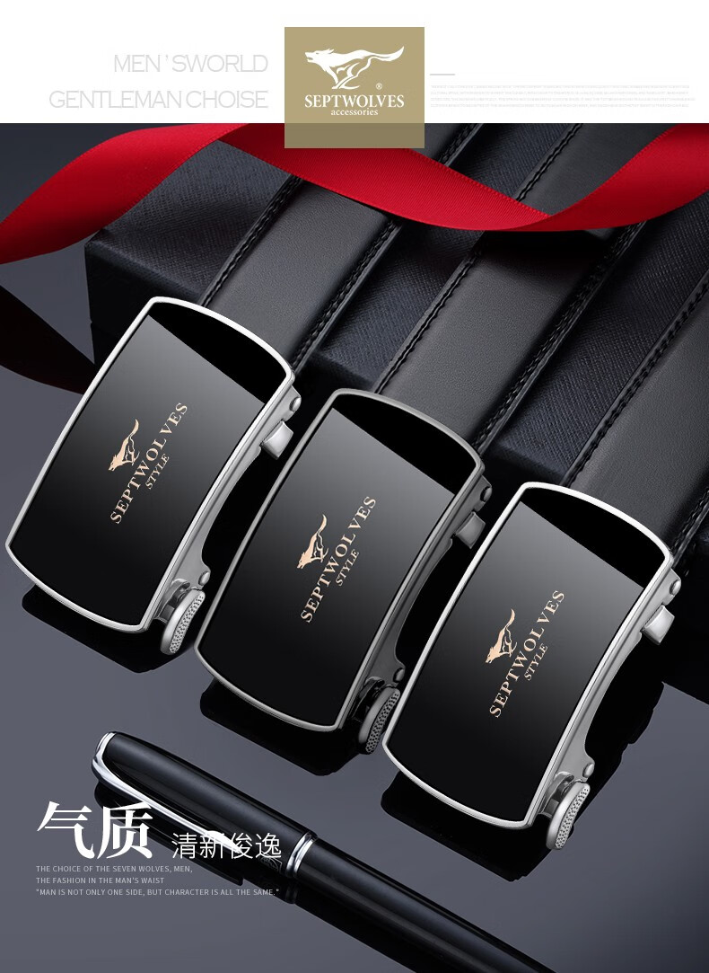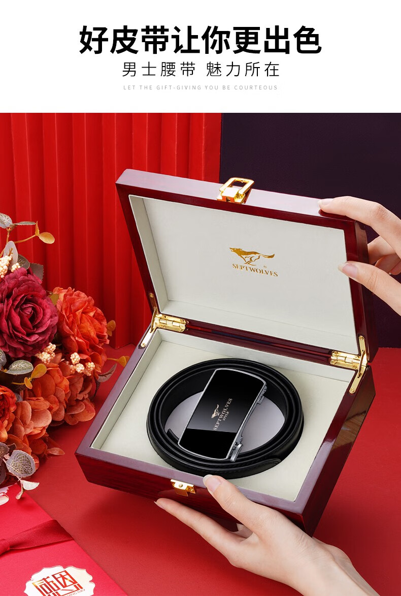 Septwolves Belt Men's Genuine Leather Underwear Belt Cowhide High-end Birthday Chinese Valentine's Day Gift for Boyfriend and Husband Premium Black Style Wooden Gift Box