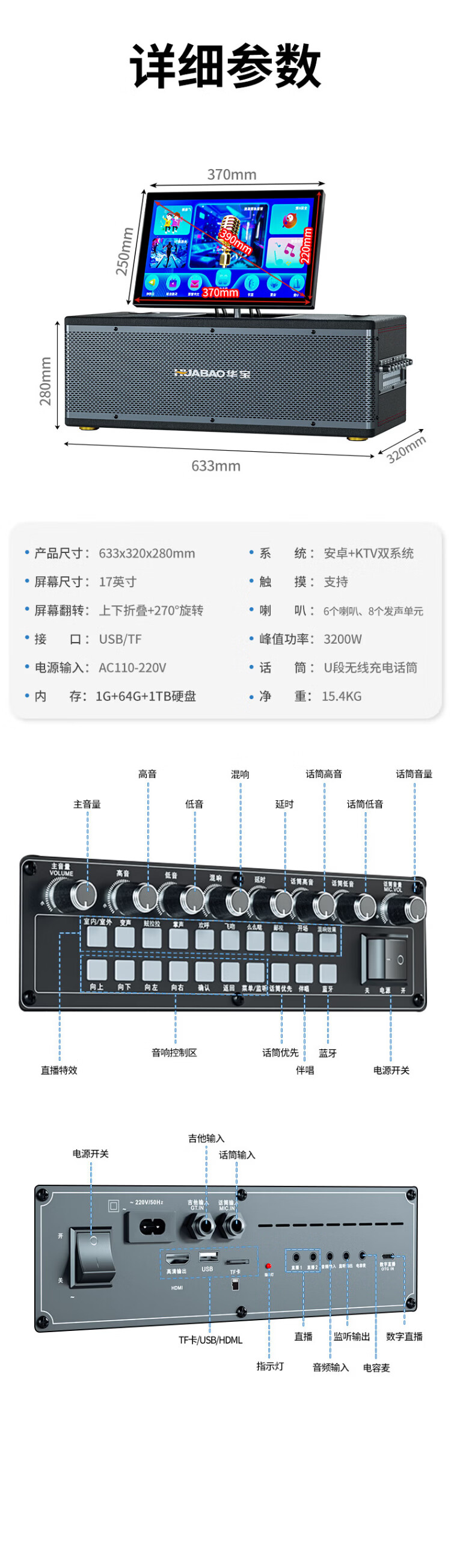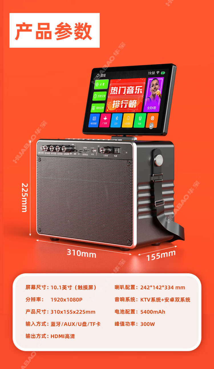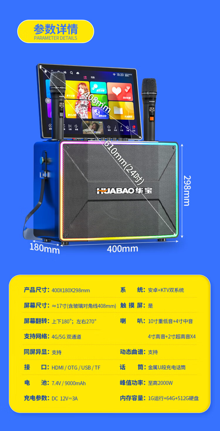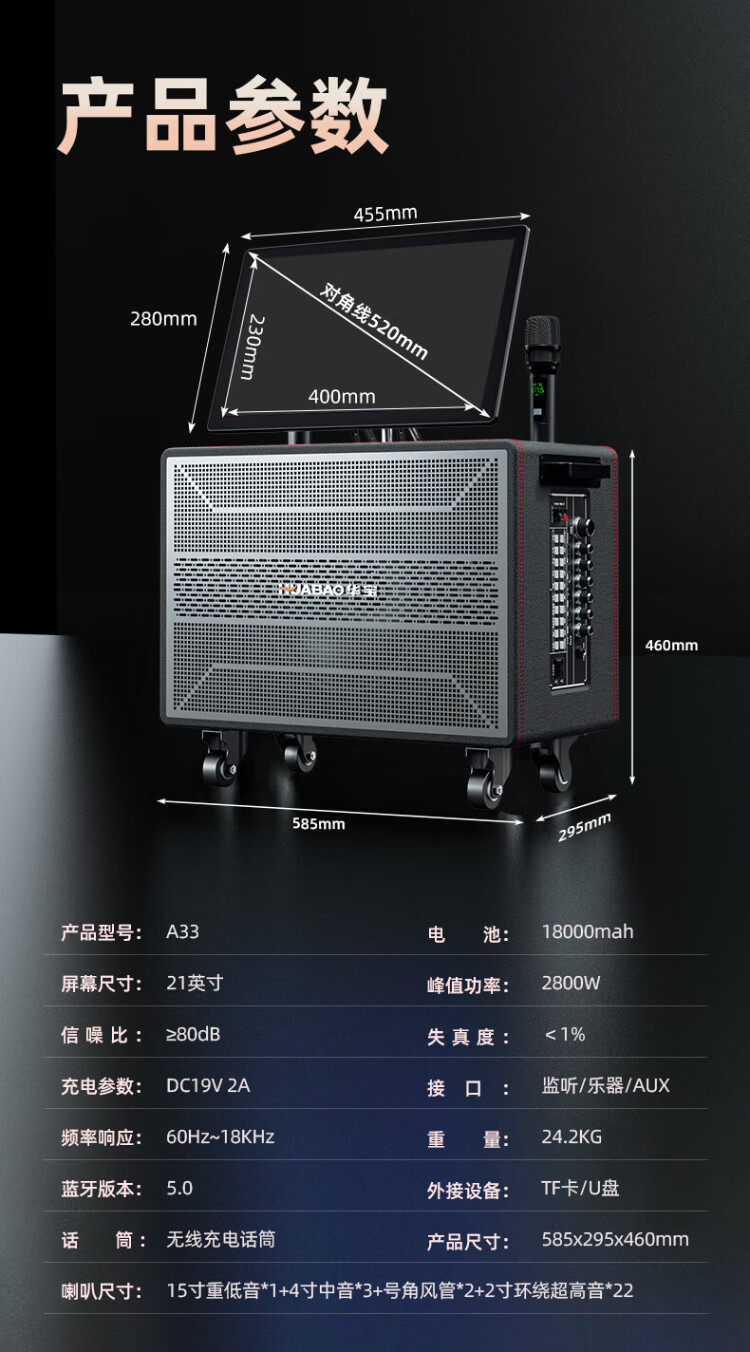 Huabao KTV audio and video all-in-one machine outdoor K song square dance portable network touch screen karaoke machine home karaoke with screen speaker trolley audio video trolley speaker A27 LCD screen Bluetooth version dual microphone