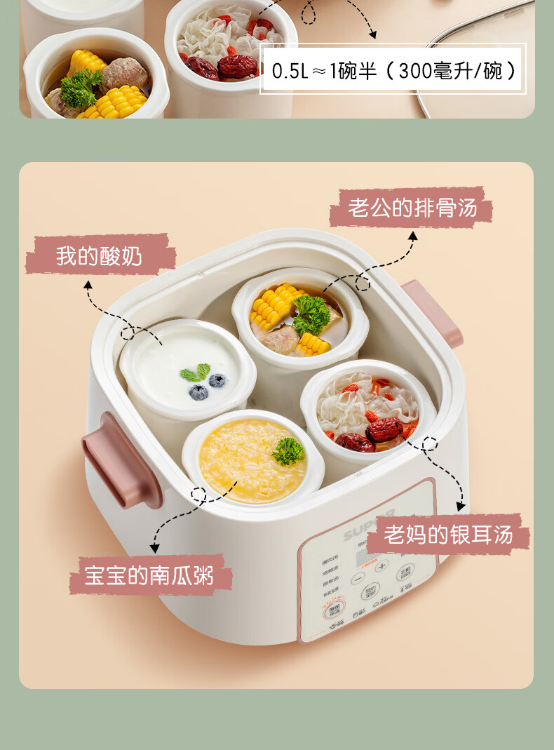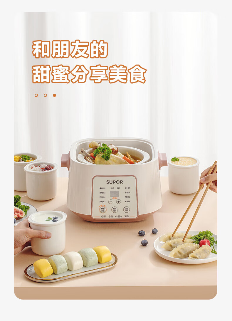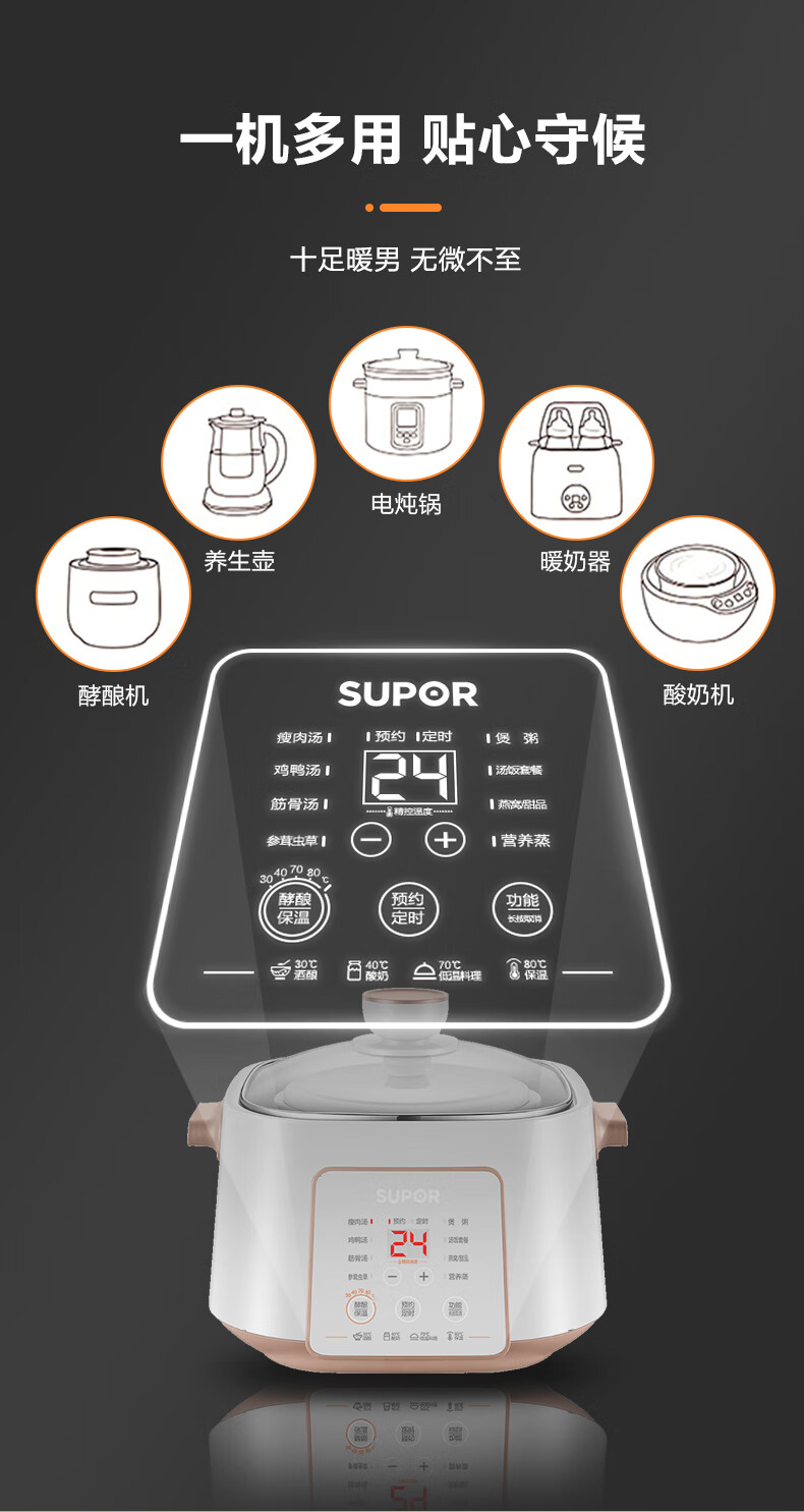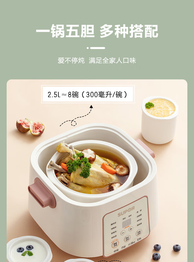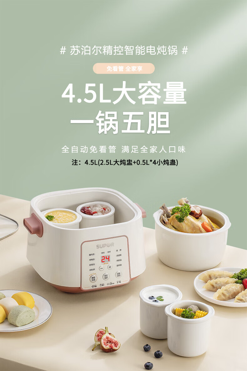 SUPOR electric stew pot, water-proof stew pot, household use for 3-4 people, large capacity soup pot, stew pot, electric stew pot, 5 gallbladders in one pot, porridge cooker, food supplement pot, electric steamer, multifunctional, 4.5L white ceramic inner pot, 2.5L+0.5L*4 2.5L