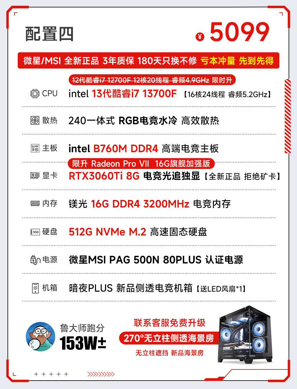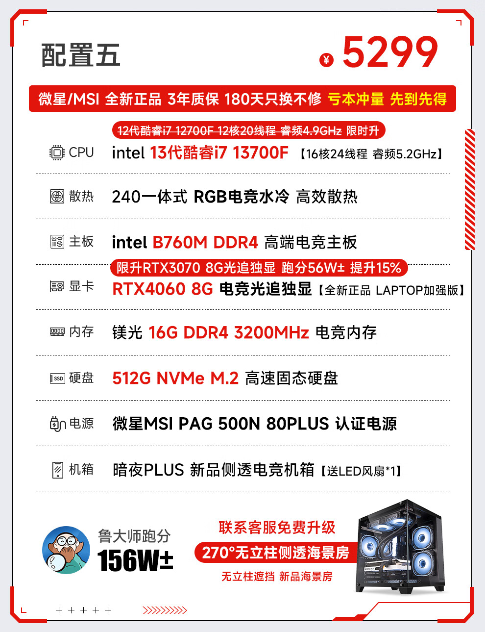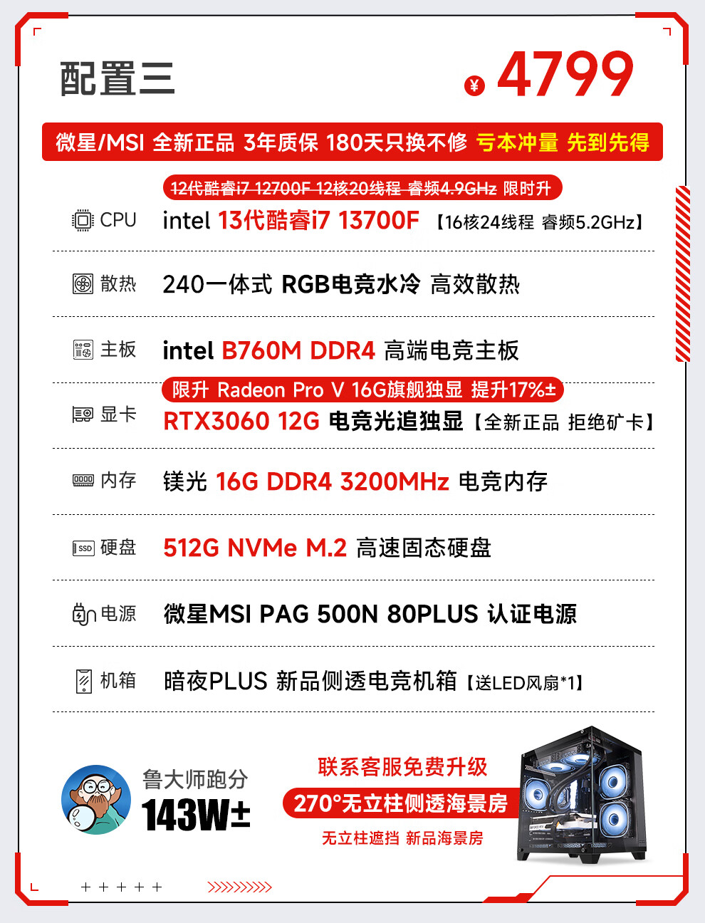 MSI 13th generation i7 13700F/RTX5060/4060/3060 desktop computer host e-sports game live broadcast design rendering DIY assembly machine complete machine configuration 2 i7 13700F+RTX2070 8G