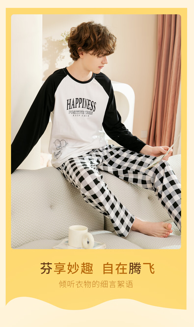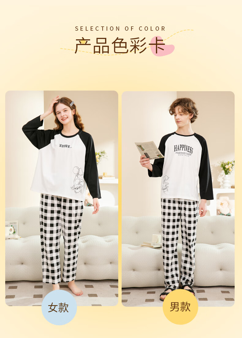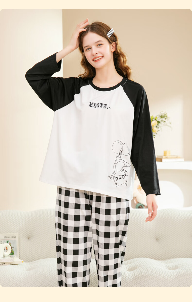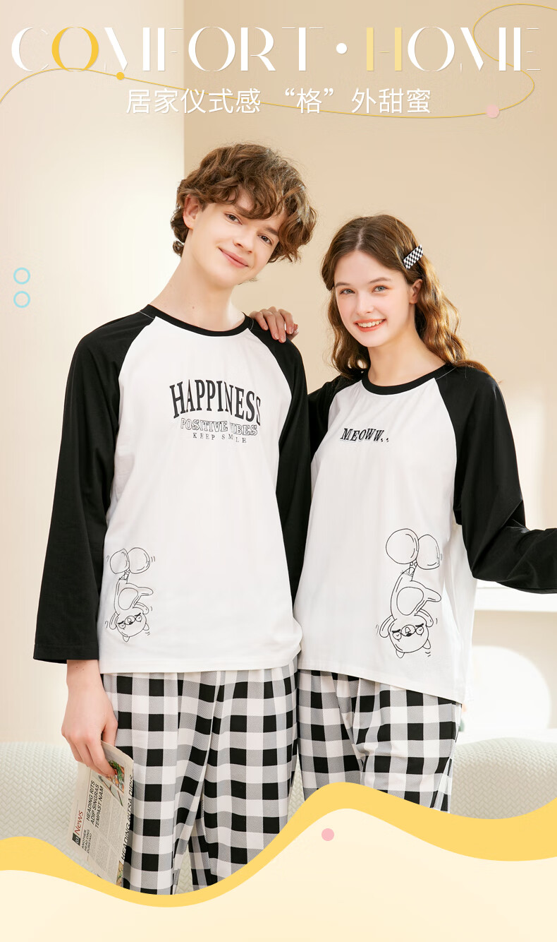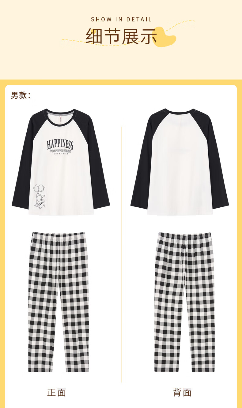 Fenton Couple Cotton Pajamas Women's New Round Neck Wearable Long Sleeve Home Clothes Set Elegant White (Male) L
