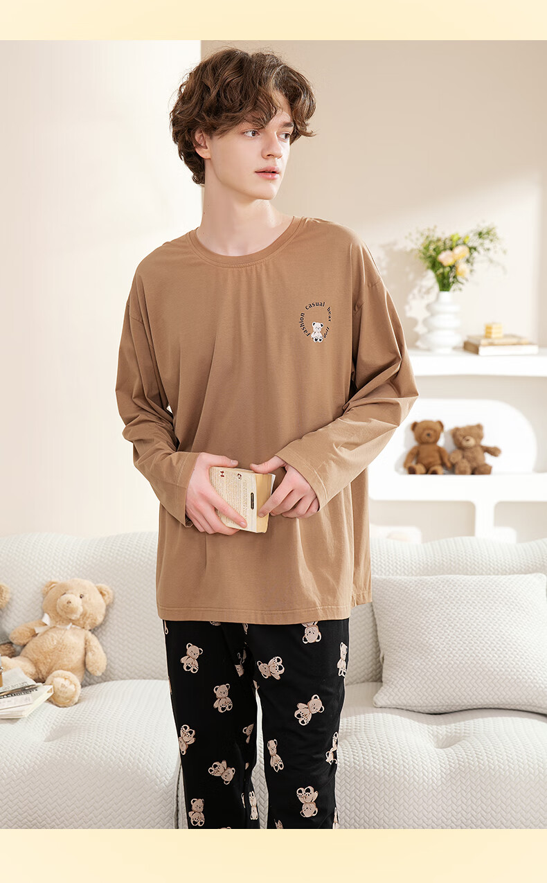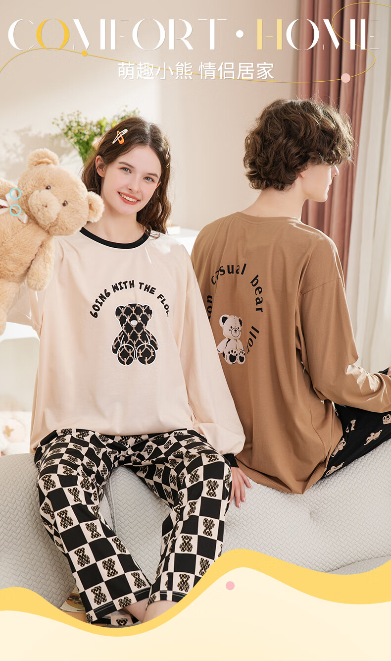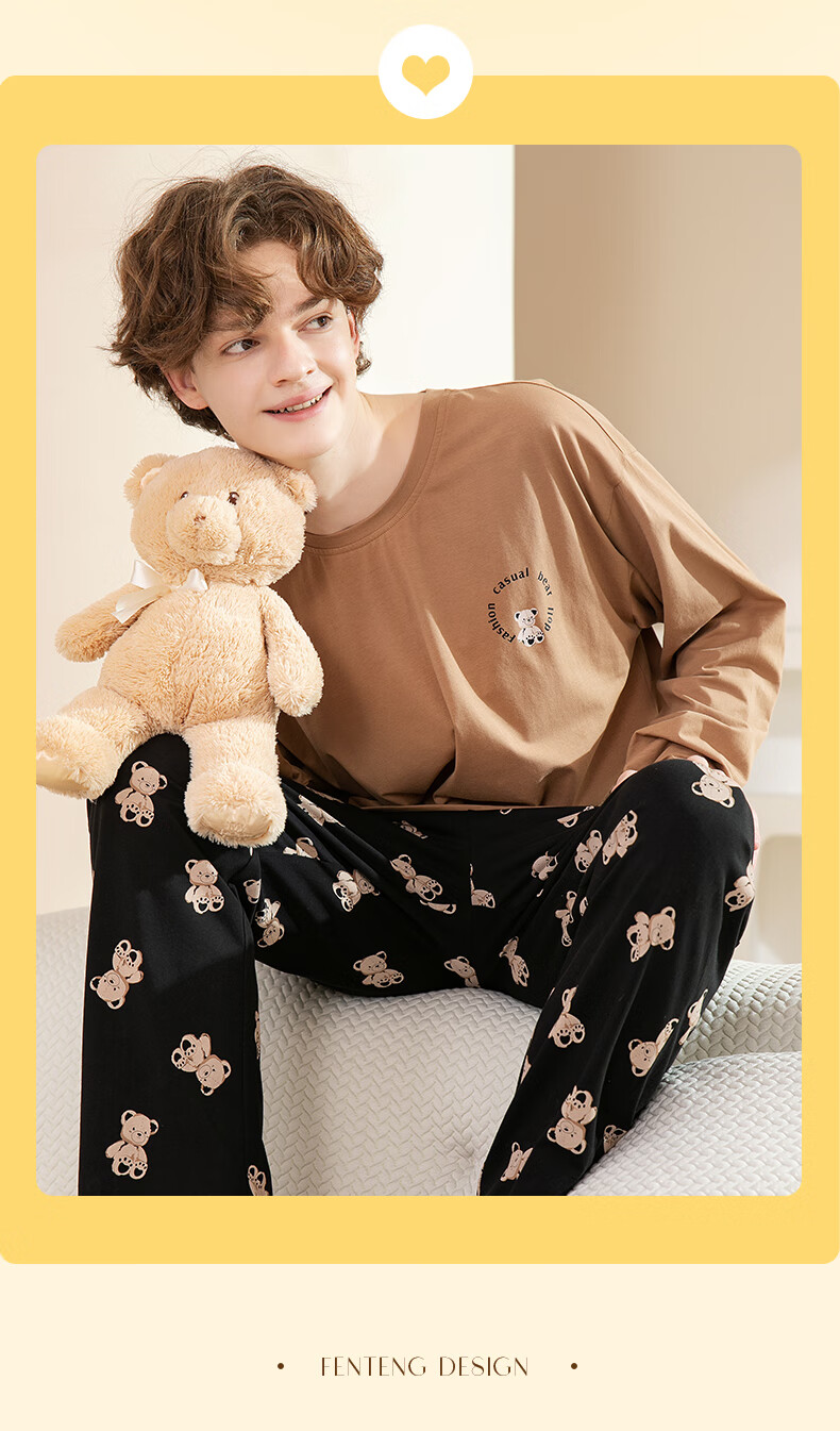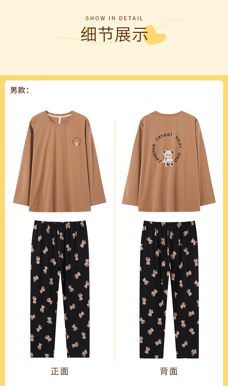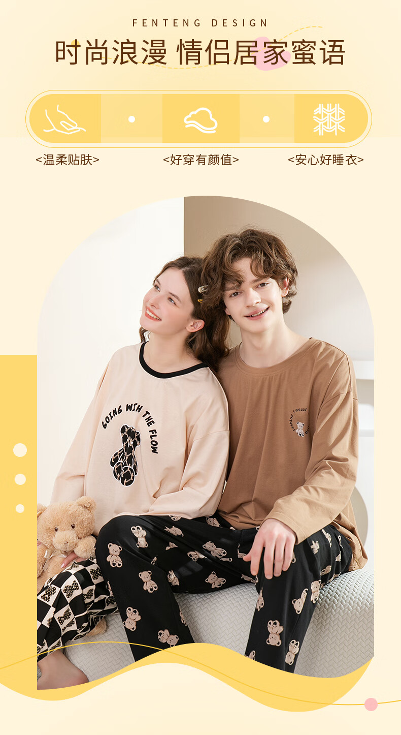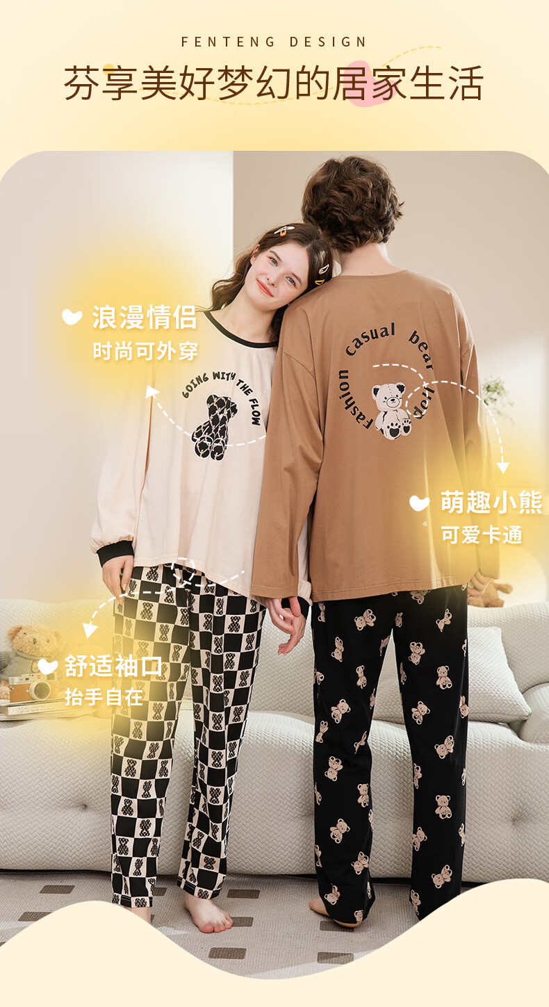 Fenton Couple Cotton Pajamas Women's New Breathable Fashionable Round Neck Can Be Weared Outside Men's Home Clothing Suit Khaki (Male) L