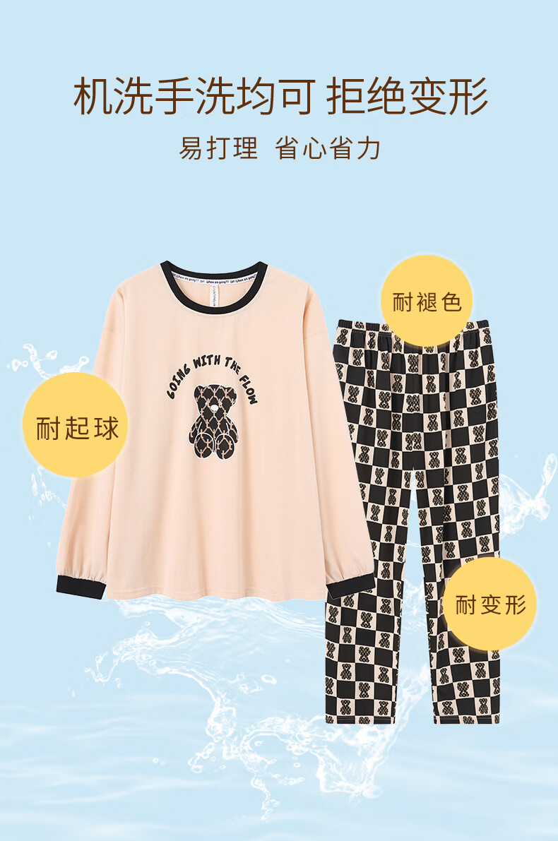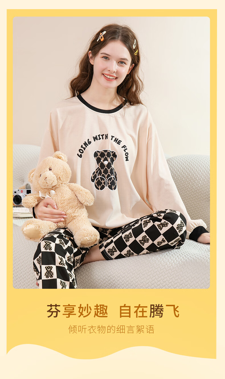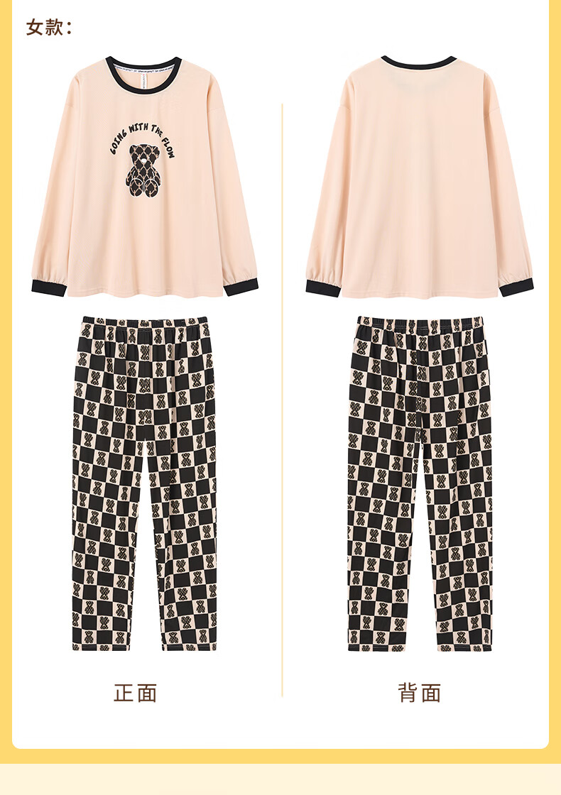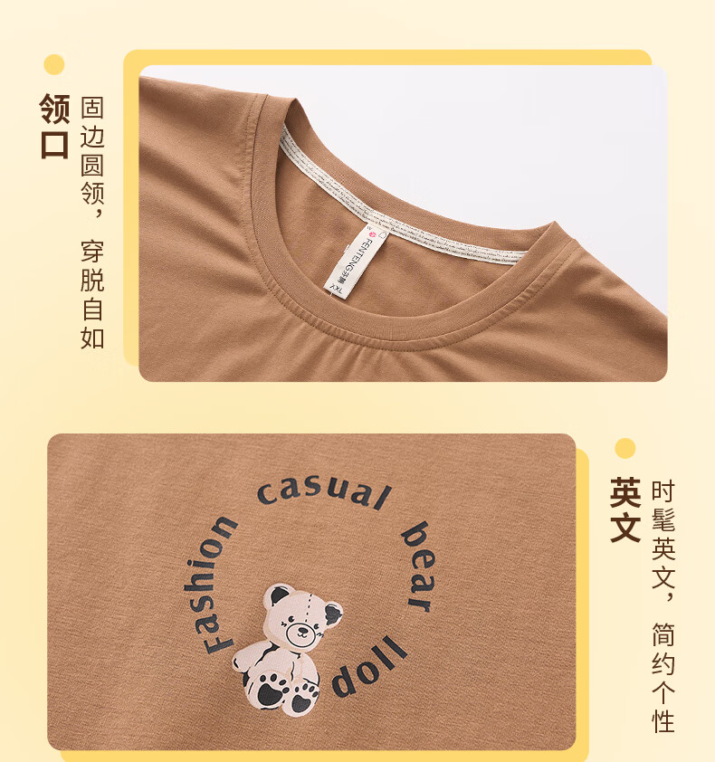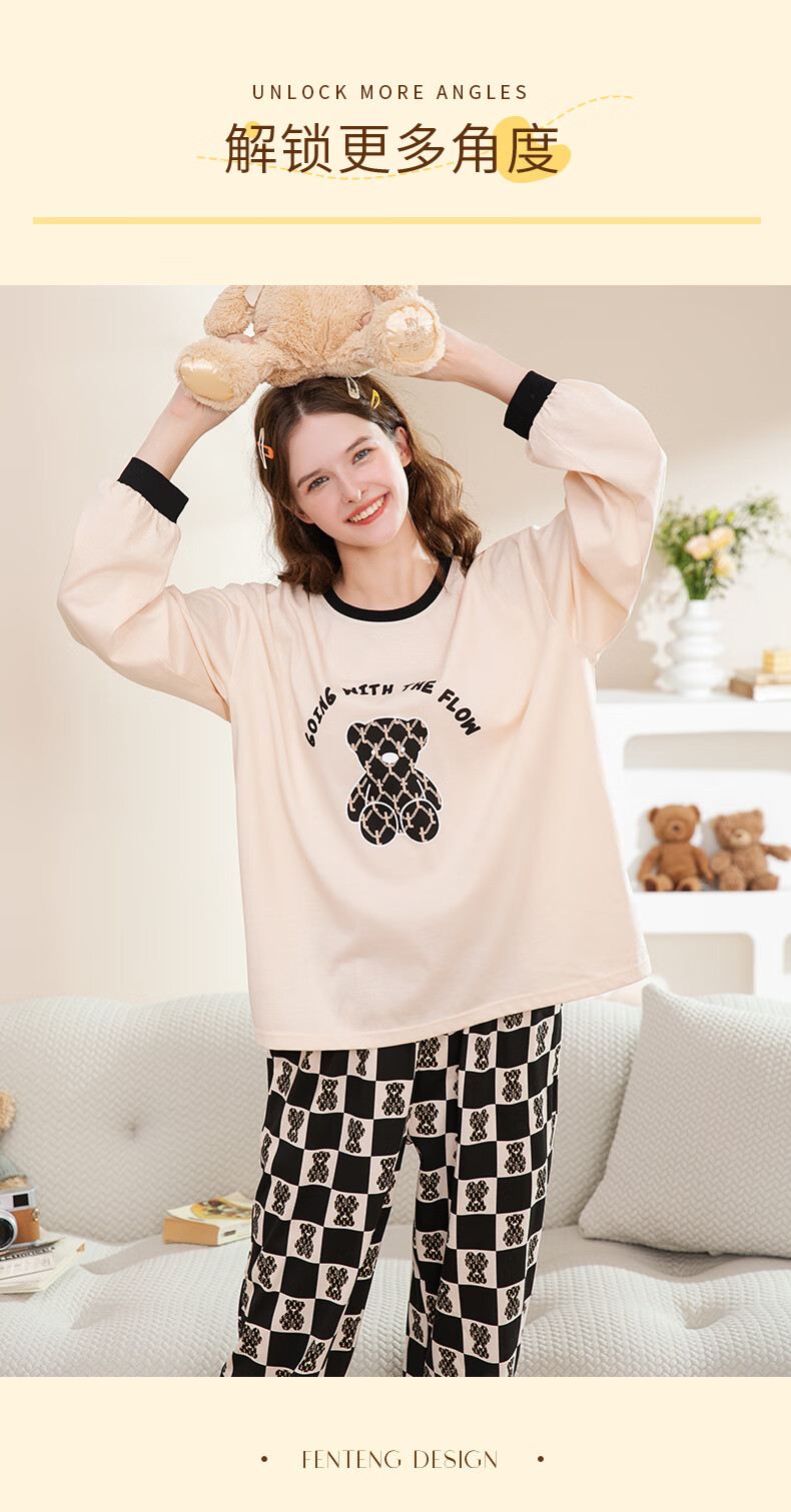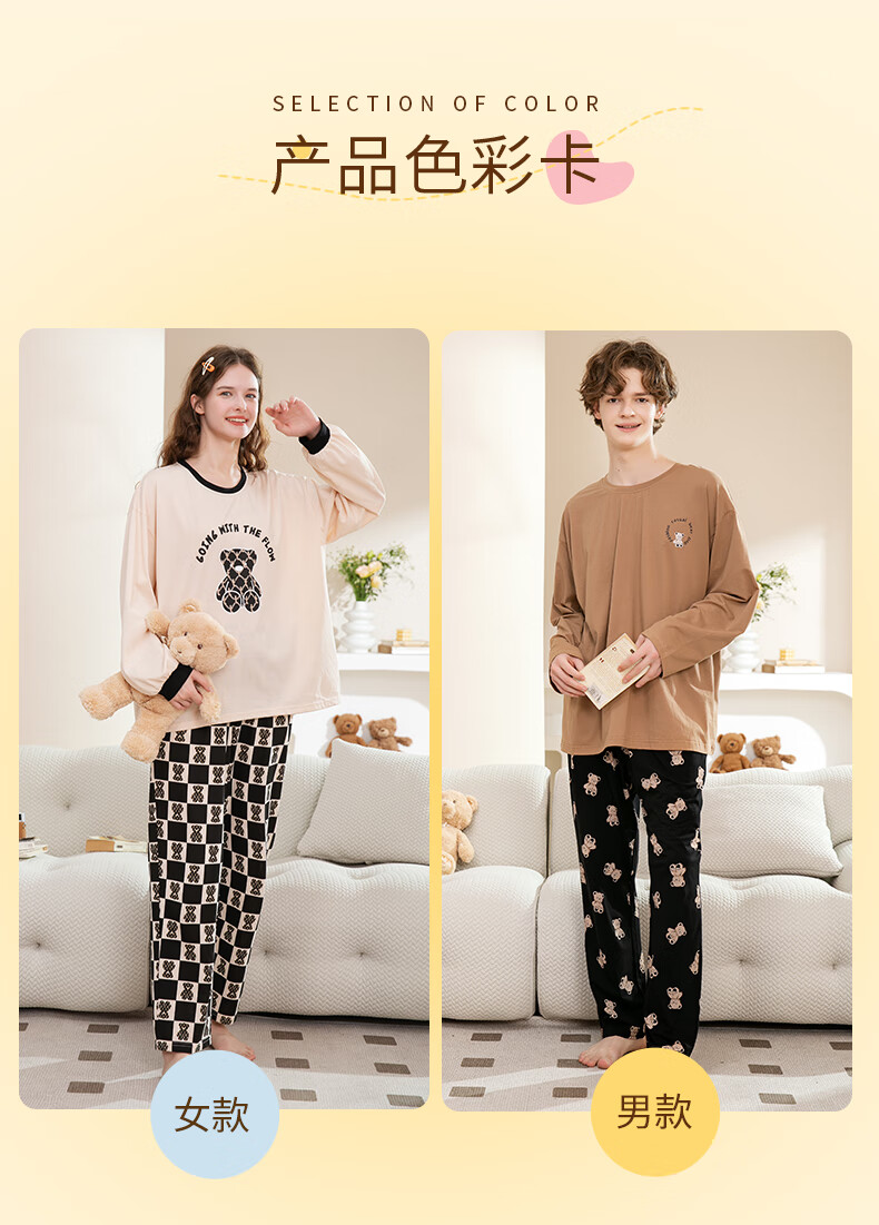 Fenton Couple Cotton Pajamas Women's New Breathable Fashionable Round Neck Can Be Weared Outside Men's Home Clothing Suit Khaki (Male) L