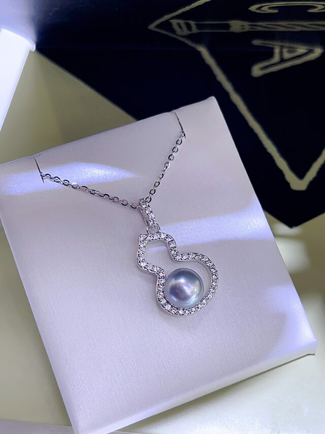 Shining Phoenix Fulu style silver gray blue pearl pendant, perfect round cold light 925 silver inlay, clavicle chain necklace for women, gray 7.5-8mm